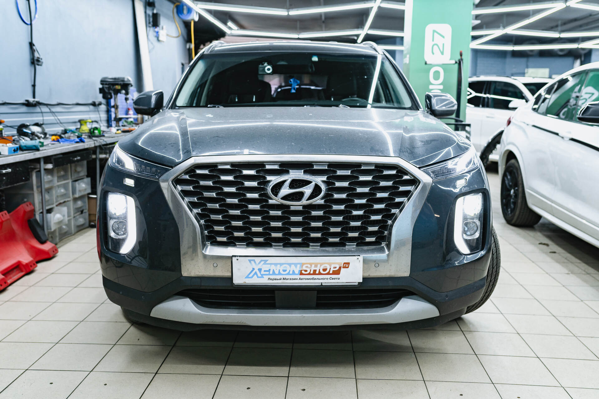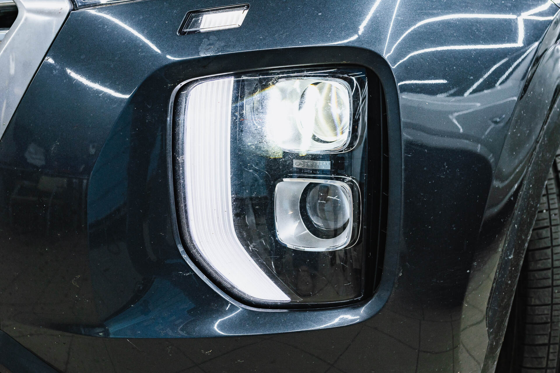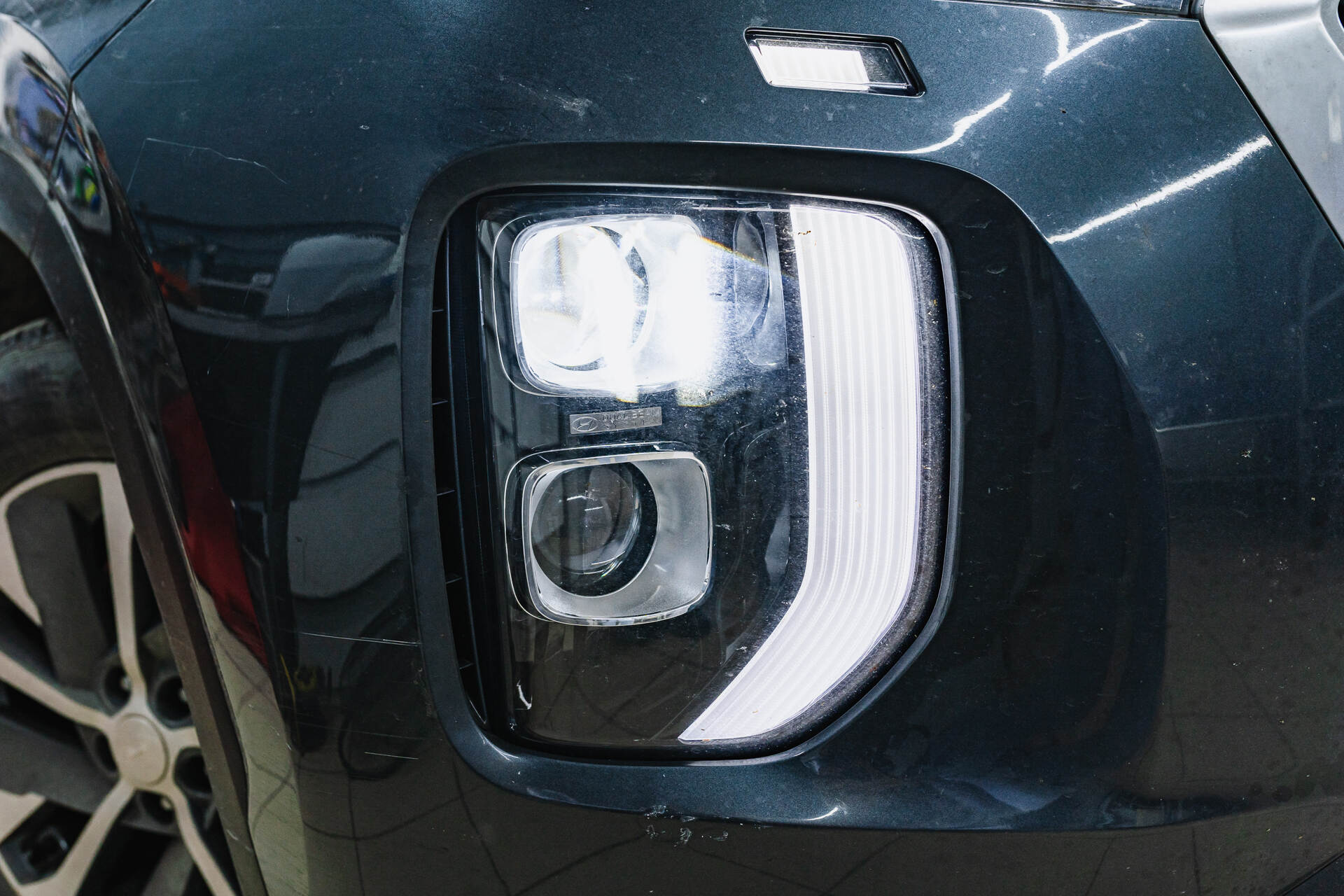 Полируем стекла фар и наносим на них защитную пленку.Взгляните на итоговые фотографии: как видно, автомобиль Hyundai Palisade с четырьмя линзами Vision Tri-led Ultimate Series 5500K получил поистине огромное количество света, сохраняя при этом чистый белый оттенок без посторонних примесей синевы или желтизны. Мощный свет фар не только значительно повышает комфорт и безопасность ночных поездок, но и придает автомобилю особый стиль, создавая выразительный контраст с темным кузовом. Важно отметить, что низкая боковая засветка новых линз не будет слепить встречных автомобилистов, напротив, яркий головной свет значительно увеличивает безопасность поездок в темное время суток.