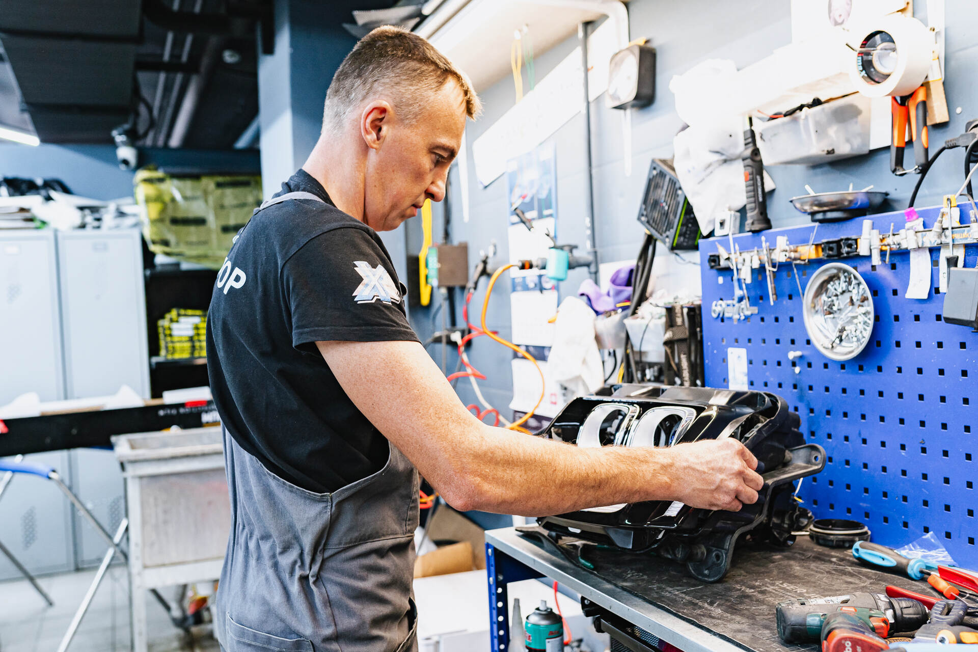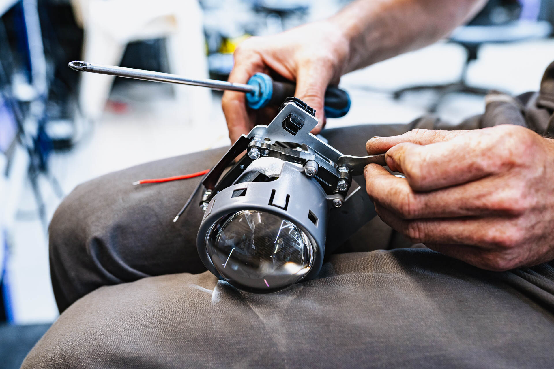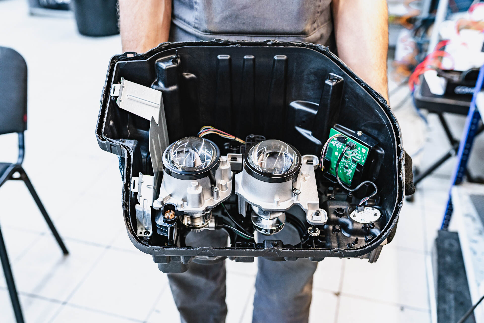 Разбираем фары. Устанавливаем новые линзы в фары.Для замены линз в фарах Хендай Палисад требуется демонтировать переднюю часть автомобиля. Мы снимаем бампер, затем обе фары и отправляем их на разборку. После этого извлекаются штатные линзы ближнего и дальнего света, на место которых монтируются новые светодиодные модули Vision Tri-led Ultimate Series 5500K. Для установки используются специальные переходные рамки, что позволяет обойтись без кардинальной доработки штатных посадочных мест — вся замена происходит максимально приближенно к заводскому исполнению. В процессе работы мы также тщательно очищаем внутренние поверхности стекол фар щелочным раствором, поскольку загрязнения образуются не только снаружи – это повышает светопропускание, позволяя новым линзам работать без потерь яркости и искажений светового пучка.