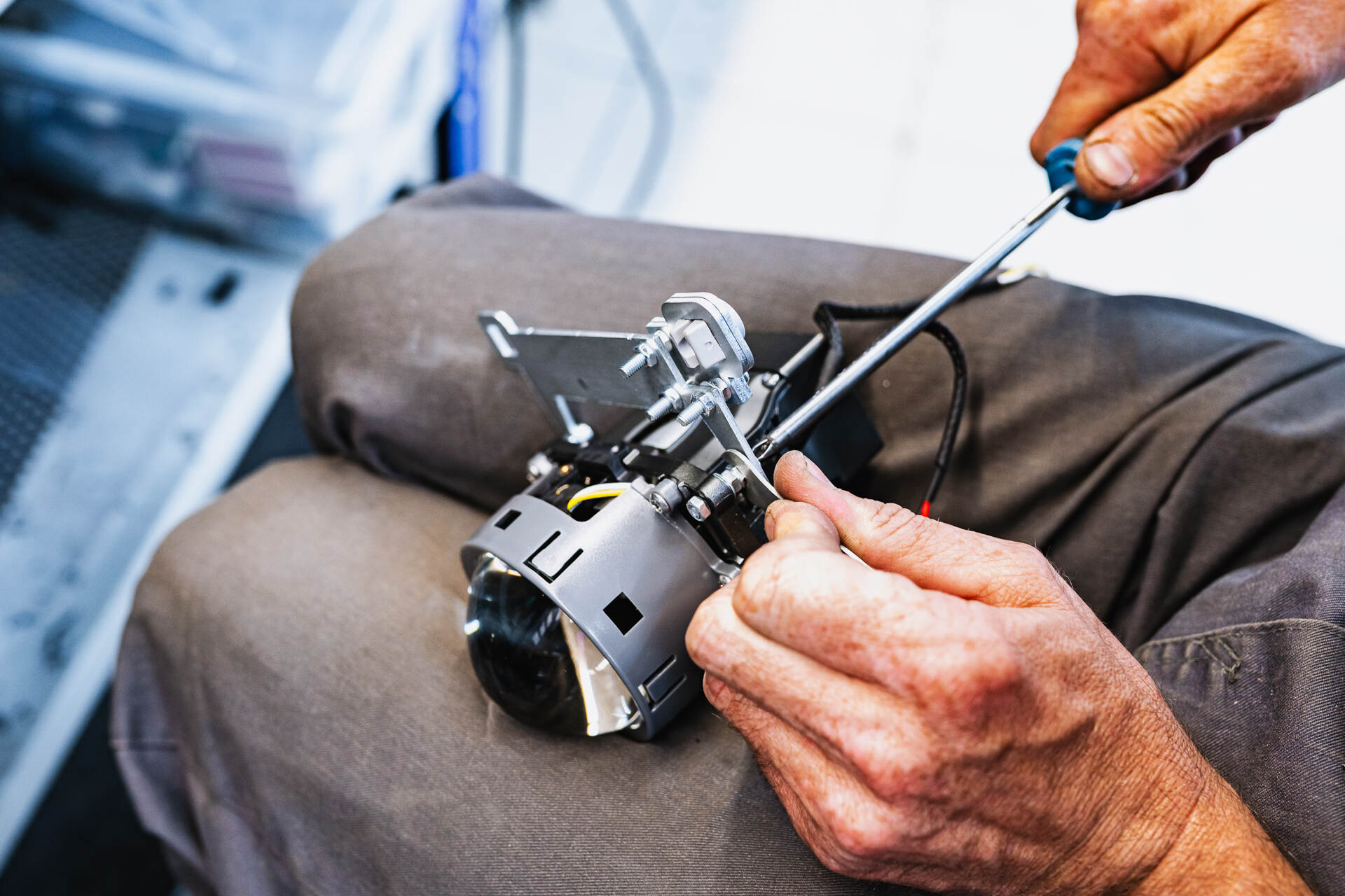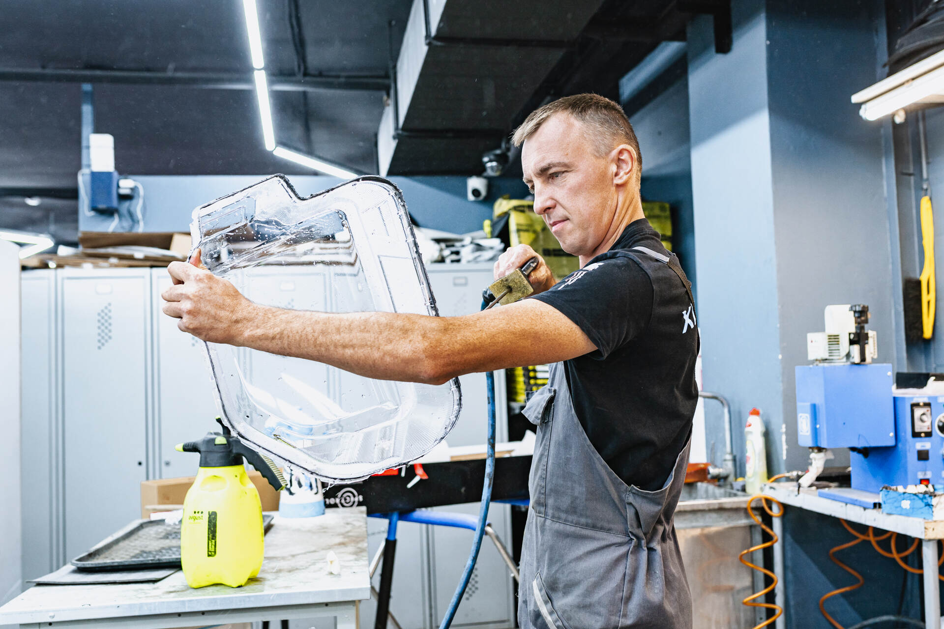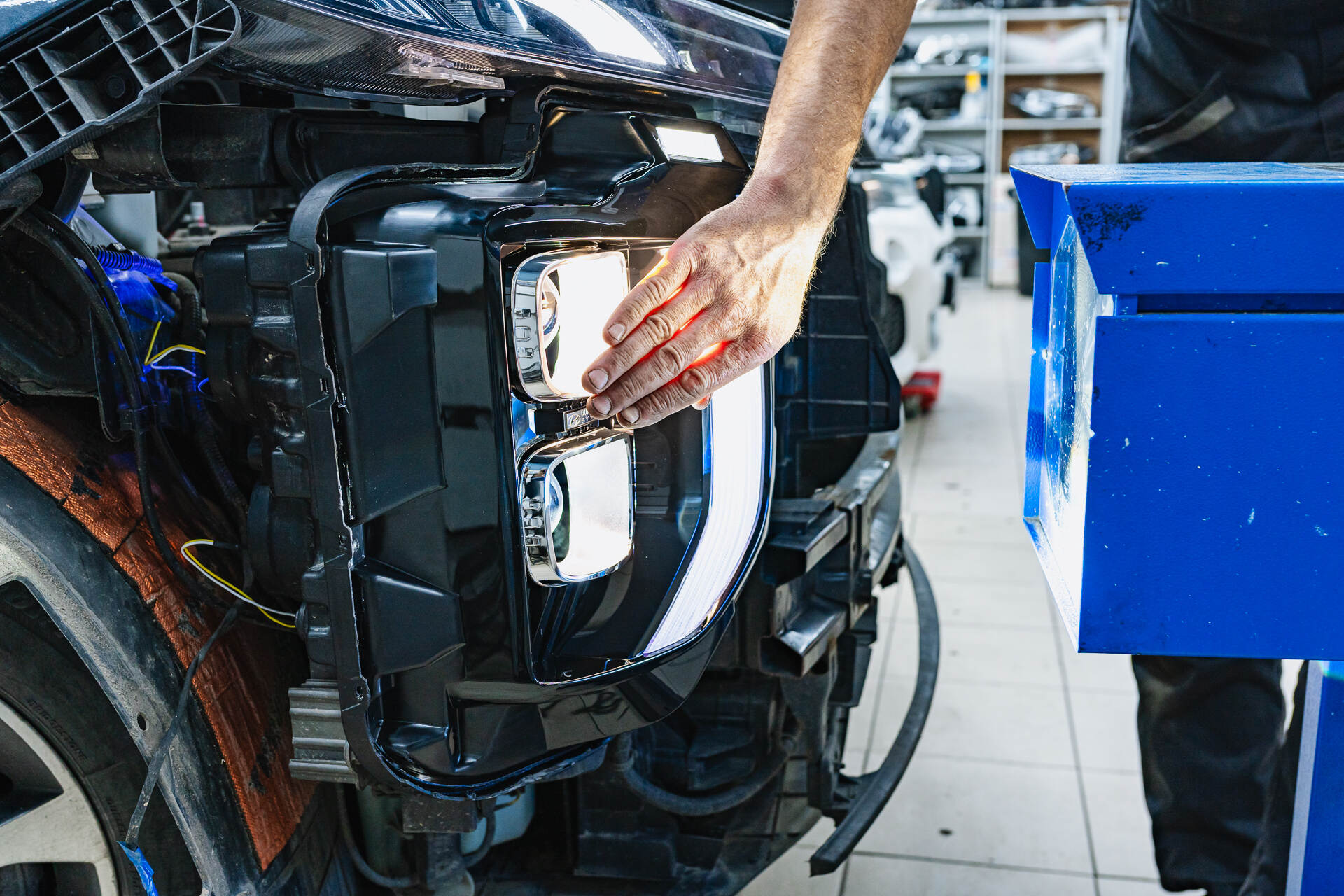 Примеряем фары с новыми линзами до герметизации. Герметизируем фары.Перед окончательной герметизацией мы устанавливаем фары с новыми линзами на Hyundai Palisade для точной настройки положения модулей Vision Tri-led Ultimate Series 5500K и примерки декоративных масок. После этого фары снимаются снова и проходят процедуру герметизации с применением термостойкого бутилового герметика, а когда герметик полностью полимеризуется, фары возвращаются окончательно на автомобиль, где мы полируем их внешние стекла до кристального блеска, удаляя большую часть мелких царапин и следов абразивного износа. Завершающим этапом становится профессиональная регулировка головного света с помощью оптического прибора, позволяющая добиться четкой и ровной светотеневой границы. Дополнительно забронируем отполированные фары полиуретановой плёнкой для их защиты.