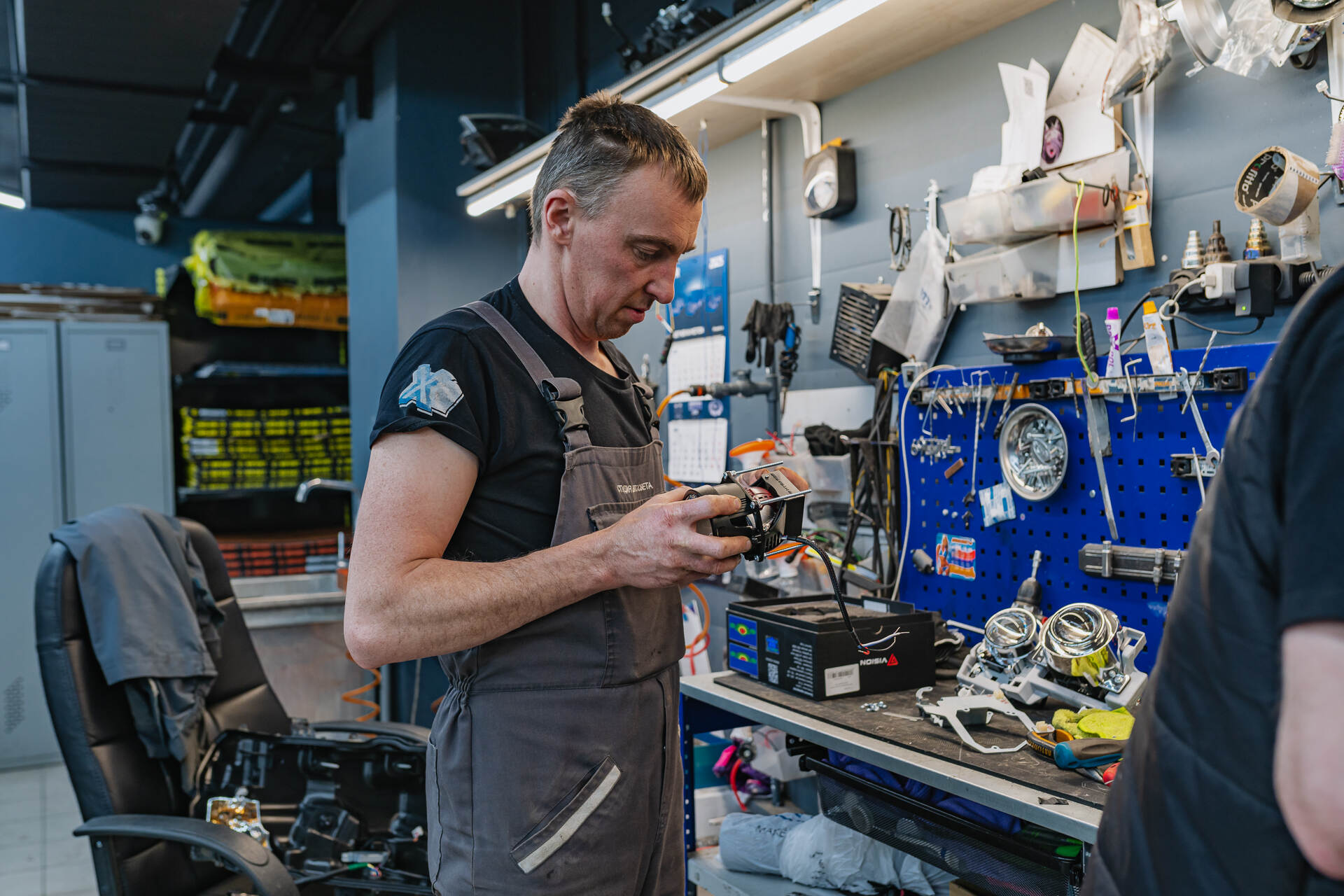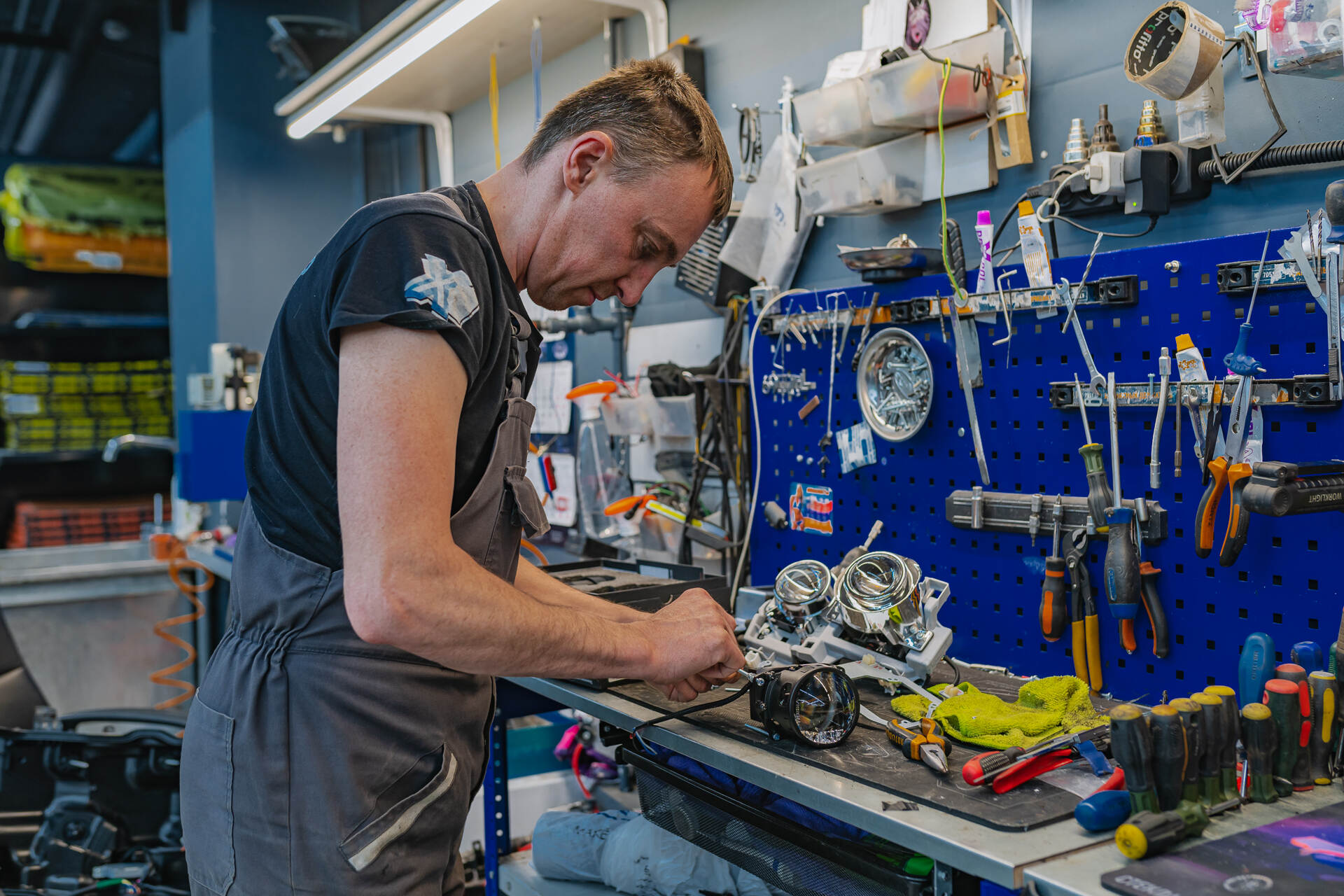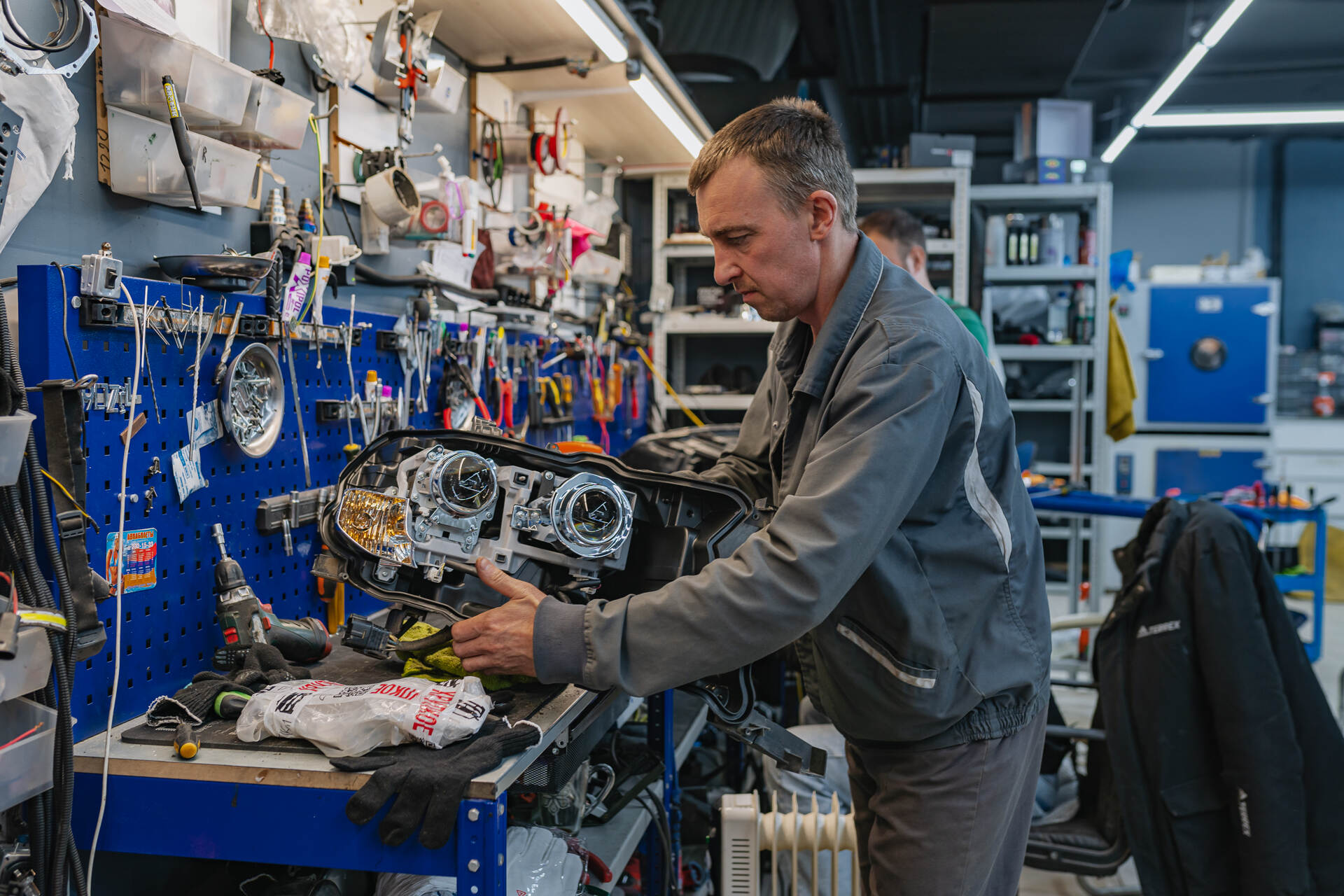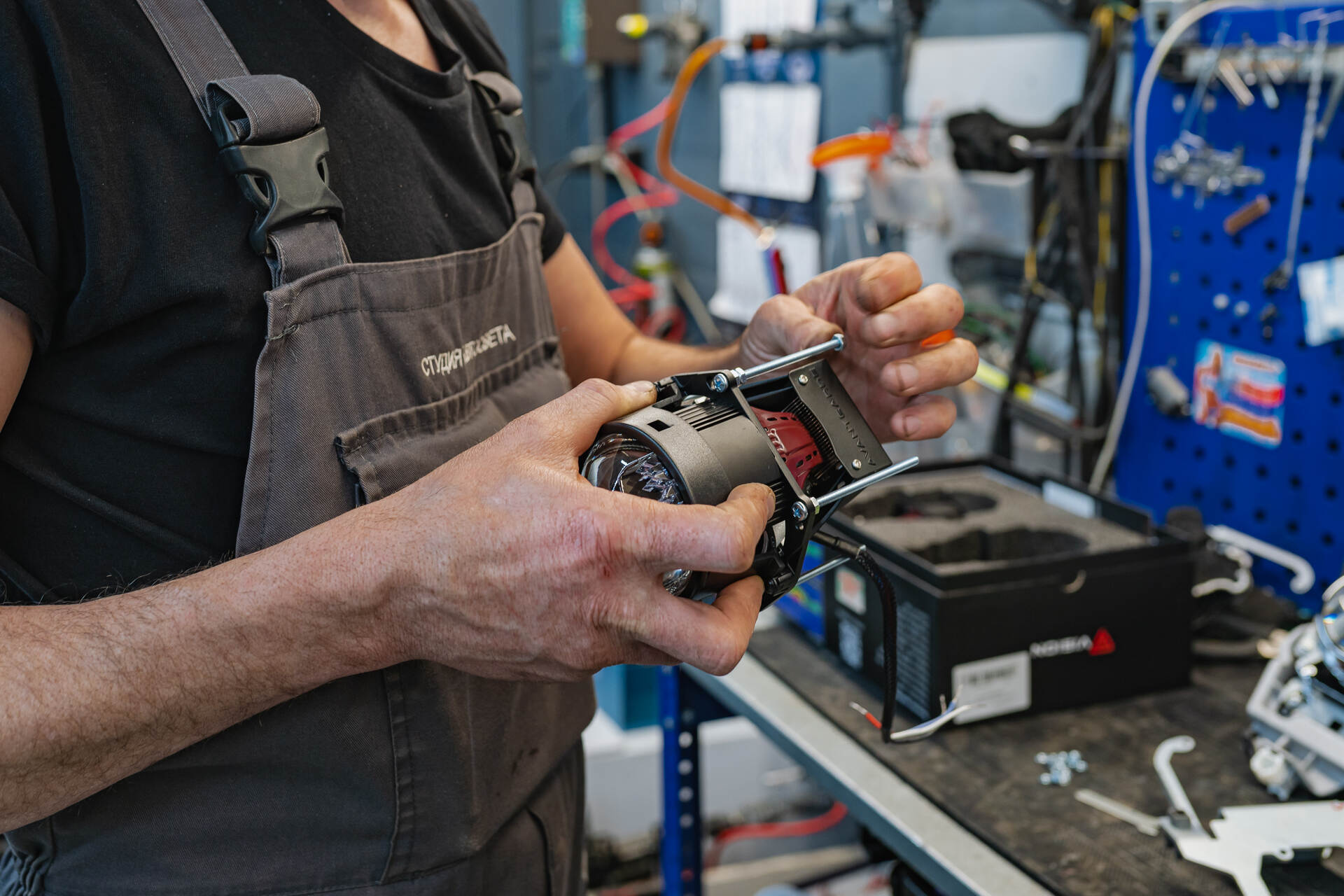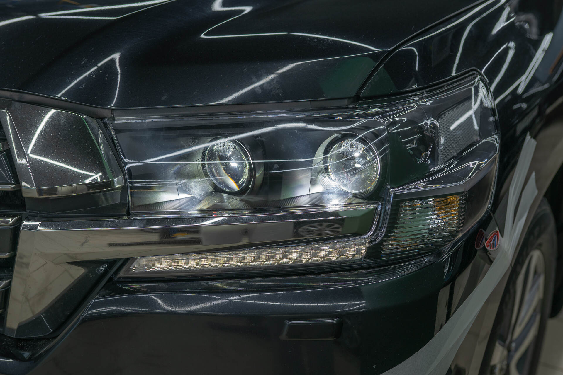 Герметизируем фары с новыми стеклами, собираем автомобиль и регулируем новый автосвет.После установки линз Vision Avantgarde Plus в фары Toyota Land Cruiser 200 мы временно возвращаем их на автомобиль для примерки декоративных масок и точной регулировки света. Параллельно мы также поменяем старые стекла фар на новые блестящие, затем оптика окончательно герметизируется бутиловым составом, и после его застывания машина проходит финальную сборку. Завершающим штрихом становится корректировка головного света по прибору, что гарантирует идеально ровную светотеневую границу от четырёх линз в фарах.