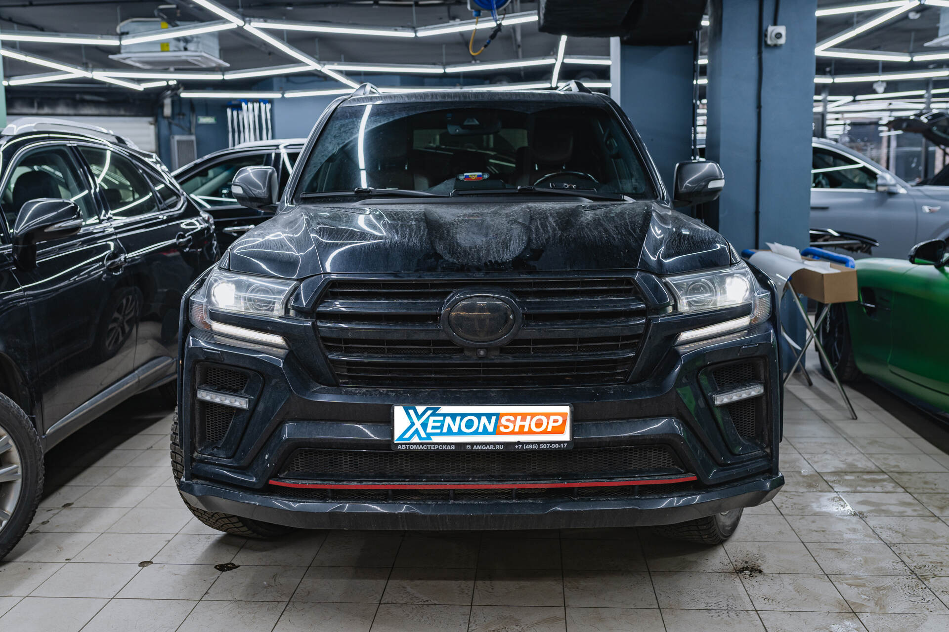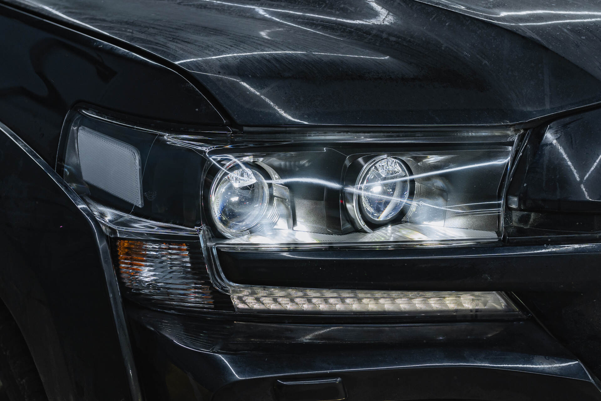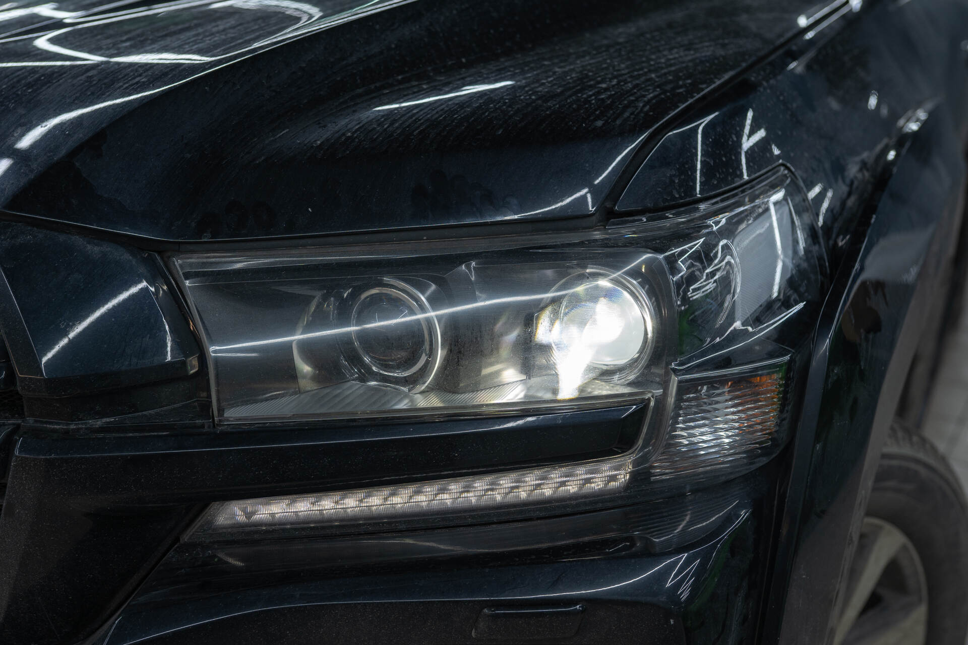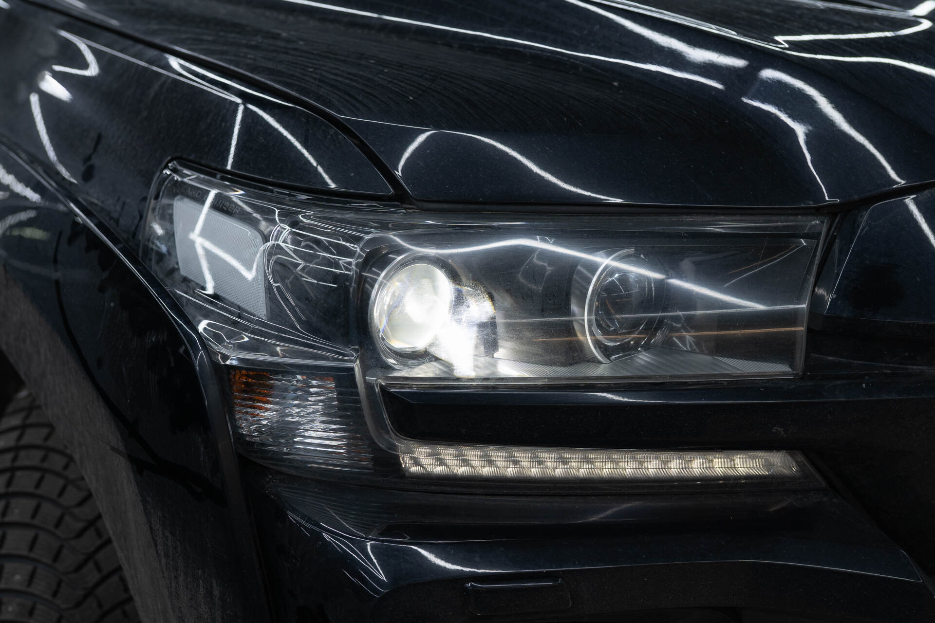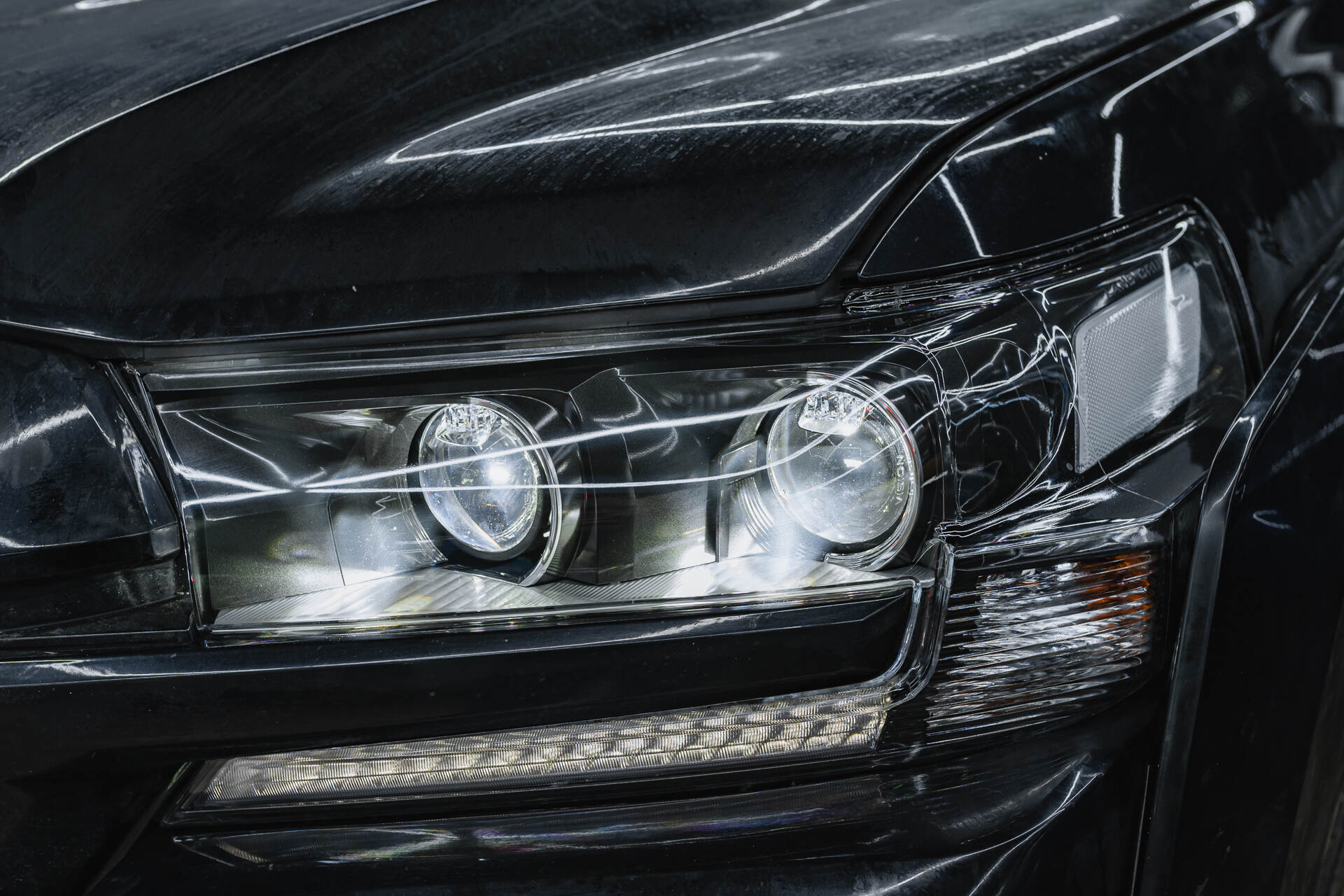 Итоговая светотеневая граница и вид авто после работы.На момент обращения ближний свет автомобиля практически отсутствовал, что является типичной проблемой для выгоревшей штатной оптики. Однако после установки четырех линз Vision Avantgarde Plus фары Toyota Land Cruiser 200 обрели мощное ярко-белое свечение. Новая светотеневая граница стала плотной и равномерной, что гарантирует эффективное освещение дороги и высокий уровень безопасности для всех участников движения в ночное время. Помимо технического апгрейда, машина заметно преобразилась внешне: контраст белого света и черного кузова подчеркивает строгий и современный стиль внедорожника.
