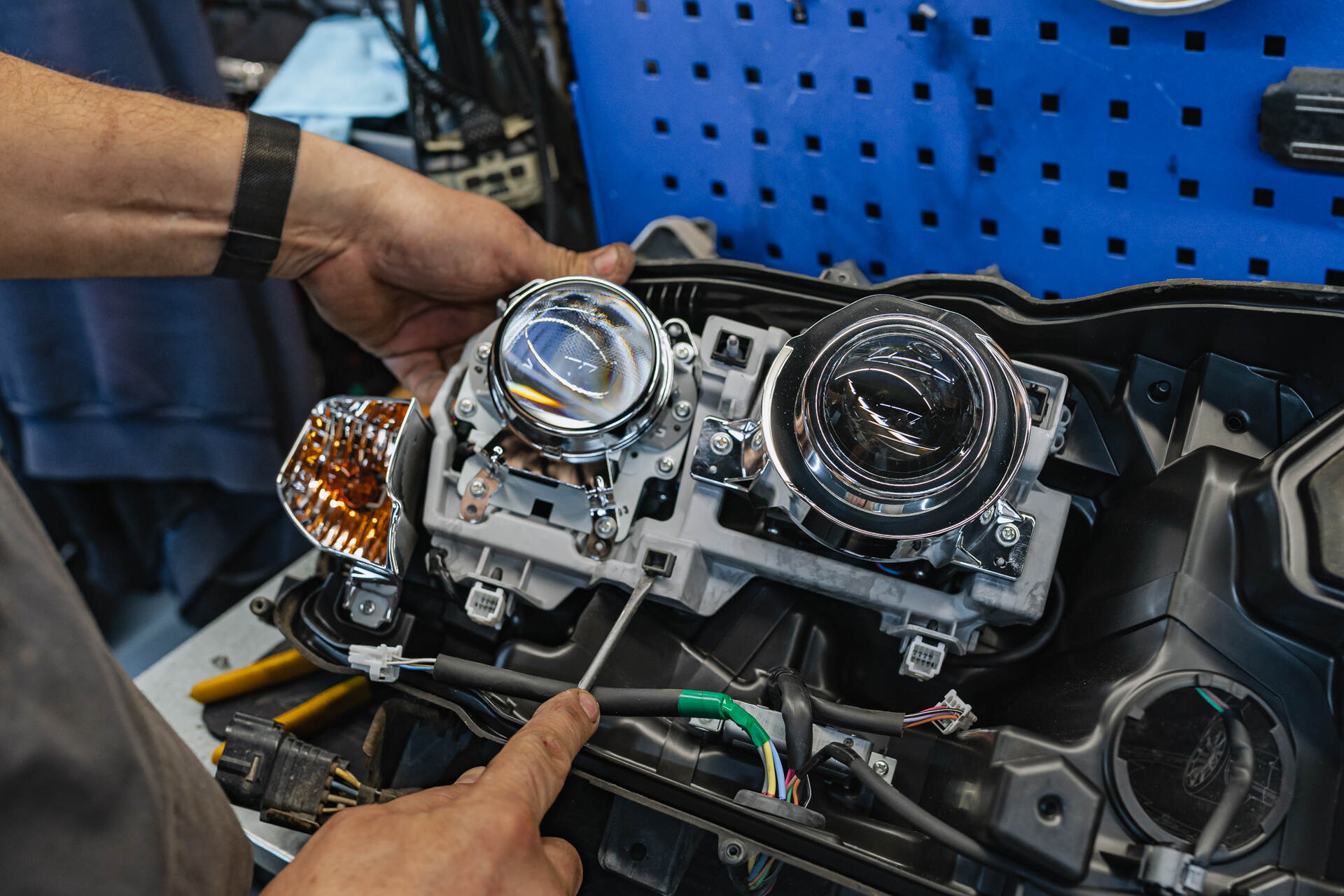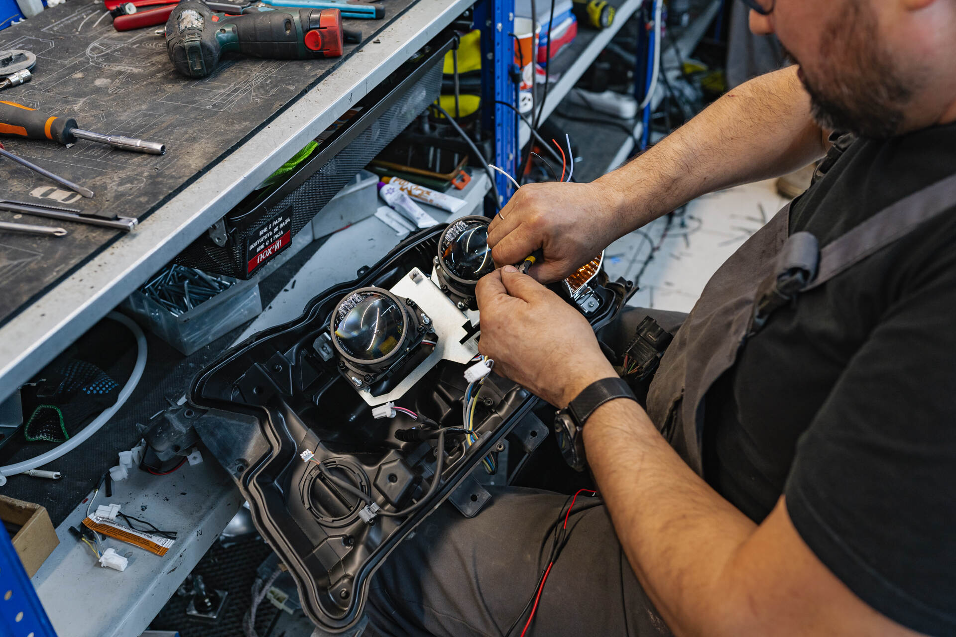 Демонтируем и разбираем фары. Установка новых линз в фары.Замена линз Тойота Ленд Крузер 200 на квадробилед занимает около суток, при этом точные сроки согласовываются индивидуально в зависимости от текущей загрузки сервиса. Процесс начинается с демонтажа бампера и извлечения фар, которые отправляются на разборку. После вскрытия корпусов фар мы заменяем штатные модули ближнего и дальнего света на два комплекта светодиодных линз Vision Avantgarde Plus. Благодаря использованию специальных переходных рамок установка проходит без серьёзного механического вмешательства в конструкцию фар, что полностью сохраняет целостность посадочных мест.