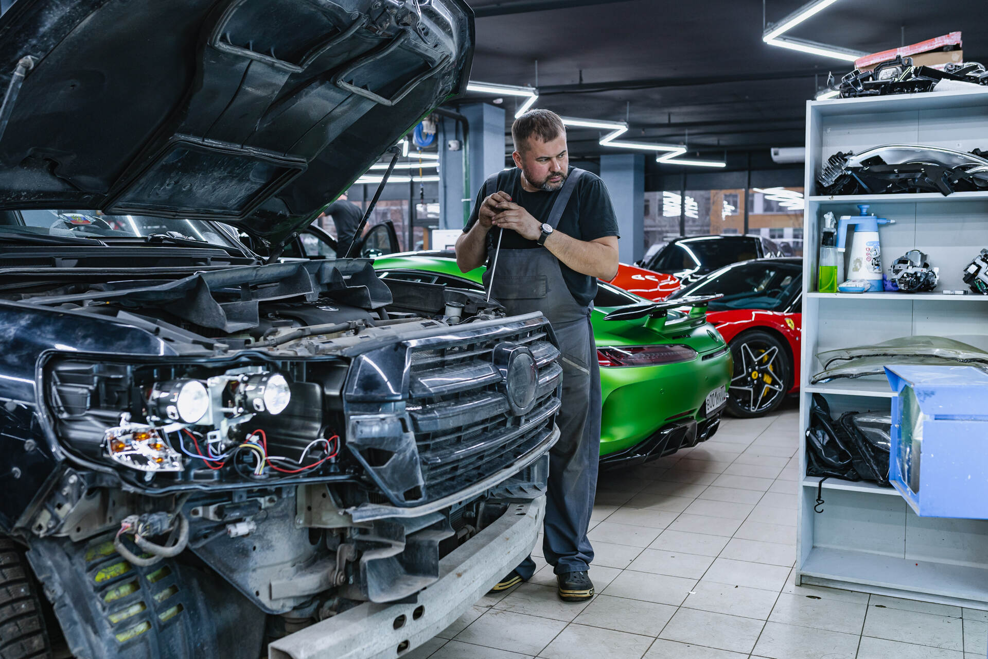Исходный свет фар и вид авто в момент обращения.В рамках данного кейса мы установим четыре линзы в фары Toyota Land Cruiser 200, используя современные премиальные светодиодные модули Vision Avantgarde Plus с нейтральным белым свечением 4800K и повышенной яркости. В последние годы именно чисто-белый свет фар стал эталоном качества, вытесняя стандартную заводскую желтизну. Выбранные линзы отличаются исключительной надежностью и качеством сборки, что подтверждается отсутствием рекламаций за все время их установок в нашем автосервисе. Уверенность в результате подкрепляется официальными обязательствами: производитель предоставляет трехлетнюю гарантию на сами модули, а наш сервис дает годовую гарантию на выполненные монтажные работы.