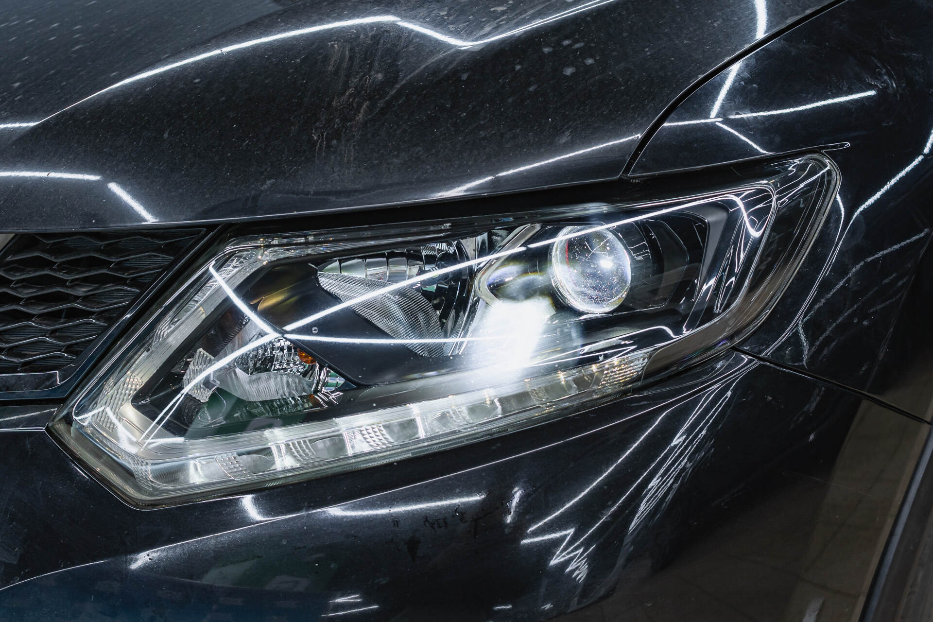 Регулируем положение новой оптики до герметизации фар, а также сборка фар.Перед финальной герметизацией мы устанавливаем фары с новыми линзами на Nissan X-Trail T32 для точной настройки положения модулей. С помощью специального оборудования мы выставляем оптику относительно горизонта и примеряем декоративные маски. После регулировки фары снова демонтируем для герметизации, а после завершения этого процесса окончательно возвращаем их на автомобиль. Пока фары были разобраны, мы также отчистили их изнутри щелочью от застарелой грязи, а завершающим шагом становится полировка стекол фар абразивными составами с внешней стороны, что значительно повышает их светопропускную способность и восстанавливает первоначальную прозрачность.