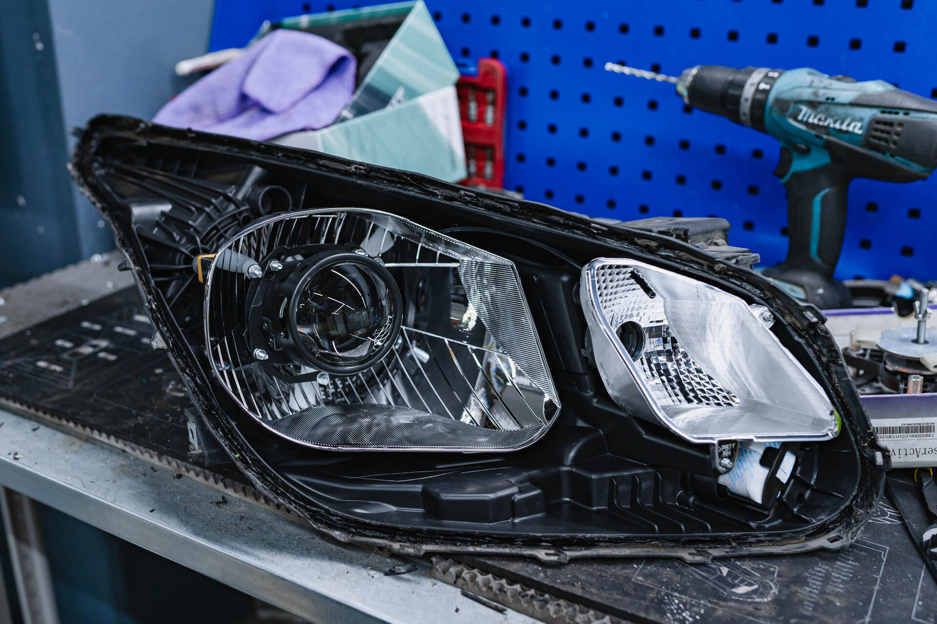 Демонтаж фар с автомобиля и их разбор. Пилим отражатели и устанавливаем линзы в фары.Несмотря на плачевное состояние оптики, наш многолетний опыт в сфере автосвета позволяет кардинально улучшить ситуацию. Мы выбрали светодиодные линзы MTF-Light Night Assistant Progressive 2.0 — надежное решение среднеценового сегмента, получившее множество положительных отзывов от наших клиентов. Эти модули генерируют мощный световой поток и оснащены системой активного охлаждения с вентилятором для стабильной работы. Прямое сравнение таких линз с галогенными лампами в рефлекторной оптике не имеет смысла, поскольку LED-технологии безоговорочно выигрывают по всем ключевым параметрам: от яркости и плотности заливки до долговечности и эстетики светового спектра.
