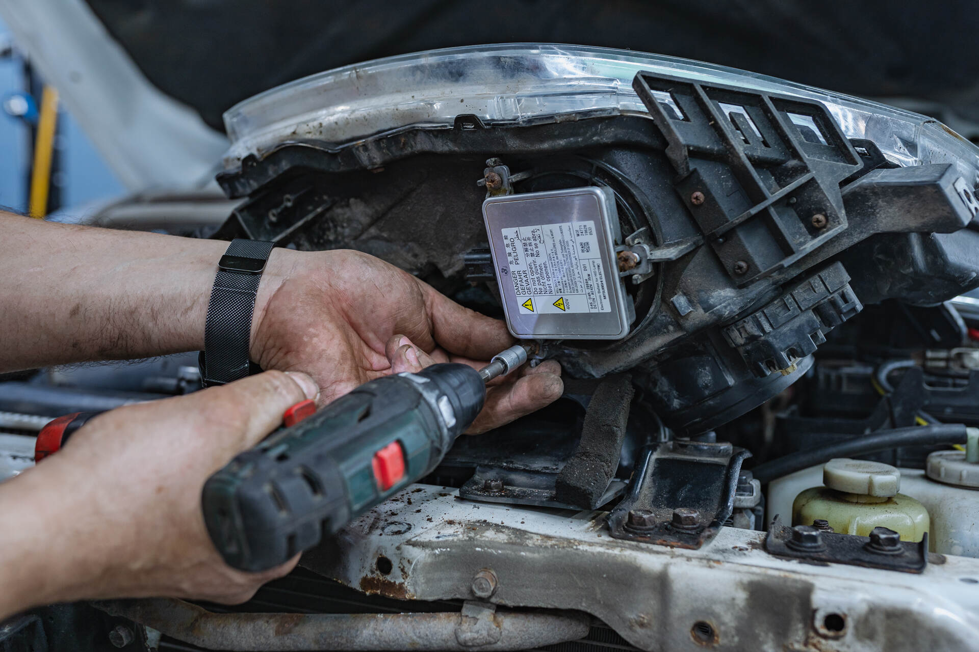 Демонтаж фары и сгоревшего блока розжига штатного ксенона. Установка нового блока розжига на фару.Замены ксенонового блока розжига Митсубиси Паджеро 4 не требует чересчур много времени и в среднем занимает около двух-трех часов. Основная сложность здесь заключается в тонкой работе с электрикой: крайне важно обеспечить корректное подключение, чтобы исключить возникновение помех в бортовой сети и нестабильное свечение ксенона. Работа выглядит следующим образом: сначала мы аккуратно разбираем переднюю часто авто и снимаем потухшую фару, после чего извлекаем вышедший из строя блок розжига и устанавливаем на его место новый оригинальный ксеноновый блок Mitsubishi W3T23371, W3T21571.