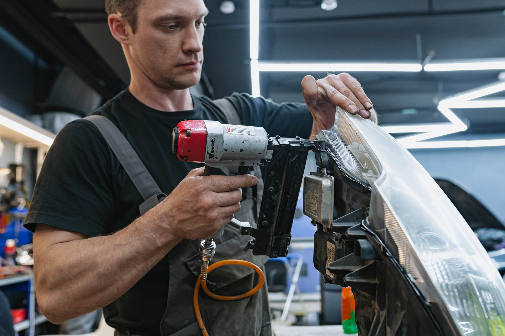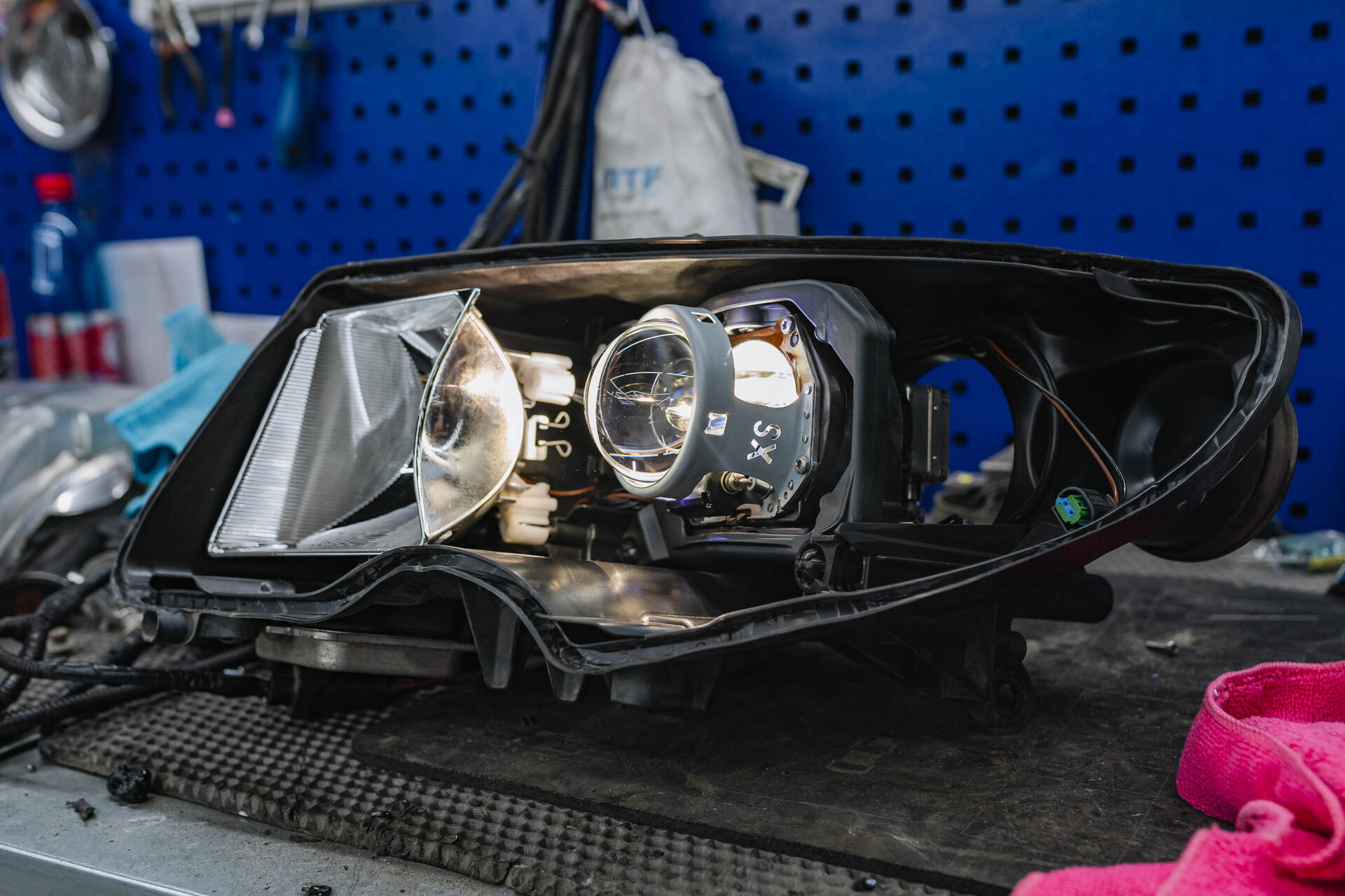Сборка автомобиля и регулировка обновлённого головного света.Замена линз Шкода Суперб занимает около суток из-за сложности разбора фар, которые на заводе собираются с применением неплавкого стекольного герметика. Процесс начинается с демонтажа бампера и извлечения фар для их последующего вскрытия. После удаления выгоревших штатных модулей мы интегрируем в фары биксеноновые линзы XS-Light 3R Premium, используя специализированные переходные рамки для точной фиксации. Параллельно с установкой новой оптики выполняется глубокая очистка внутренней поверхности стекол фар щелочным составом, что позволяет полностью устранить накопленный годами налет и грязь