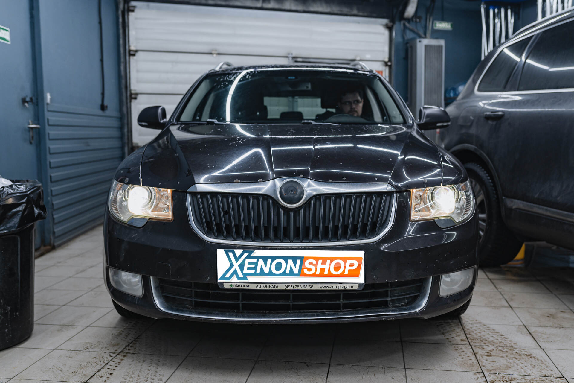 Итоговая светотеневая граница и вид авто после работы.После сборки и высыхания герметика фары возвращаются на автомобиль Skoda Superb (2012) для финальной полировки стекол, которая эффективно устраняет мелкие царапины и потертости. Завершающая настройка оптики по прибору гарантирует формирование безупречно ровной и плотной светотеневой границы без искажений. Обновленный головной свет с билинзами XS-Light 3R Premium обеспечивает мощную и равномерную заливку дорожного полотна светом, а минимальный уровень боковой засветки исключает риск ослепления встречных водителей – всё это хорошо продемонстрировано на финальной фотографии СТГ. Теперь автомобиль не только выглядит солидней и строже, но и гарантирует максимальную безопасность в темное время суток за счет яркого света фар.