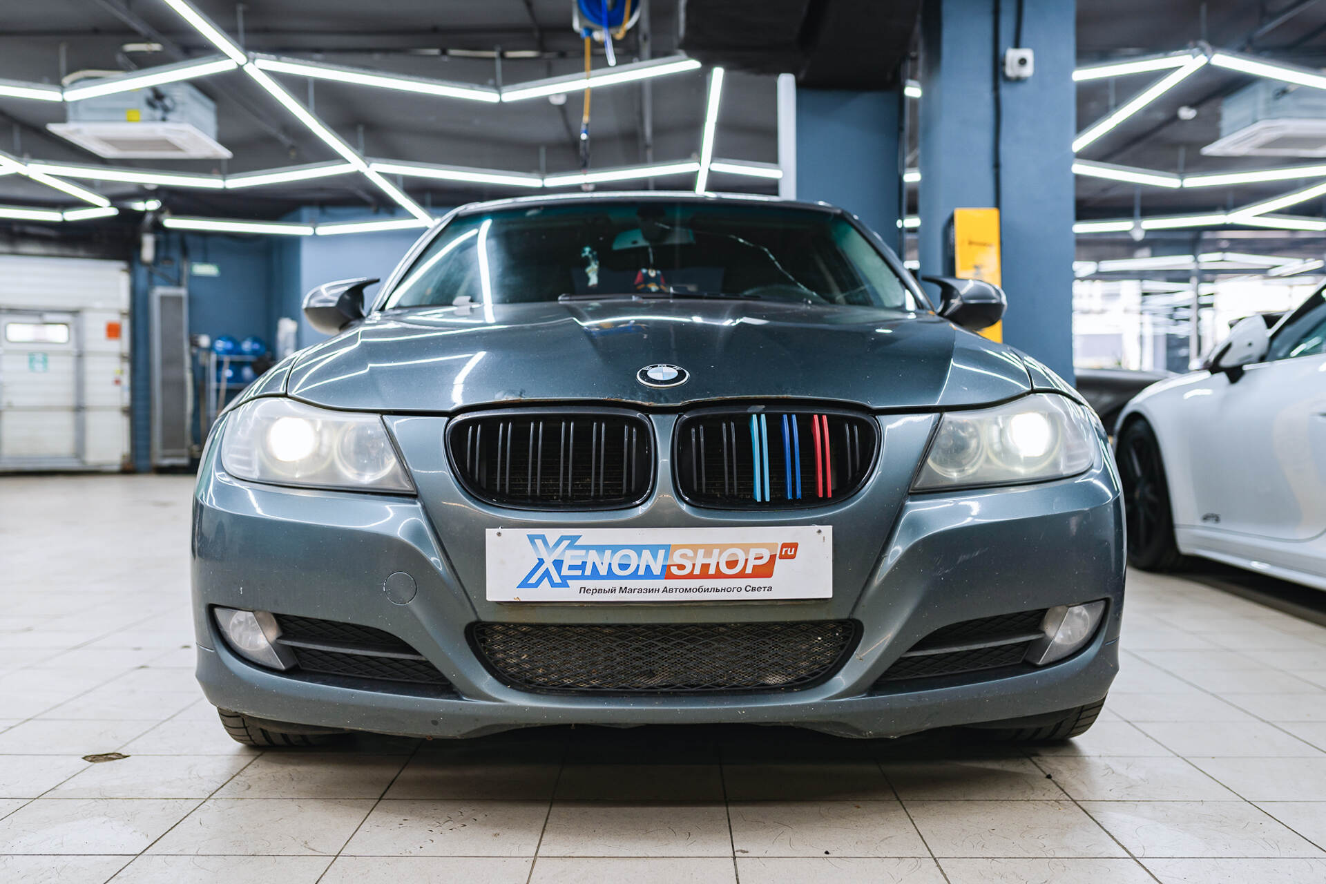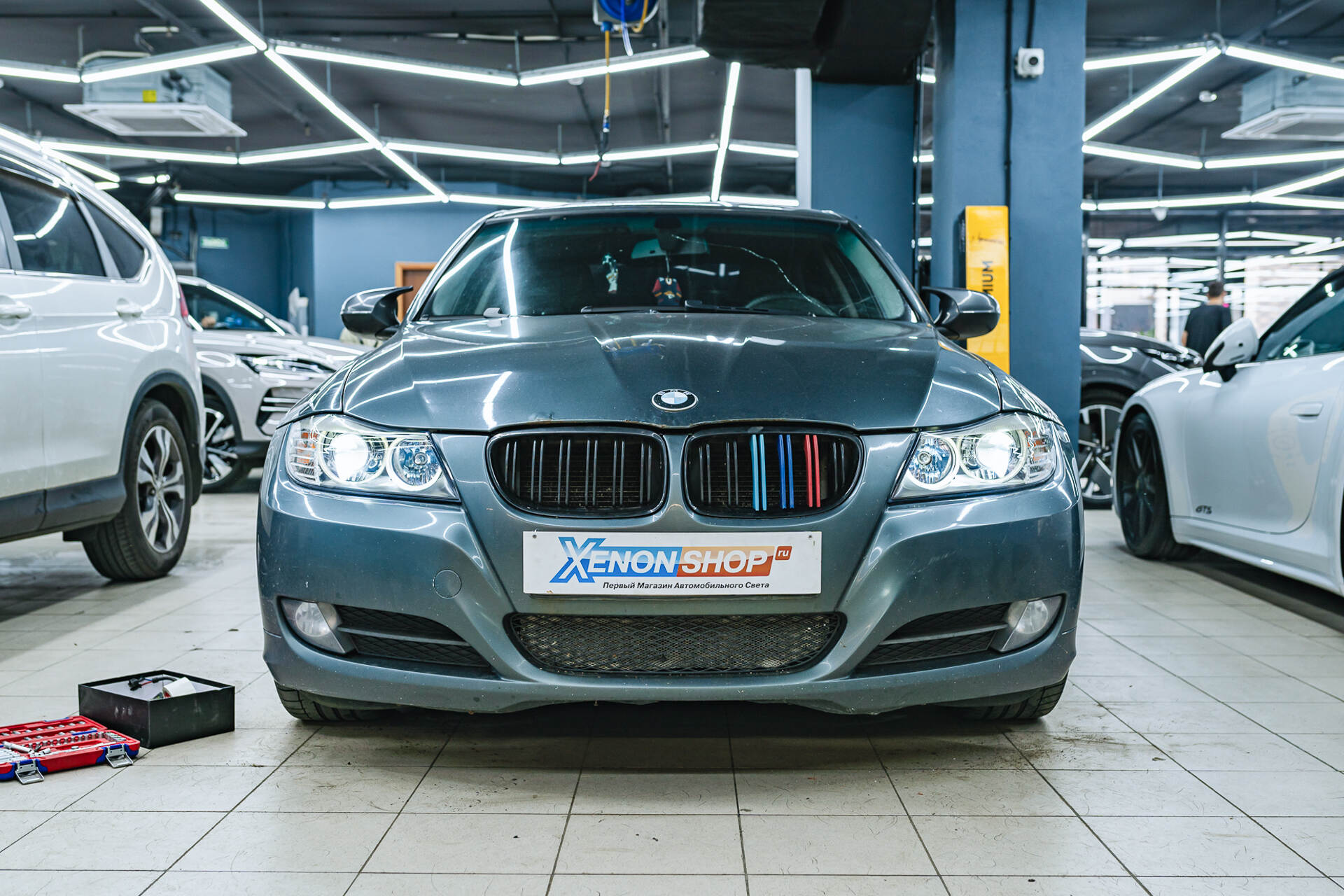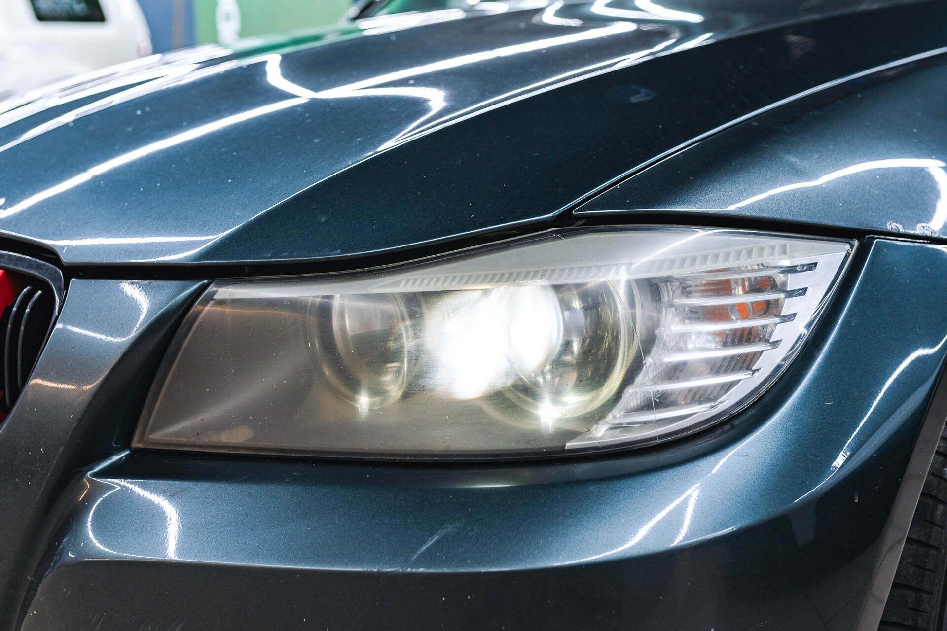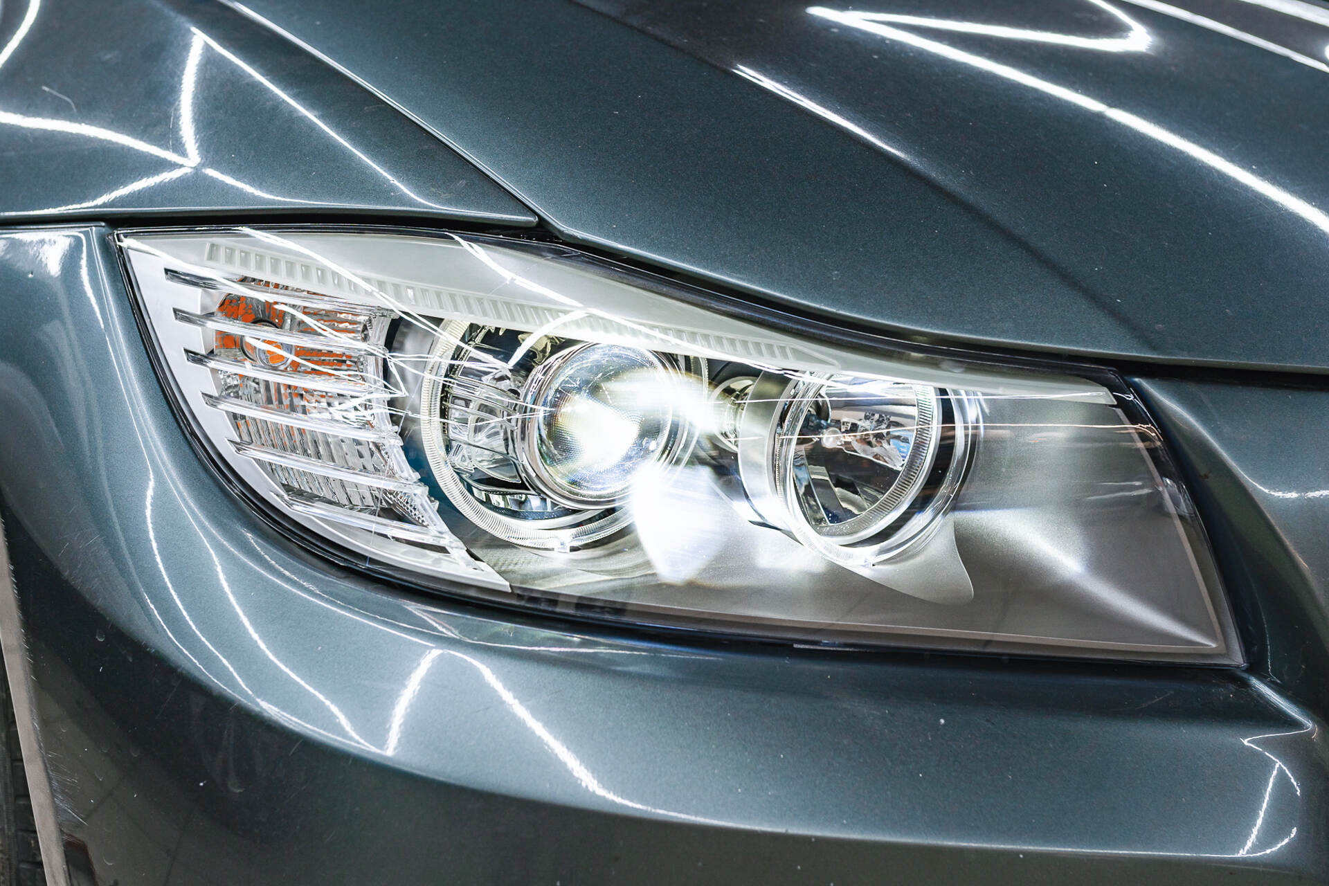 Исходный свет фар и вид автомобиля в момент обращения.В рамках данного проекта мы выполним замену штатных ксеноновых линз в фарах BMW 3 E90 (2009) на современные светодиодные модули Vision TRI-LED Ultimate Series Soft. Эти линзы создают световой пучок белого света с цветовой температурой 4800K. Все больше автовладельцев отказываются от характерной для старых фар желтизны в пользу более эстетичного и современного белого света. Представленные светодиодные модули отличаются продуманной конструкцией и надежной сборкой: мы уже достаточно давно работаем с ними, и от клиентов, кому мы их устанавливали не поступало жалоб на качество работы. Кроме того, не будем забывать и про гарантию: два года на сами линзы и один год на работы по их установке.