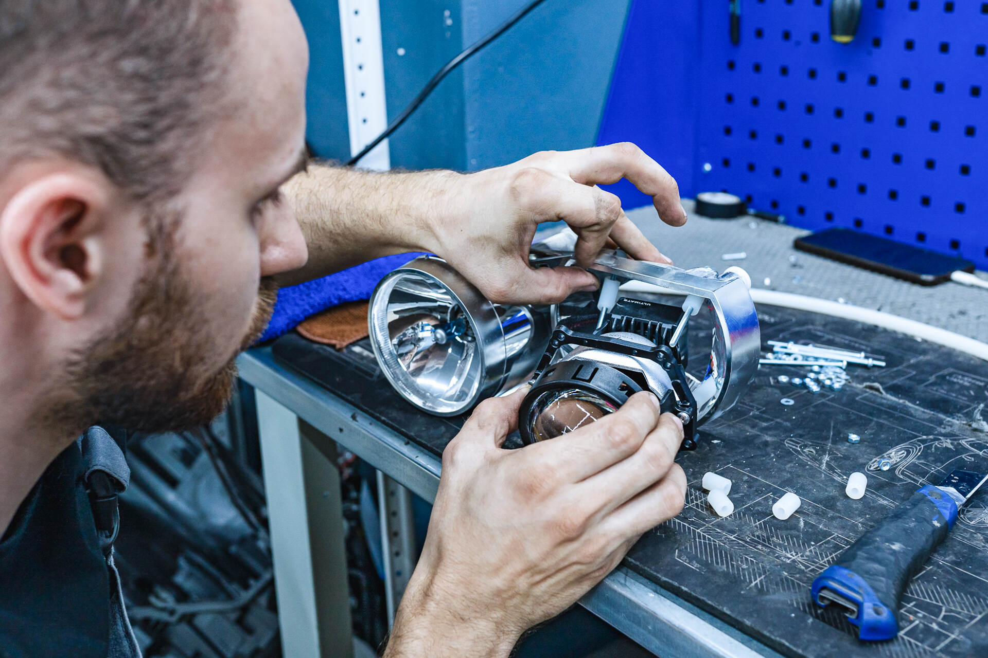 Демонтаж фар с автомобиля. Дефектовка и разбор фар.Замена линз в фарах на БМВ 3 Е90 занимает в среднем около одних суток, но фактическая продолжительность работ зависит от текущей загрузки нашей мастерской. В связи с этим дата завершения может корректироваться — этот вопрос мы всегда согласовываем индивидуально с каждым клиентом. Работа по замене линз начинается с разборки передней части автомобиля: снимаем бампер, после чего извлекаем обе фары. Разборка фар выполняется вручную, поскольку производитель использовал стекольный герметик, не поддающийся размягчению в промышленной печи. После разборки мы извлекаем штатные ксеноновые линзы и устанавливаем светодиодные модули Vision TRI-LED Ultimate Series Soft. Монтаж осуществляется с помощью специальных переходных рамок, что позволяет обойтись без серьёзных доработок посадочного места.