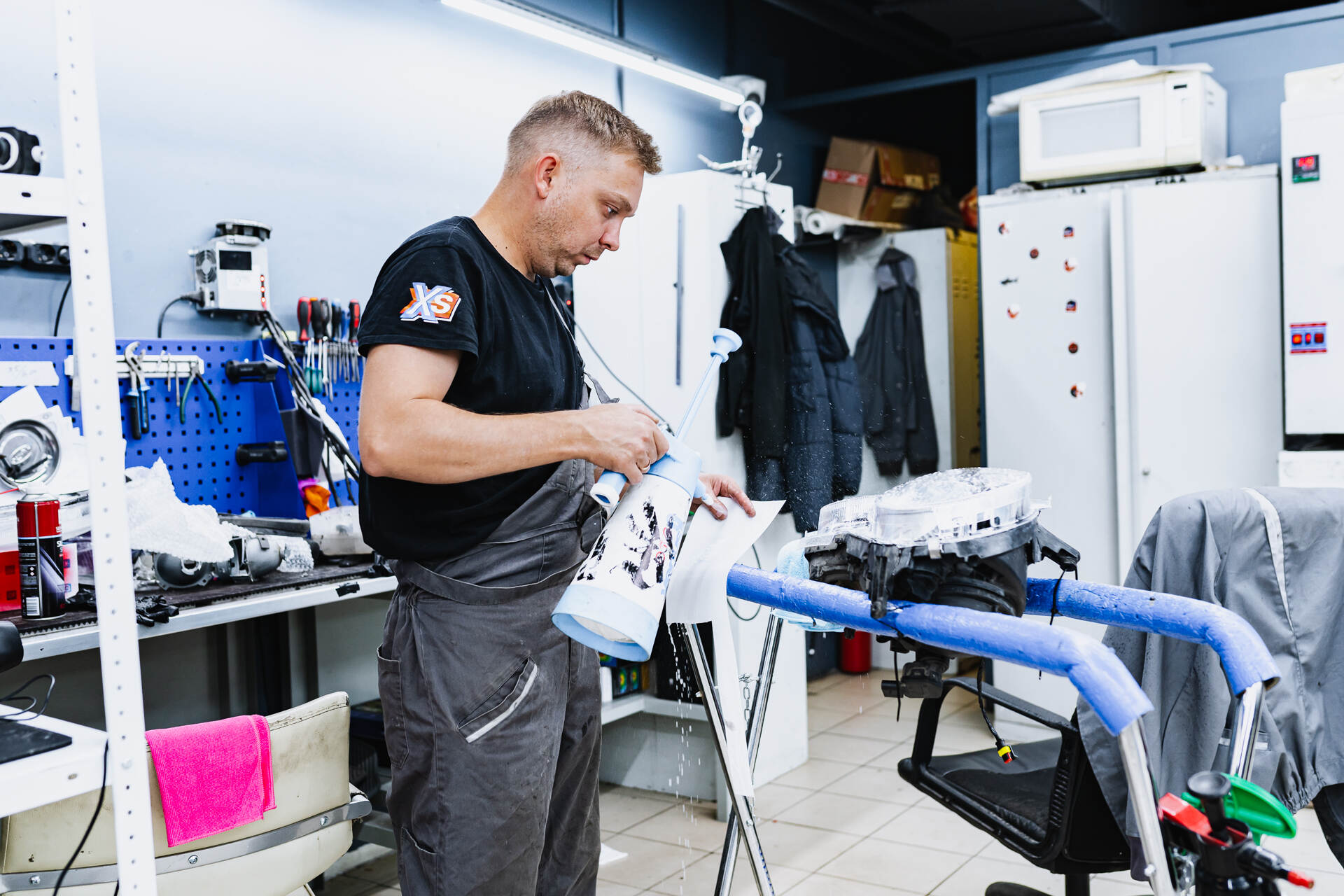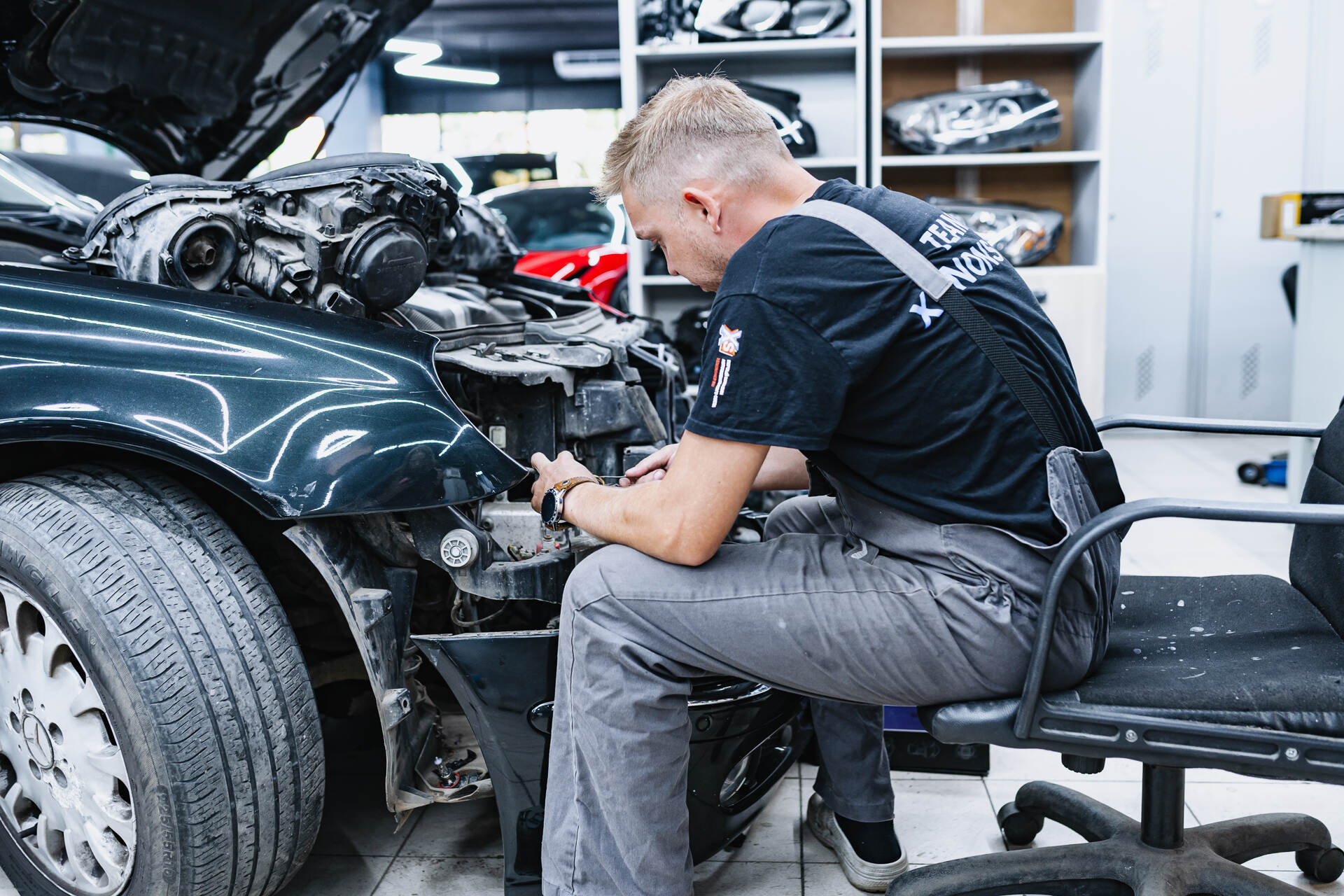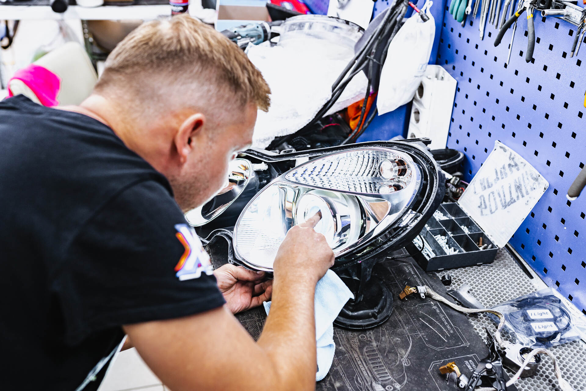 Устанавливаем новые линзы в фары. Бронируем фары и собираем автомобиль.Процесс замены линз на Мерседес 211 занимает приблизительно сутки. Почему приблизительно? Сроки выполнения зависят от текущей загрузки нашей мастерской, поэтому в некоторых случаях сдача автомобиля может быть перенесена — эти моменты мы всегда обсуждаем индивидуально с каждым клиентом. Работы начинаются с демонтажа передней части автомобиля: снимаем бампер и извлекаем обе фары, которые затем помещаются в промышленную печь, где герметик, удерживающий стекла фар на их основании, плавится, позволяя разобрать фары. После разборки из фар извлекается штатная ксеноновая оптика, а на ее место устанавливаются светодиодные линзы MTF-Light MaxBeam 2.0, которые фиксируются с помощью специальных переходных рамок без необходимости серьёзной доработки посадочных мест.