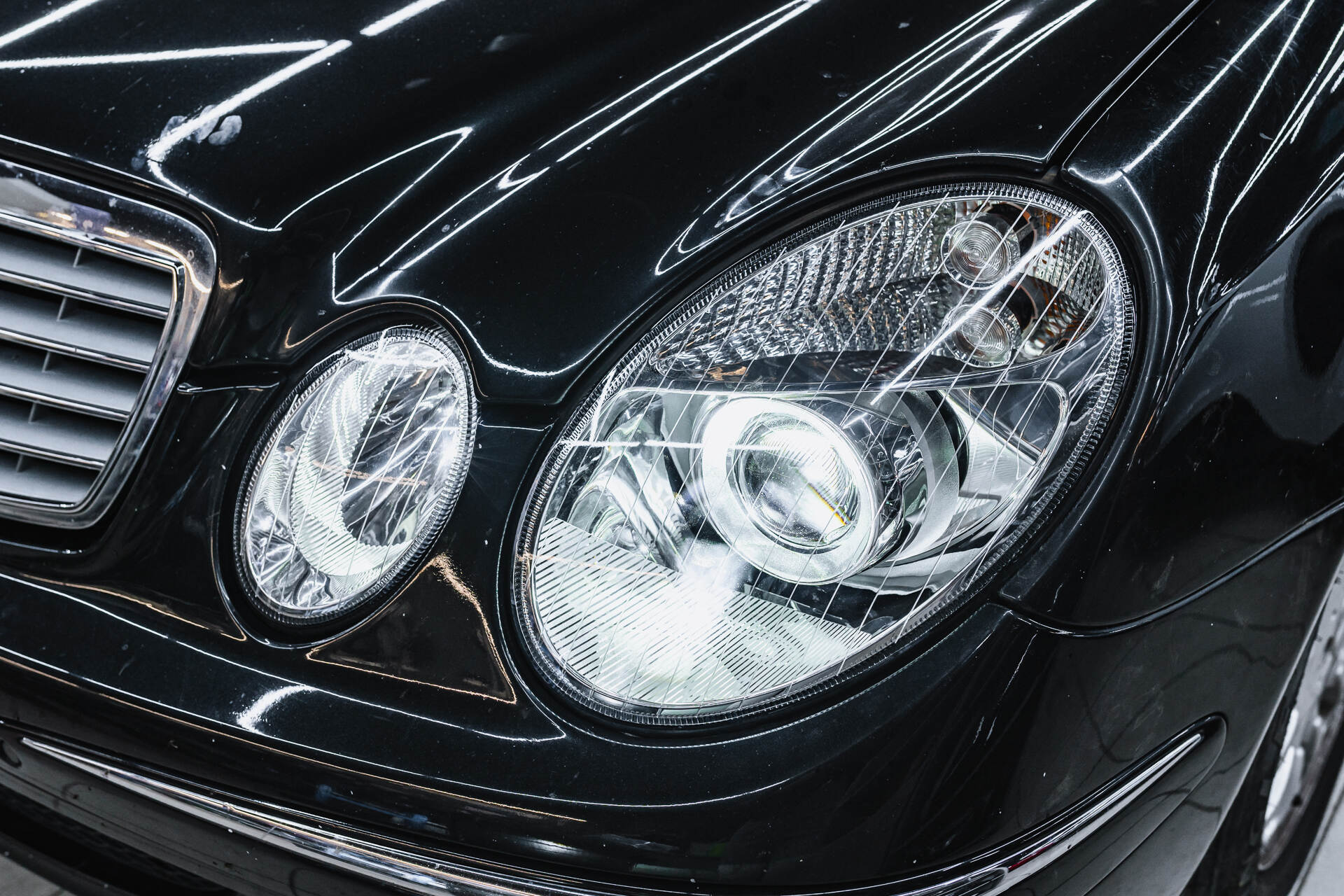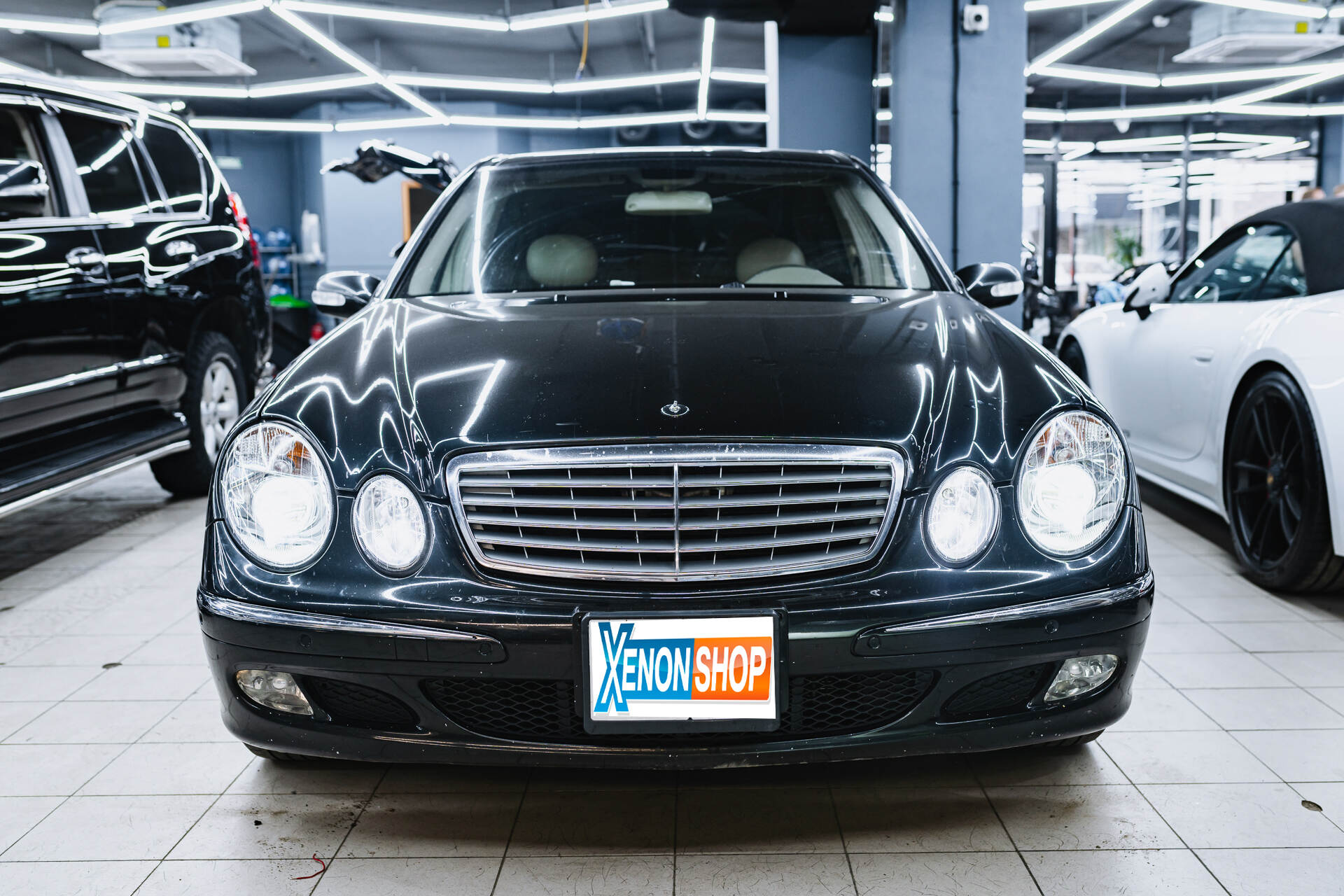 Вид автомобиля после работы.Следует подчеркнуть, что в момент обращения автомобиля ближний свет практически отсутствовал — такая ситуация для нас привычна, поскольку к нам часто обращаются владельцы с неработающей оптикой. Однако после установки линз MTF-Light MaxBeam 2.0 фары Mercedes-Benz E W211 (2003) начали излучать интенсивный белый свет, КАЧЕСТВЕННО превосходящий исходные показатели, демонстрирующий высокую плотность светового луча и его равномерным распределением по дорожному полотну — такое освещение эффективно рассеивает темноту перед автомобилем, обеспечивая необходимый уровень безопасности для водителя и пассажиров во время ночных поездок. Визуальный облик автомобиля также претерпел положительные изменения: яркое белое свечение фар выгодно контрастирует с черным кузовом, создавая элегантный и солидный образ.