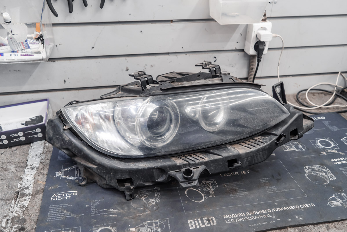 Установка новых линз в фары. Собираем фары с новыми стёклами.Замена линз на БМВ М3 Е92 занимает полные сутки, так как заводской стекольный герметик не поддается нагреву в печи, что делает фары «неразборными» и требует кропотливого ручного вскрытия. Процесс начинается с демонтажа бампера и извлечения фар, после чего мастера аккуратно отделяют стекла и удаляют выгоревшие линзы, на их место устанавливается современный биксенон XS-Light 3R Premium. Использование специальных переходных рамок позволяет закрепить новые линзы в штатных гнездах без доработки конструкции, сохраняя целостность посадочных мест.