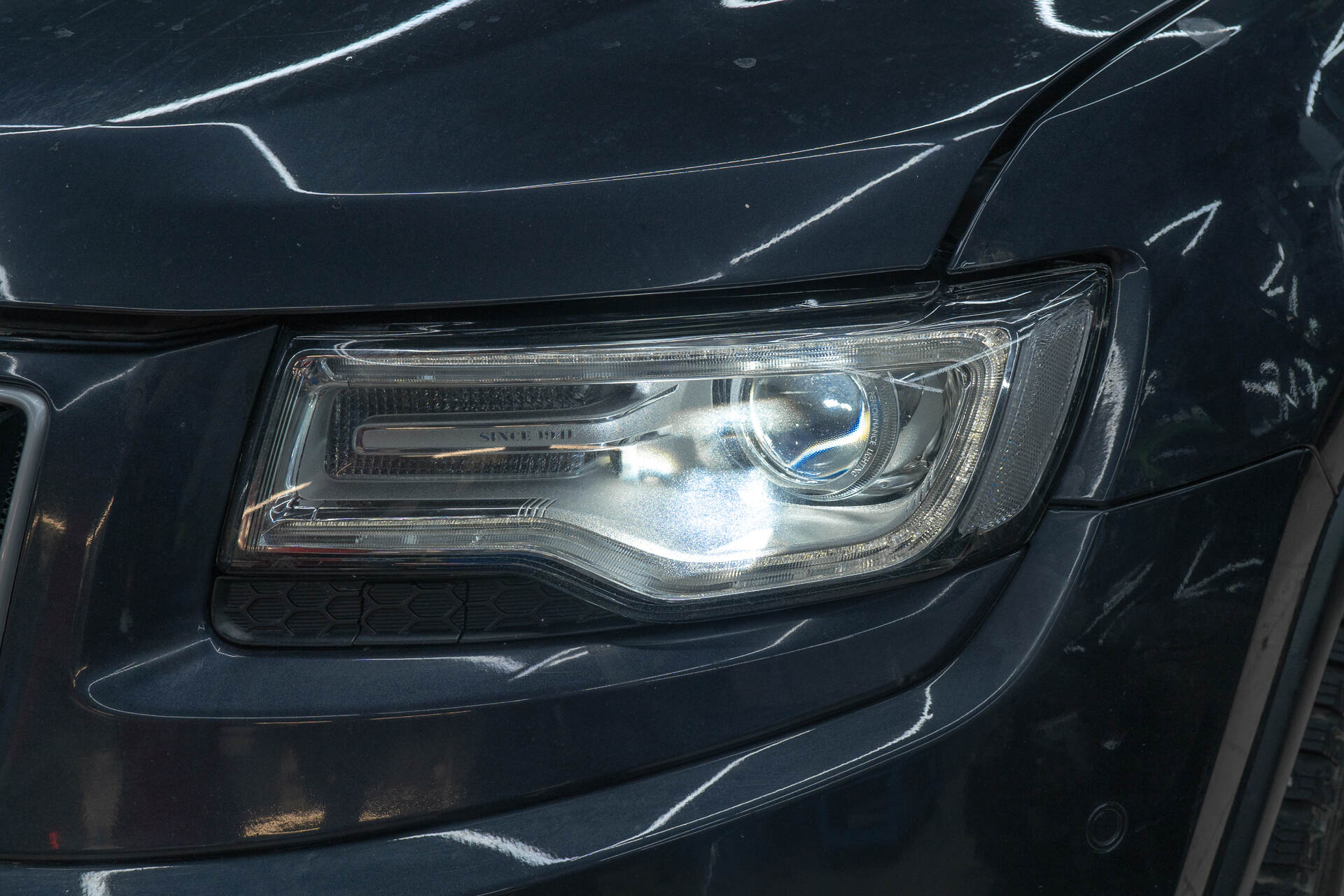 Итоговая светотеневая граница и вид авто после работы.Завершив установку светодиодных модулей Vision Tri-led Ultimate Series, мы собрали фары Jeep Grand Cherokee WK2 на свежий температурный герметик и вернули их на автомобиль. Далее оптика прошла точную настройку на специальном стенде для формирования безупречной светотеневой границы. Обновленный головной свет, результаты которого зафиксированы на итоговых фото, демонстрирует идеальную белизну без посторонних оттенков, а также плотную и равномерную заливку. Благодаря широкому световому пучку и отсутствию паразитных засветок новые линзы гарантируют водителю безопасность и комфорт в темноте, исключая при этом ослепление встречного трафика.