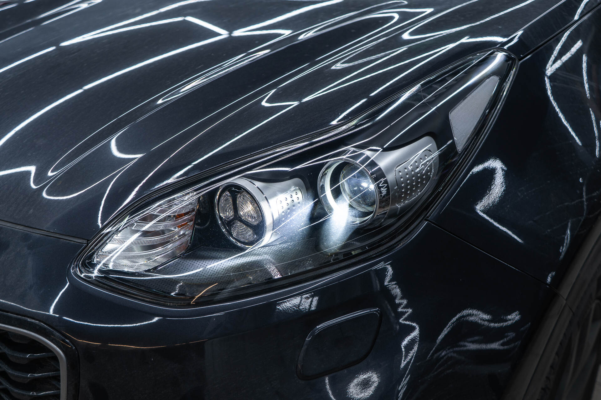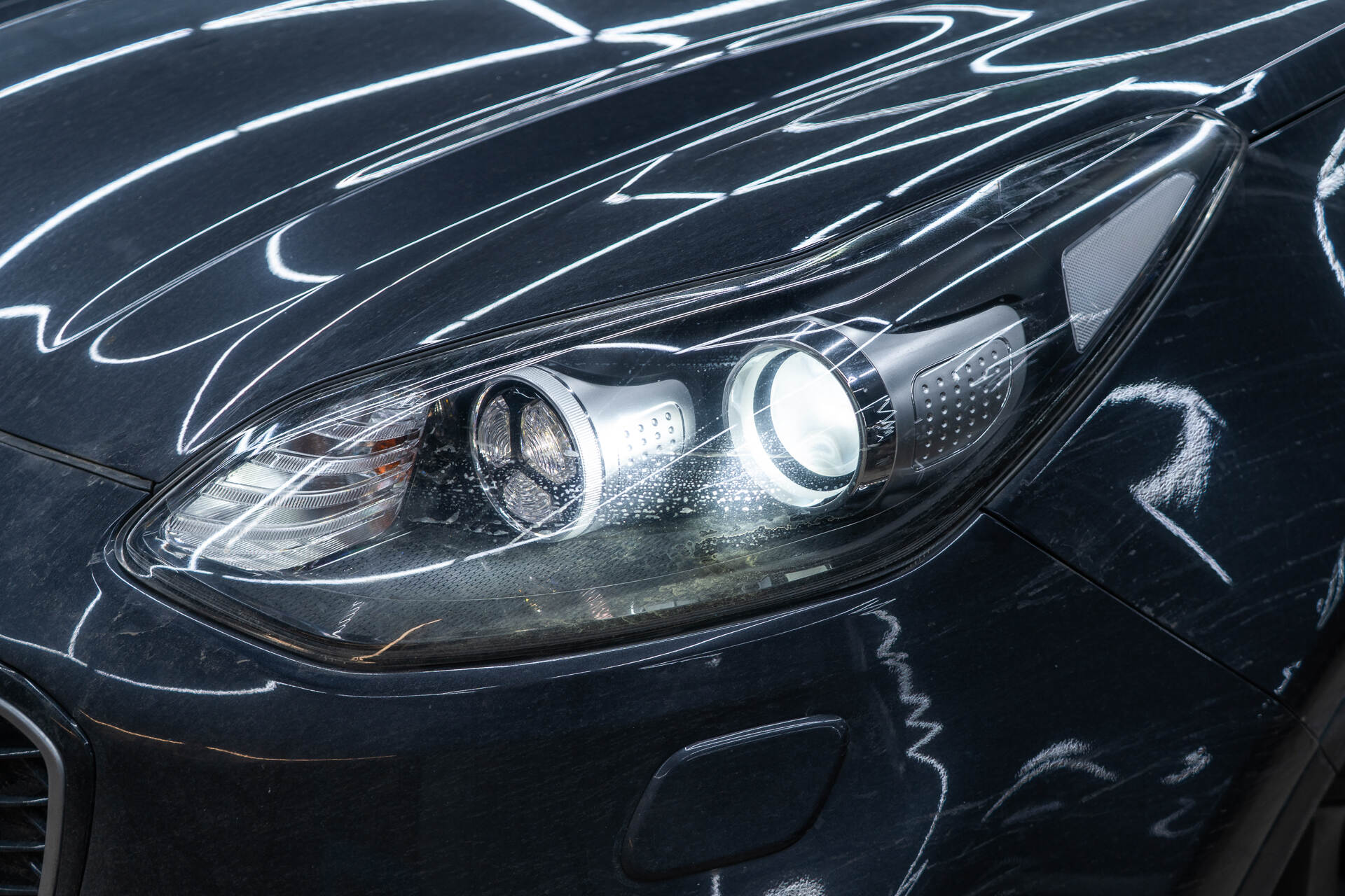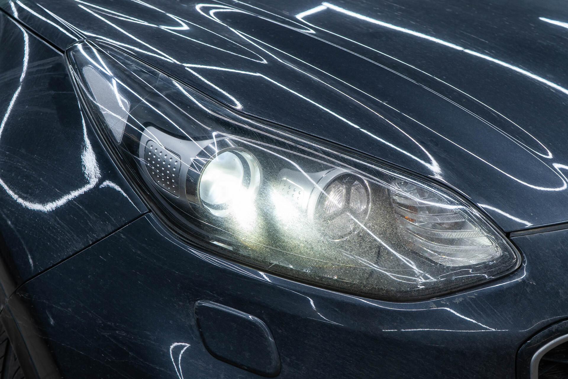 Итоговая светотеневая граница и вид автомобиля после работы.Стоит отметить, что обновленный головной свет кардинально отличается от исходного варианта, с которым автомобиль первоначально поступил к нам в цех. Если ранее свет фар имел слабую силу недостаточную плотность, то теперь света реально много, а светотеневая граница стала широкой, с насыщенной структурой с идеально равномерным распределением чистого белого света и минимальной паразитной засветкой. Светодиодные лампы XS-Light LED HD3 HB3 5000K в фарах Kia Sportage продемонстрировали отличные эксплуатационные качества — они обеспечивают эффективное освещение дорожного полотна, что многократно повышает комфорт и безопасность ночных поездок. Плюс ярко-белый свет фар с новыми черными отражателями отлично смотрится на фоне серого кузова, контрастируя и создавая строгий образ автомобилю.