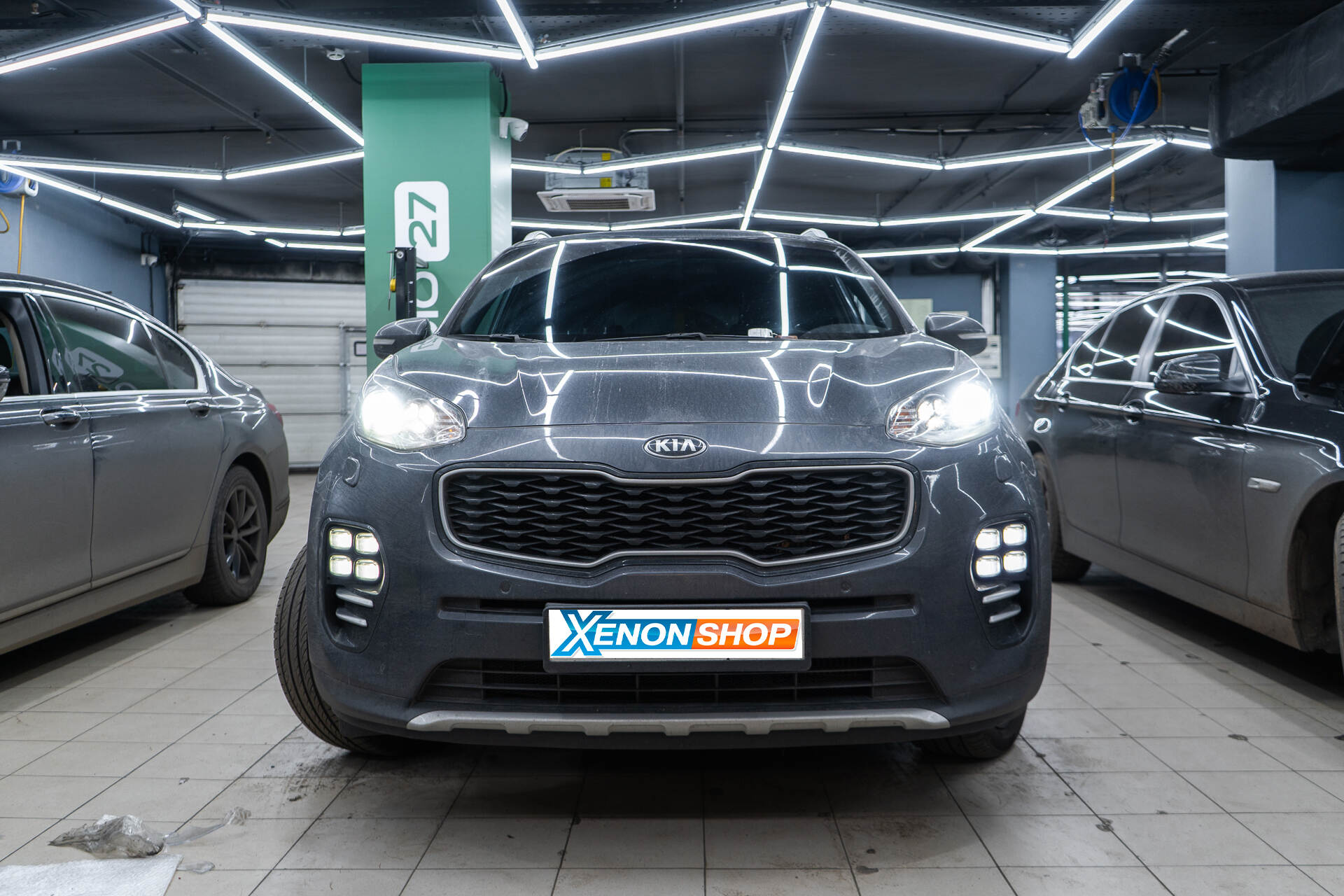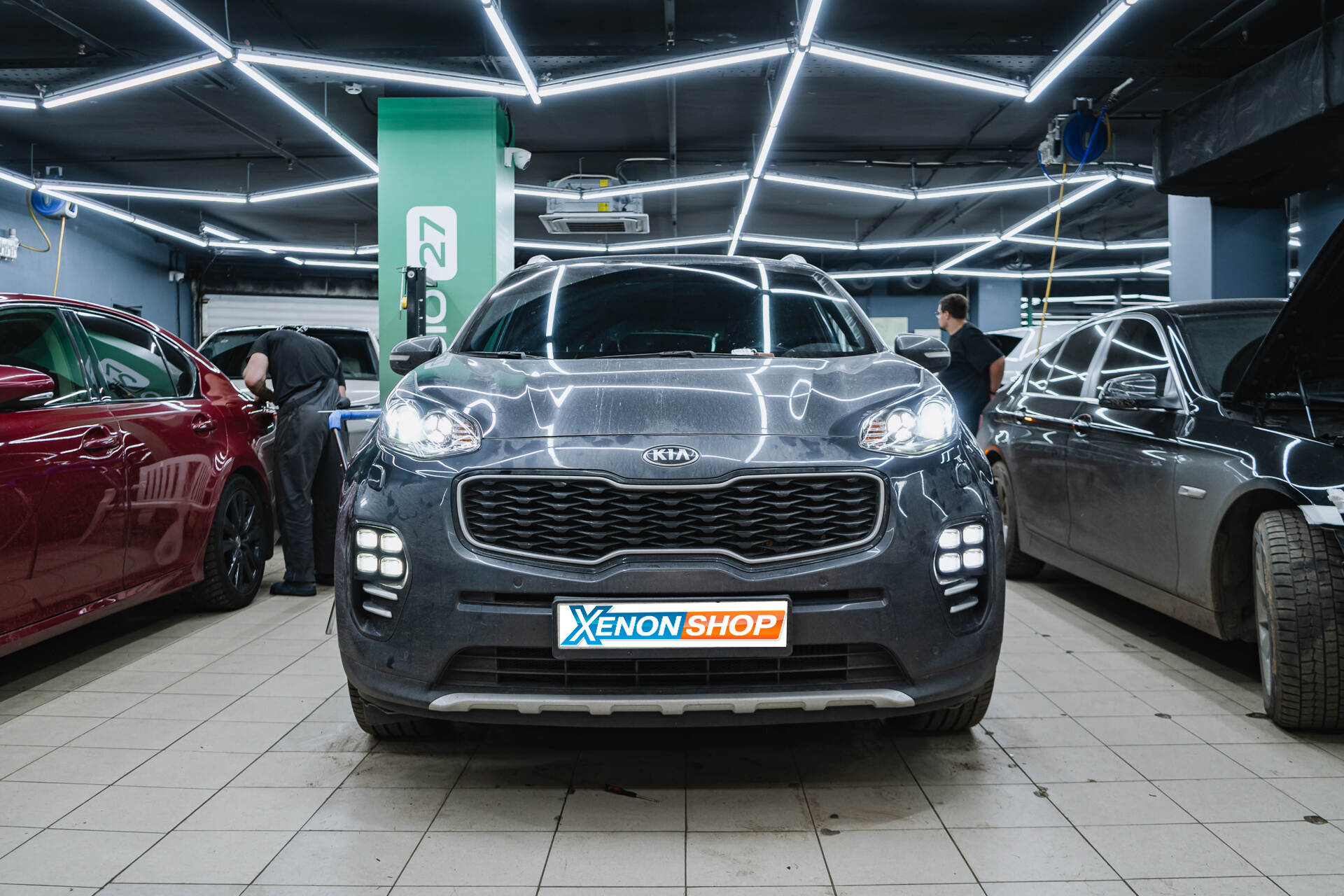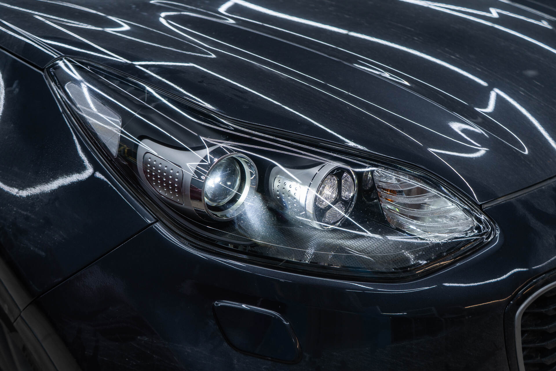 Итоговая светотеневая граница и вид автомобиля после работы.Стоит отметить, что обновленный головной свет кардинально отличается от исходного варианта, с которым автомобиль первоначально поступил к нам в цех. Если ранее свет фар имел слабую силу недостаточную плотность, то теперь света реально много, а светотеневая граница стала широкой, с насыщенной структурой с идеально равномерным распределением чистого белого света и минимальной паразитной засветкой. Светодиодные лампы XS-Light LED HD3 HB3 5000K в фарах Kia Sportage продемонстрировали отличные эксплуатационные качества — они обеспечивают эффективное освещение дорожного полотна, что многократно повышает комфорт и безопасность ночных поездок. Плюс ярко-белый свет фар с новыми черными отражателями отлично смотрится на фоне серого кузова, контрастируя и создавая строгий образ автомобилю.