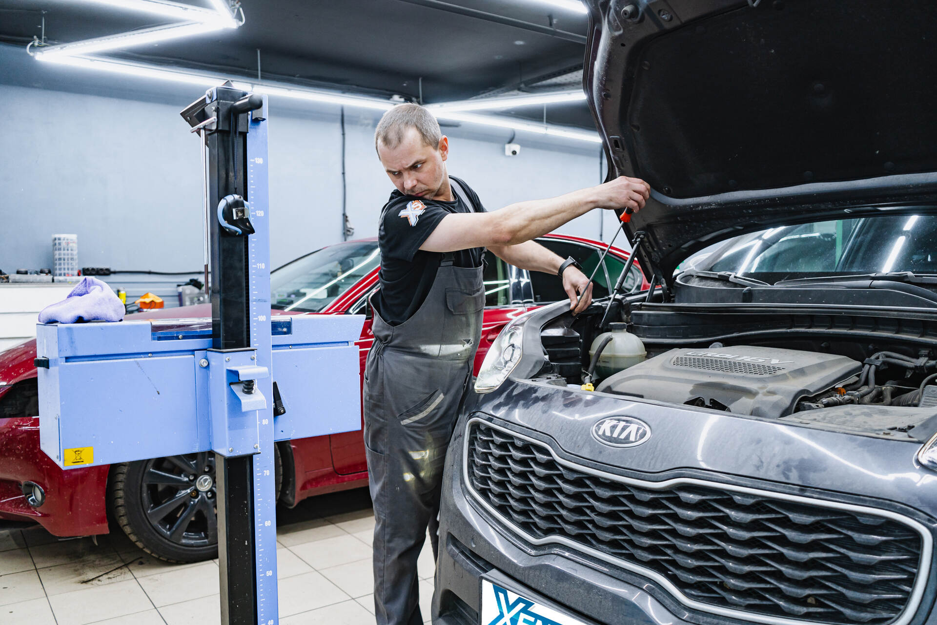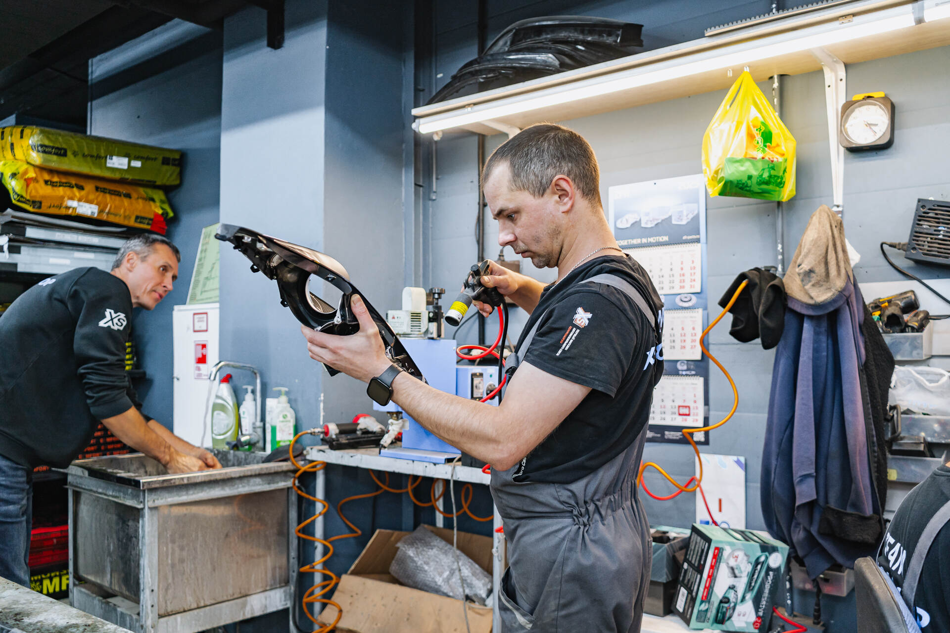 Демонтируем фары и разбираем их. Чистим стекла фар и собираем их.Замена отражателей в фарах Киа Спортаж занимает полный рабочий день: вы привозите автомобиль утром, а к вечеру он уже оснащен обновленной оптикой. Хотя сроки выполнения работ иногда могут корректироваться, наши менеджеры всегда оперативно информируют клиентов о ходе процесса. В данном случае работы начинаются с демонтажа передней части автомобиля: снимаем бампер, затем извлекаем обе фары и помещаем их в промышленную печь для разгерметизации. После этого фары аккуратно разбираются, из них извлекаются старые отражатели, а на их место монтируем новые, окрашенные в черный цвет (их клиент привез с собой).