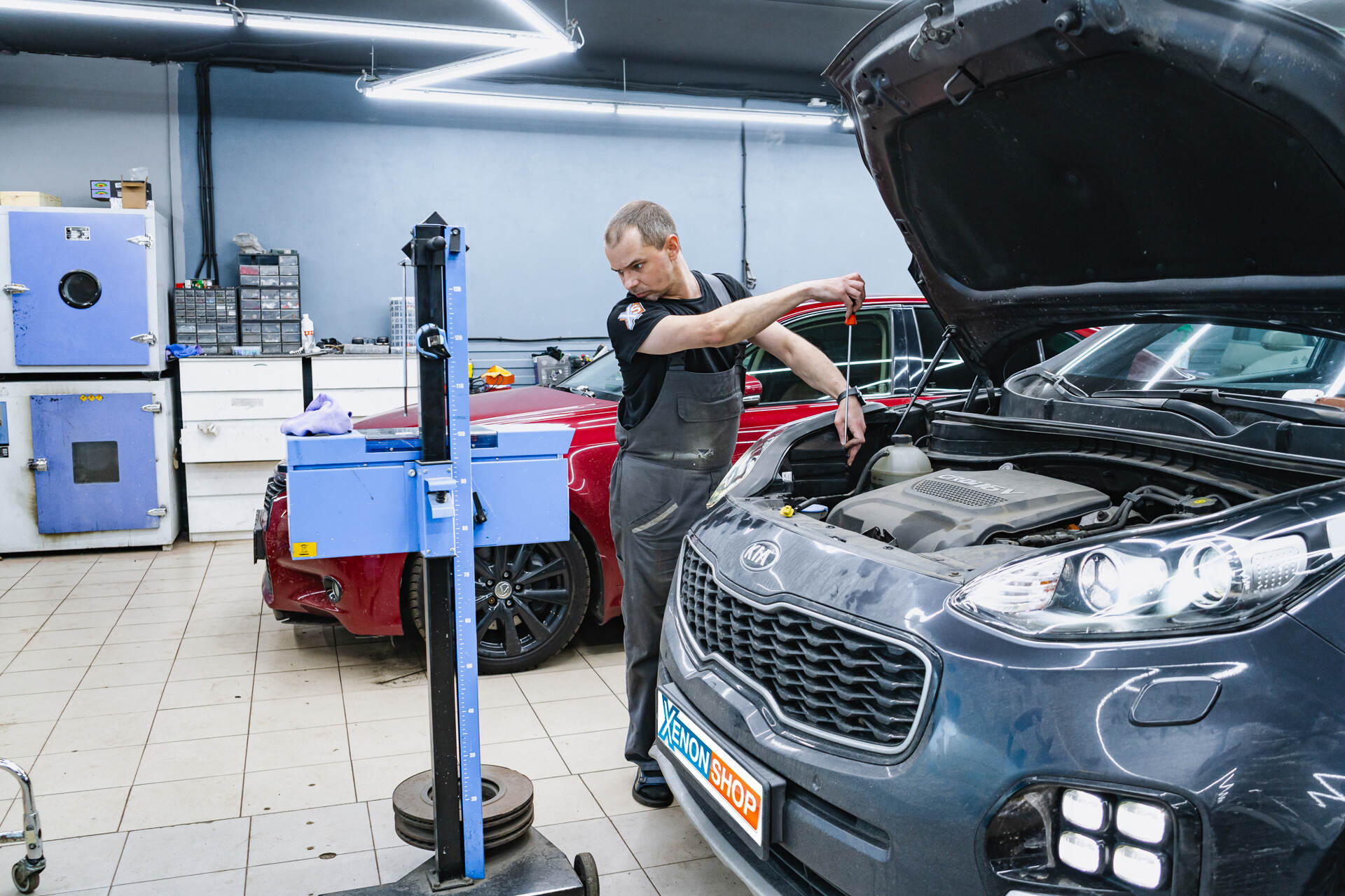В наш автосервис поступил автомобиль Kia Sportage, владелец которого пожелал произвести тюнинг фар, а именно поменять заводские хромированные отражатели на крашенные в черный цвет, и также установить светодиодные лампы XS-Light LED HD3 HB3 5000K, излучающие чисто-белый свет. Старые лампы, находившиеся в фарах в момент обращения, перестали устраивать владельца авто своей яркостью, ну а новый отражатель – просто часть общего стиля автомобиля. Так как мы будем разбирать фары, то заодно приведем их в порядок, а именно почистим щелочью изнутри и отполируем снаружи.