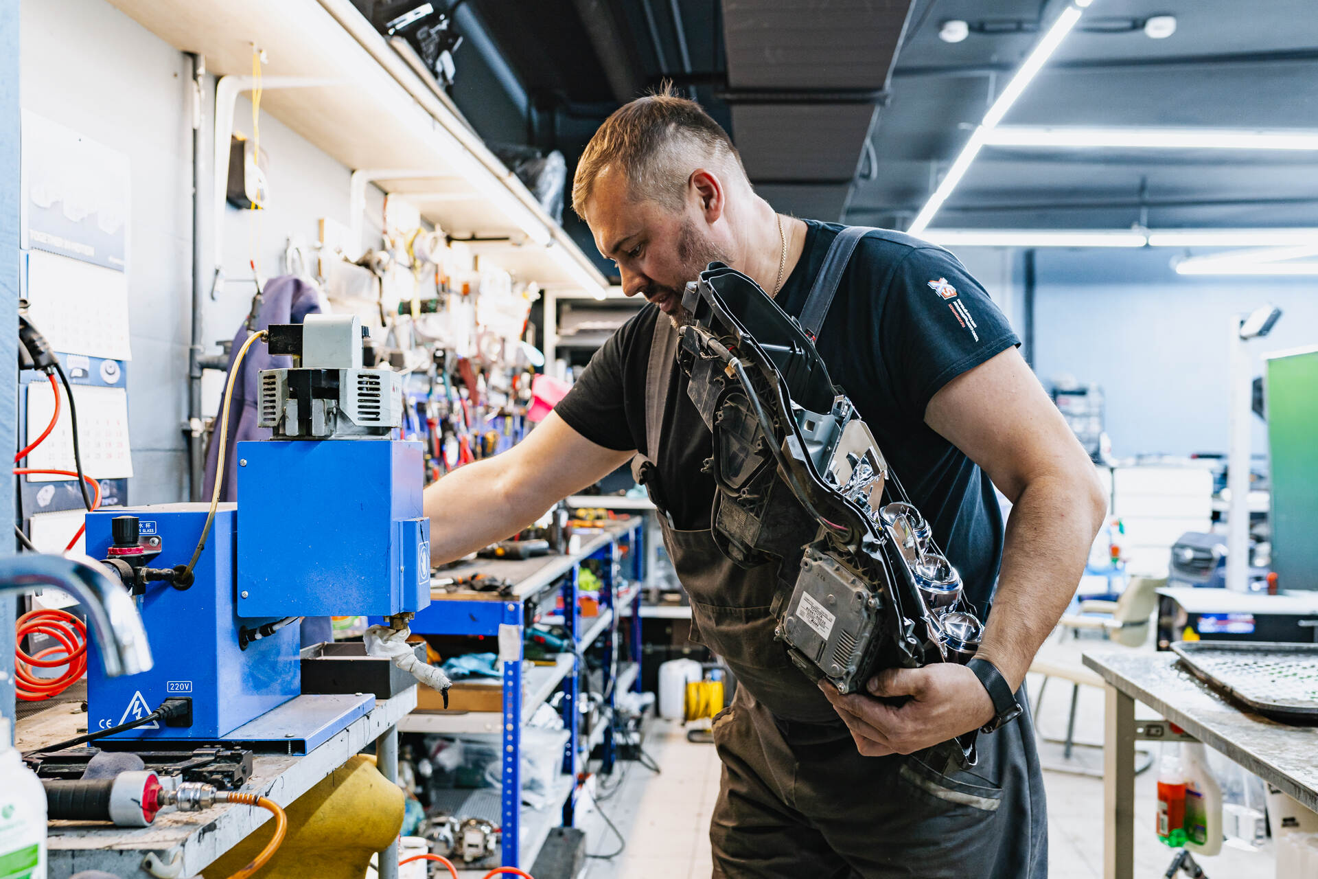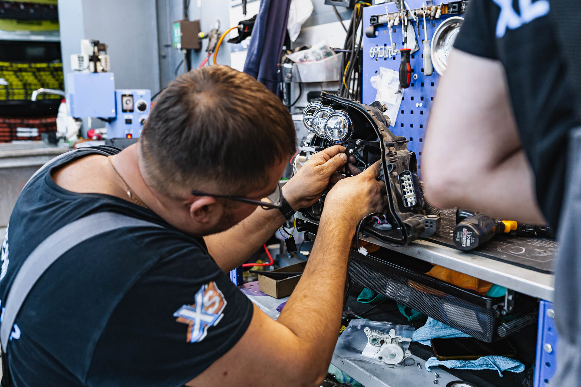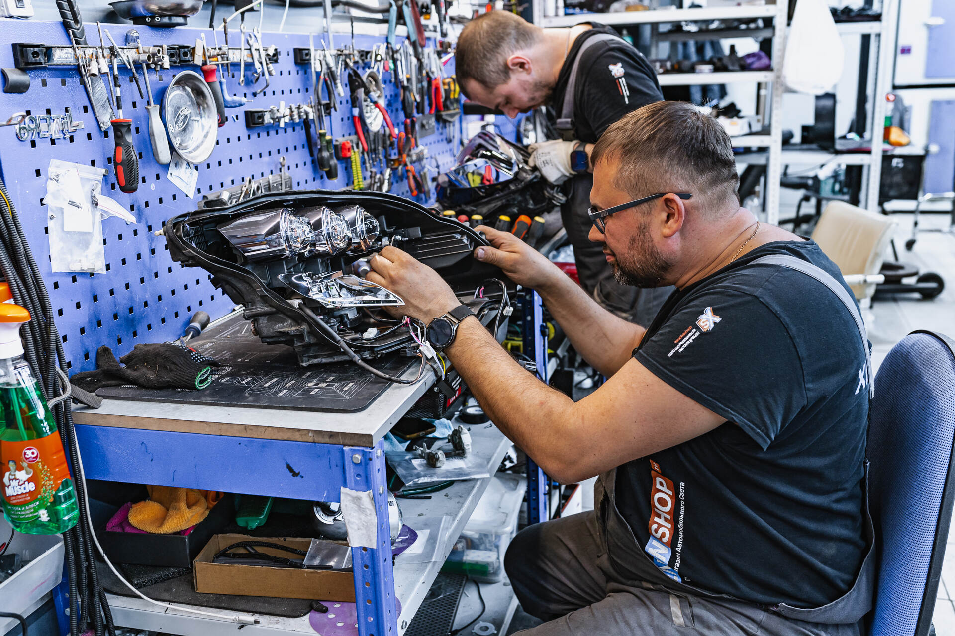 Разбираем фары. Запаиваем трещину в корпусе фары.Замена линз в фарах Лексус ЛС обычно занимает полный рабочий день: автомобиль поступает к нам утром, а к вечеру клиент забирает его с совершенно другим, обновленным автосветом. Работы начинаются с разборки передней части: мы снимаем бампер, демонтируем обе фары и помещаем их в промышленную печь для аккуратной разгерметизации. После вскрытия корпусов из них извлекается старая оптика, а на её место с помощью специальных переходных рамок монтируются новые светодиодные линзы Vision Tri-led Ultimate Series 4300K. Параллельно мы проводим внутреннюю очистку стёкол фар щелочным составом для удаления загрязнений и улучшения светопропускания, а в завершение всей работы выполняем их внешнюю полировку для идеальной прозрачности. Дополнительно мы запаяли довольно крупную брешь в корпусе правой фары.