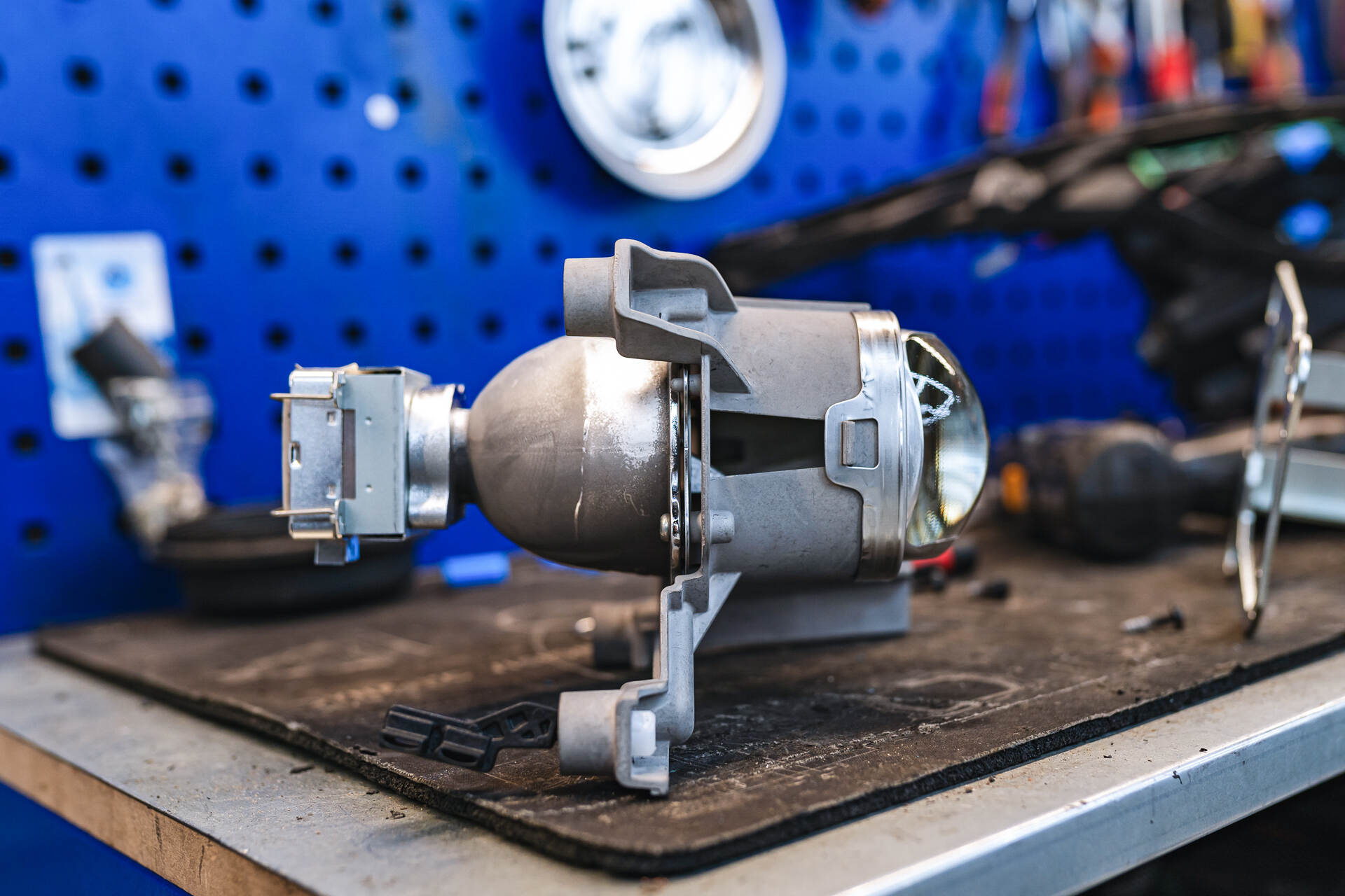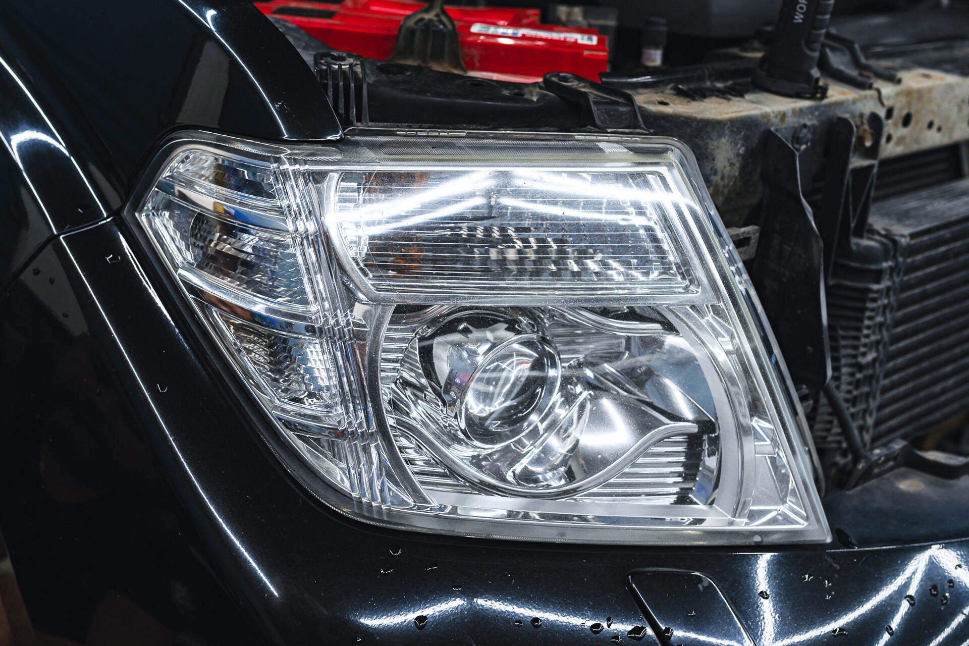 Демонтируем фары и дефектуем их.В рамках данного проекта мы выполним замену штатных ксеноновых линз в фарах Hyundai Santa Fe (2014) на современные светодиодные модули Vision TRI-LED Ultimate Series Soft. Эти линзы создают мощный световой поток с температурой 4800K, обеспечивая чистый белый свет. Со временем заводская оптика выгорает, что вызывает закономерный дискомфорт при ночном вождении, и без вмешательства ситуация будет только ухудшаться вплоть до полной деградации освещения — данный процесс является естественным для любой штатной оптики. Следует учитывать, что линзы представляют собой расходный материал, который неизбежно потребует замены в зависимости от интенсивности эксплуатации автомобиля.