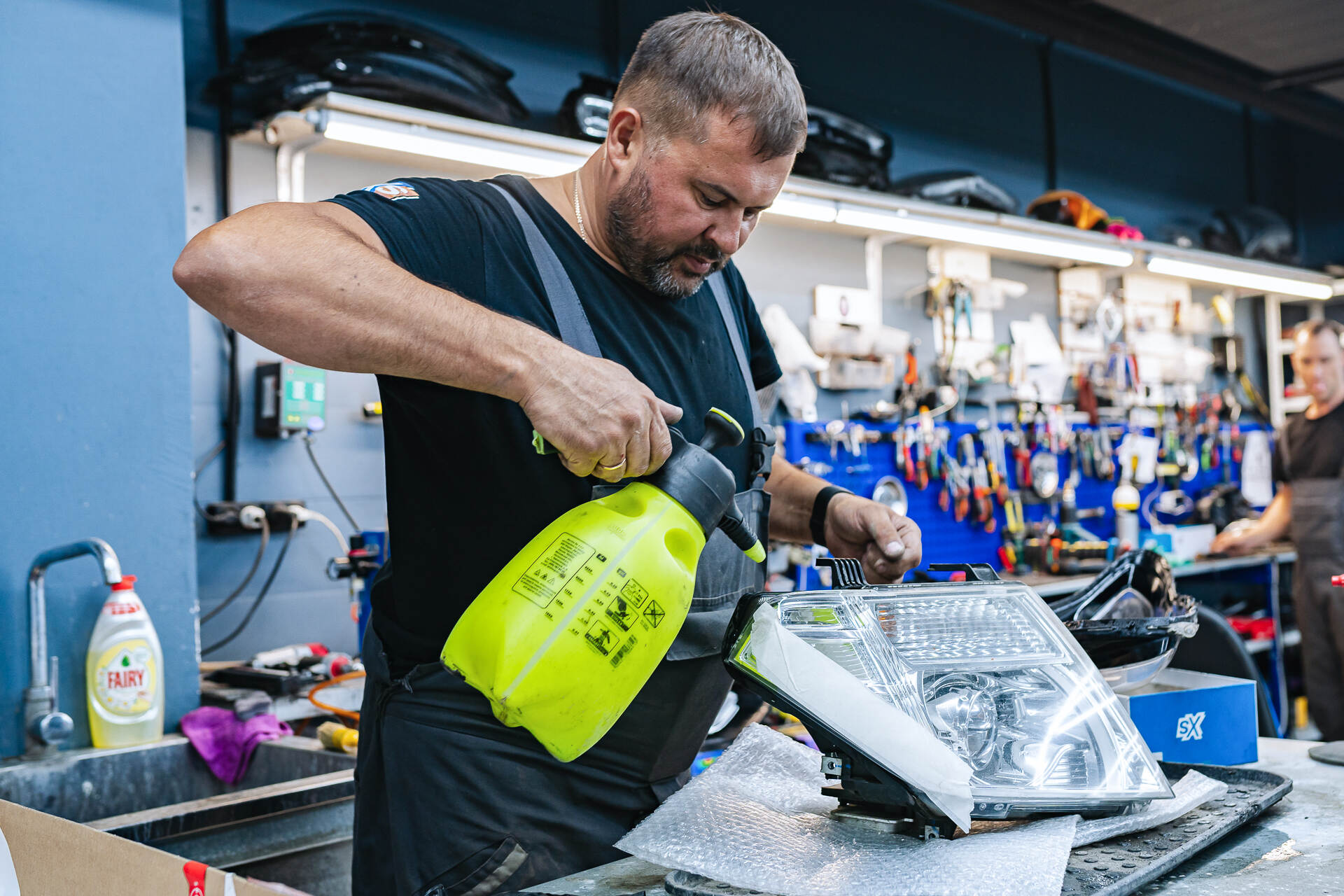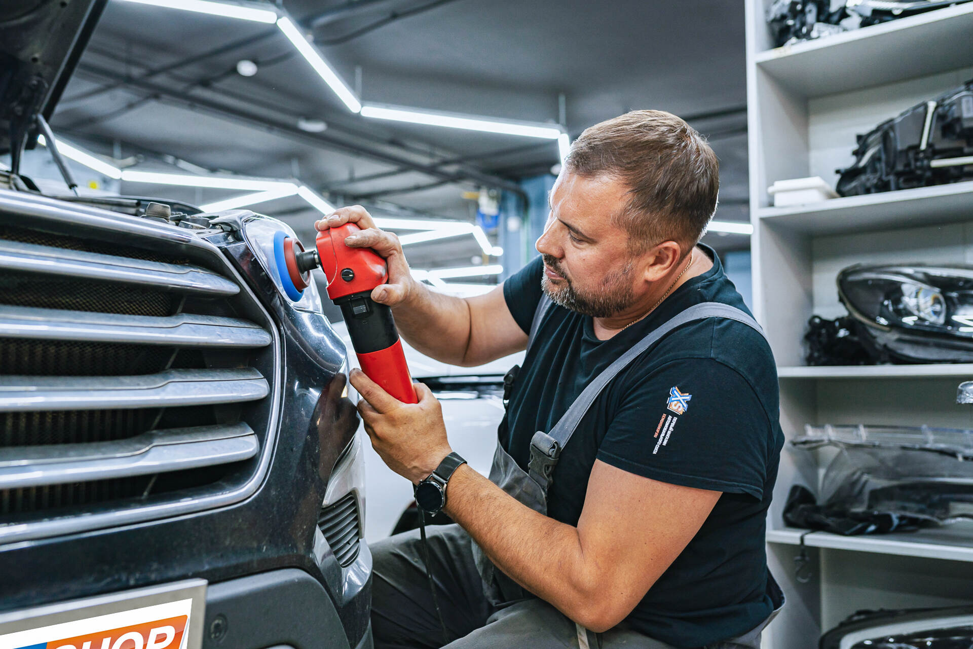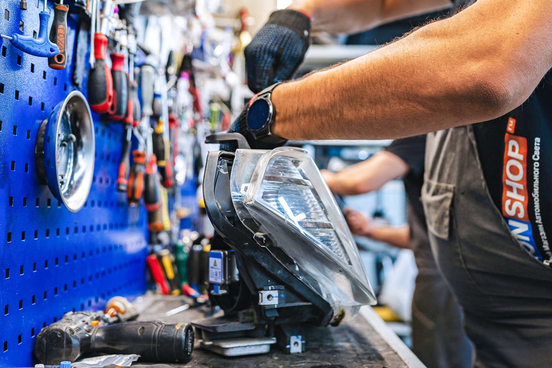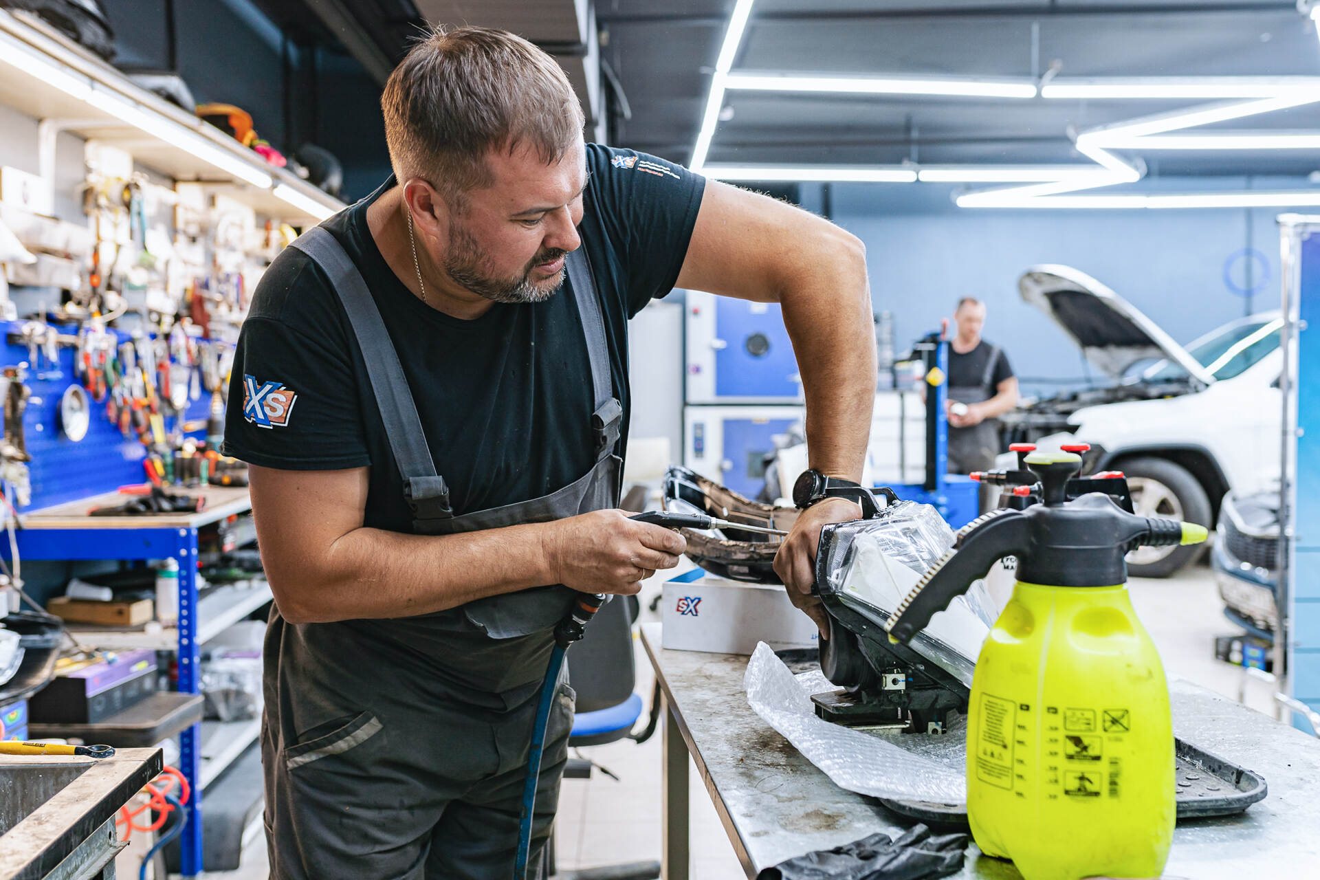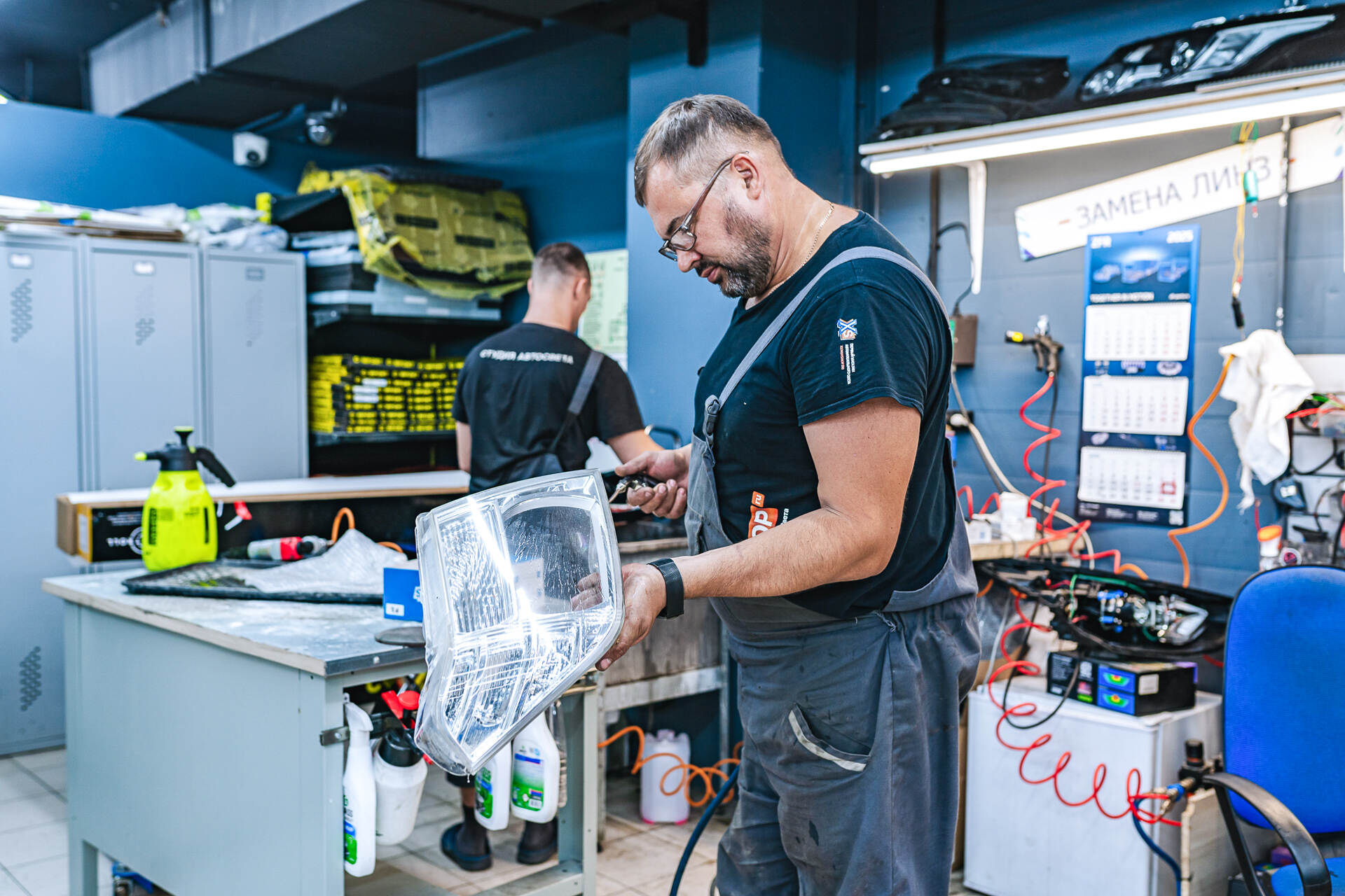 Полируем стекла фар.В нашем автосервисе Вы можете заказать не только замену ламп, но и произвести замену или ремонт фар и отдельных элементов автомобильного освещения, а также установить парктроники или наклеить тонировочную пленку быстро, качественно и недорого – обращайтесь!