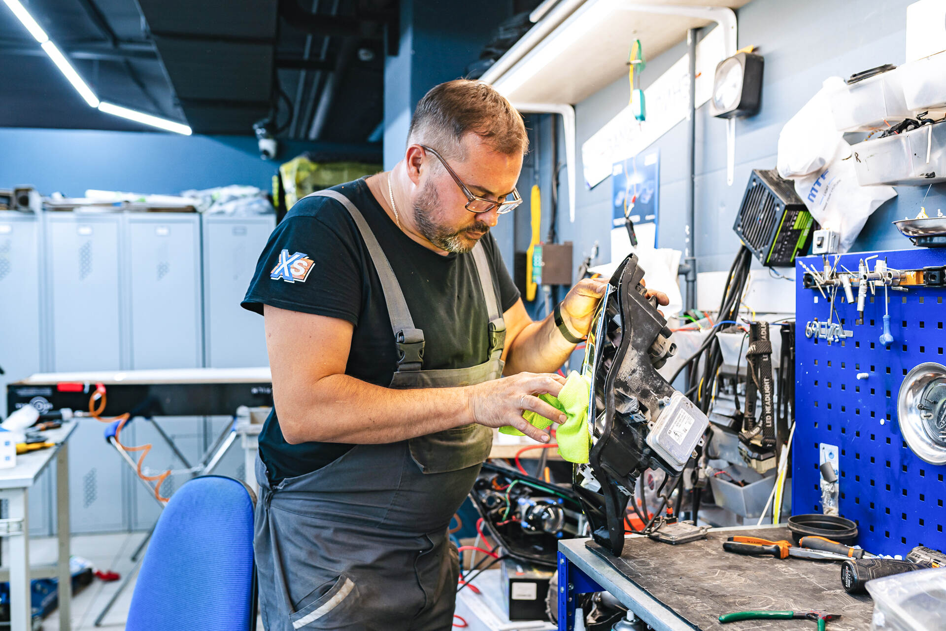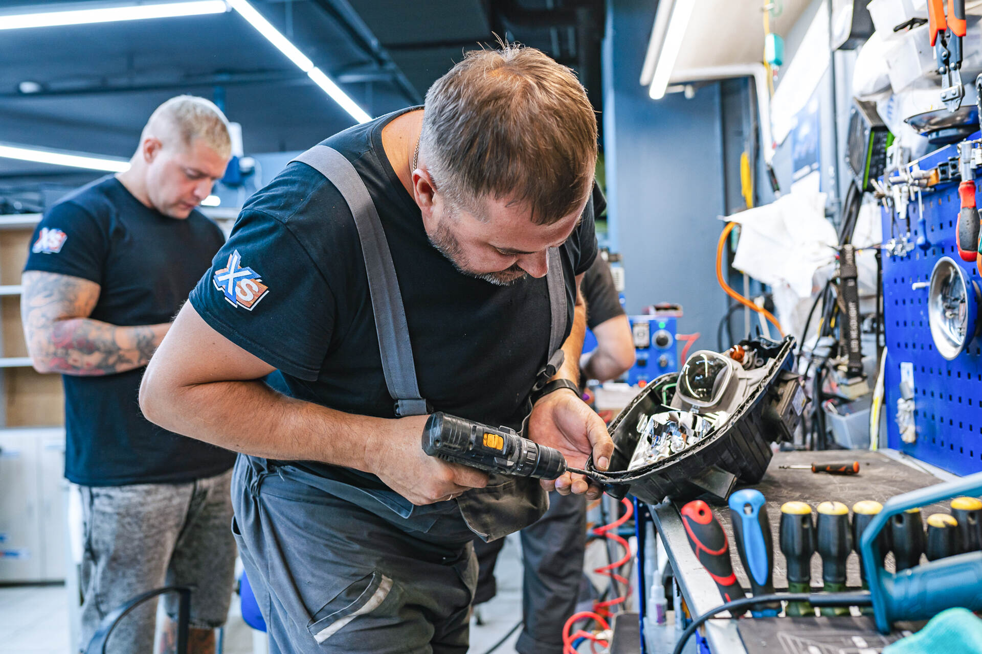 Устанавливаем новые линзы в фары.После установки новых линз производится сборка фар с применением бутилового герметика, по мере его полимеризации автомобиль собирается окончательно. Следующим этапом становится точная регулировка светового пучка по высокоточному прибору, позволяющая сформировать безупречно ровную светотеневую границу. Завершающий момент – полировка внешней поверхности стекол до идеального состояния, что обеспечивает беспрепятственное прохождение светового потока от линз Vision TRI-LED Ultimate Series Soft 4800K без каких-либо искажений, что позволяет достичь максимально возможной яркости освещения.