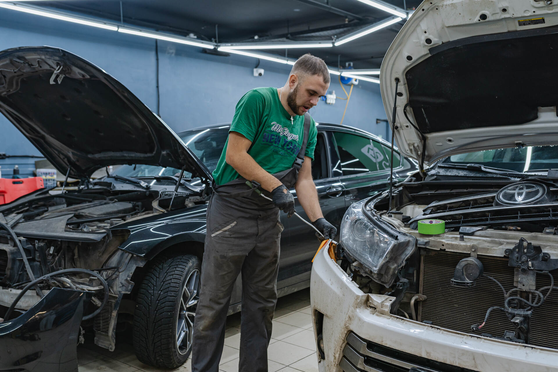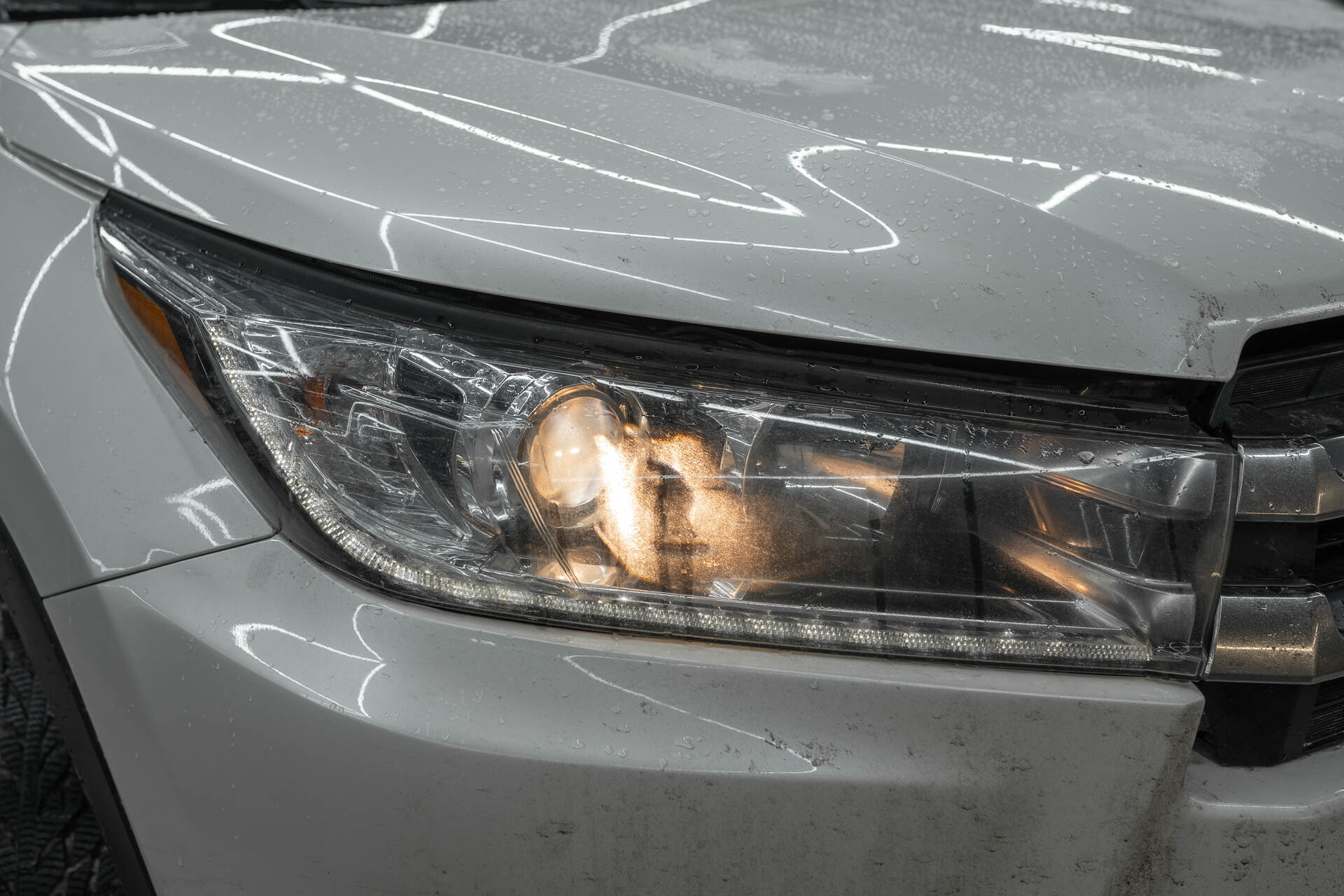 Установка новых линз в фары.Параллельно с заменой линз мы очистили внутреннюю поверхность стекол фар щелочным раствором, что эффективно удалило налет и восстановило им светопропускание. Такая процедура индивидуальна: автомобилям с малым пробегом она требуется редко, но в данном случае была необходима для достижения максимального результата. После сборки фар на свежий герметик и его полной полимеризации оптика возвращается на Toyota Highlander. Завершающим этапом становится регулировка светового потока и финишная внешняя полировка стекол – этот комплекс мер гарантирует безупречную прозрачность, позволяя новым светодиодным модулям работать с максимальной отдачей и обеспечивать идеальную видимость на дороге.