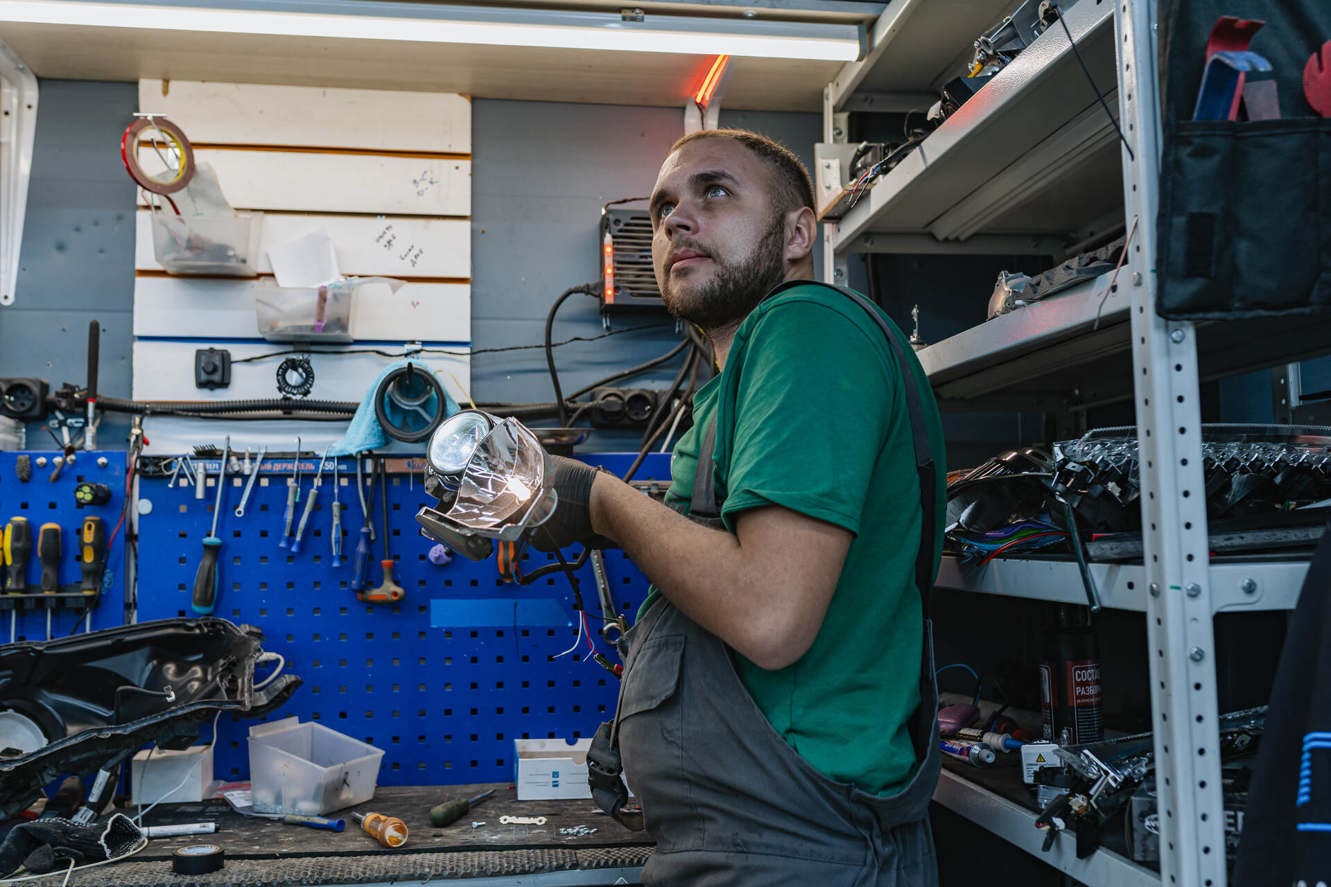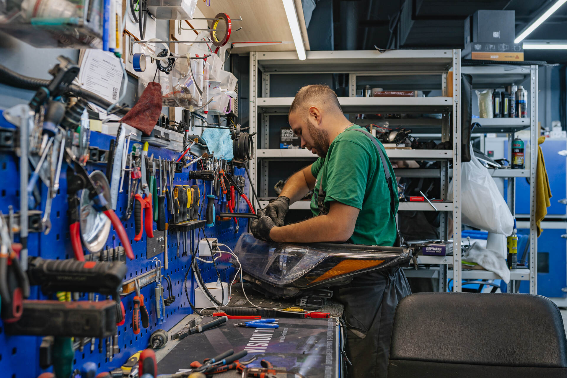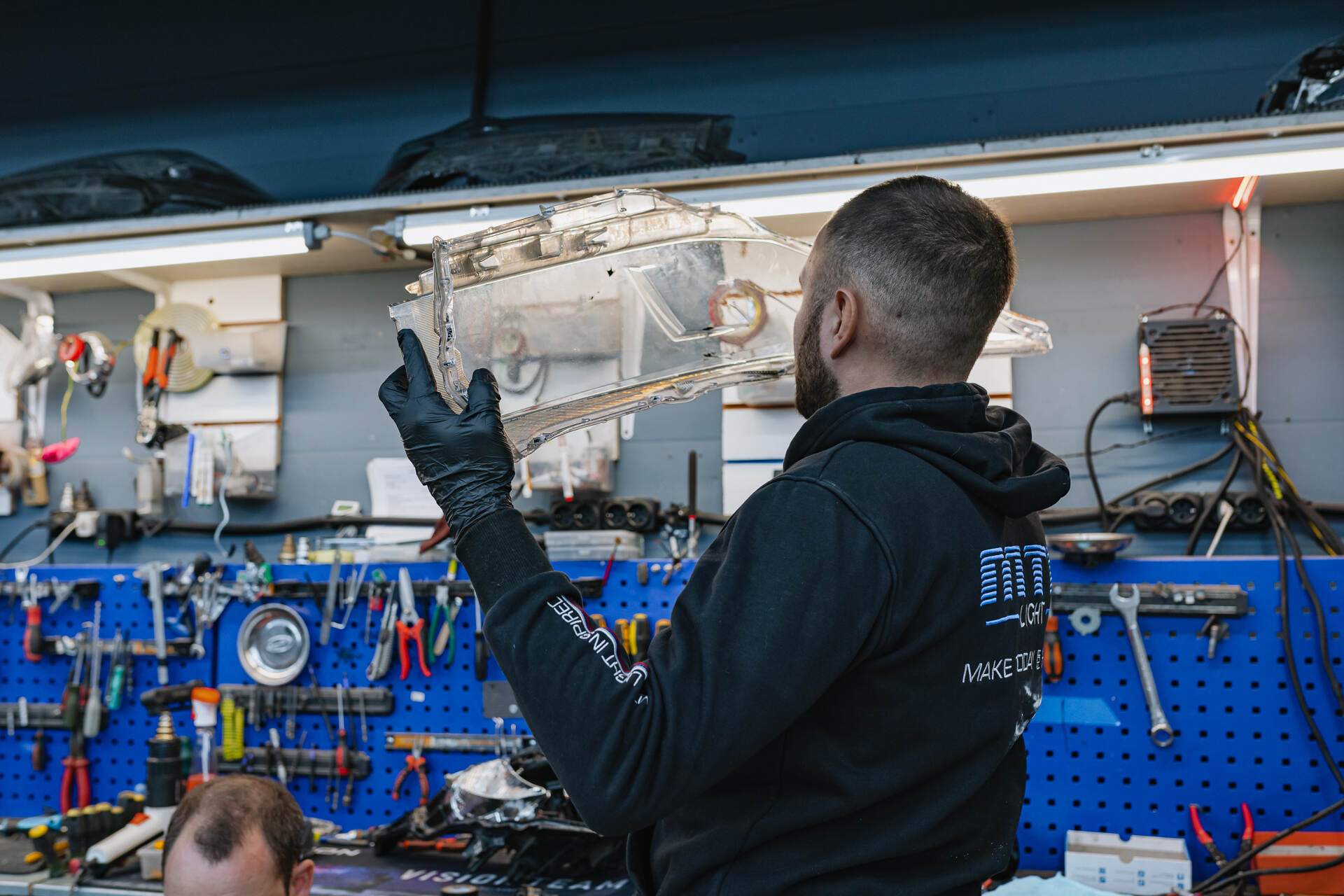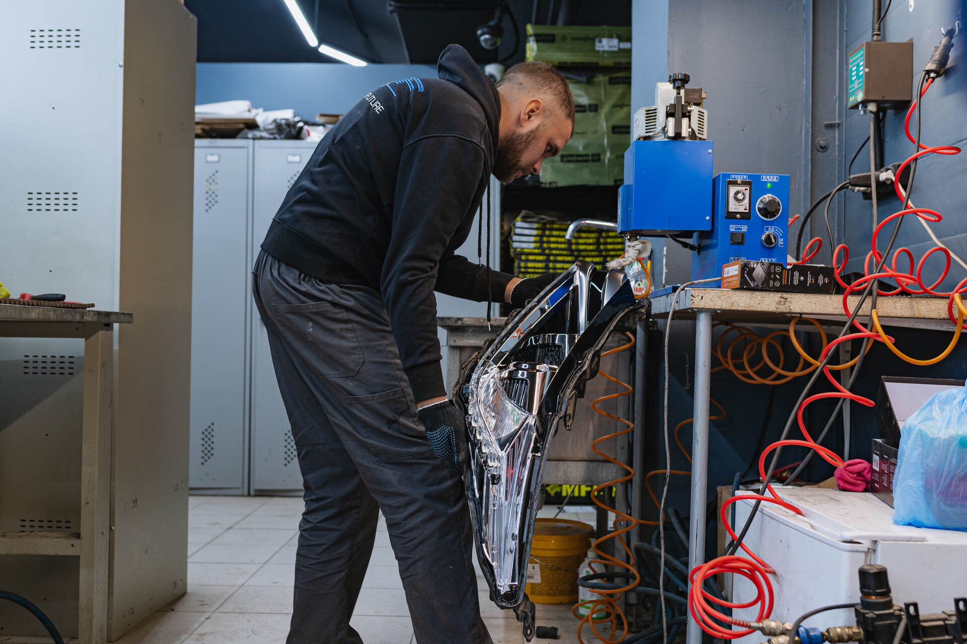 Демонтаж и разбор фар.Замена линз Тойота Хайлендер начинается с демонтажа бампера и извлечения фар, которые направляются в промышленную печь для их дальнейшего разбора. Под воздействием высокой температуры заводской герметик размягчается, позволяя аккуратно отделить стекла от корпусов. После демонтажа изношенных ксеноновых модулей мы устанавливаем светодиодные линзы Vision Avantgarde, используя специальные переходные рамки для точной фиксации. Обычно весь процесс занимает один рабочий день, так как замена линз у нас отработана до автоматизма, особенно если говорить про фары на температурном (как в этот раз), а не на стекольном герметике. Налаженные этапы тюнинга головного света позволяют мастерам работать максимально оперативно, сохраняя неизменно высокий уровень качества сборки и настройки обновленного автосвета.