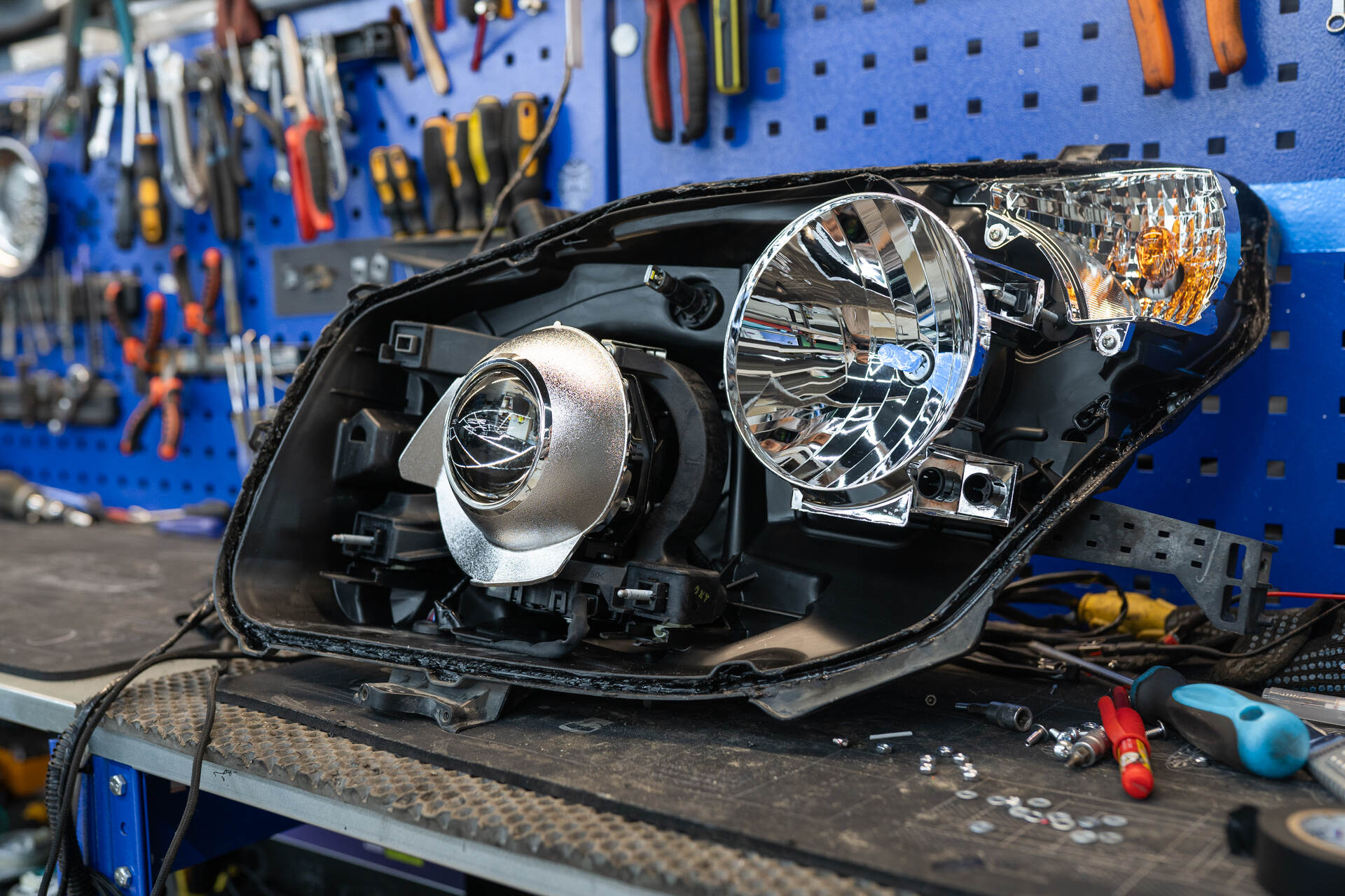 Герметизируем фары.После установки новых линз фары герметизируются бутиловым (температурным) герметиком, и после его полимеризации автомобиль полностью собирается. На финальном этапе мы выполняем точную регулировку оптики по прибору (фараскоп), достигая безупречно ровной светотеневой границы. Завершающей процедурой становится внешняя полировка стекол до идеальной прозрачности, что обеспечивает беспрепятственное прохождение светового потока от линз Vision Avantgarde без искажений и потерь, что позволяет раскрыть максимальный потенциал яркости обновленной оптики.