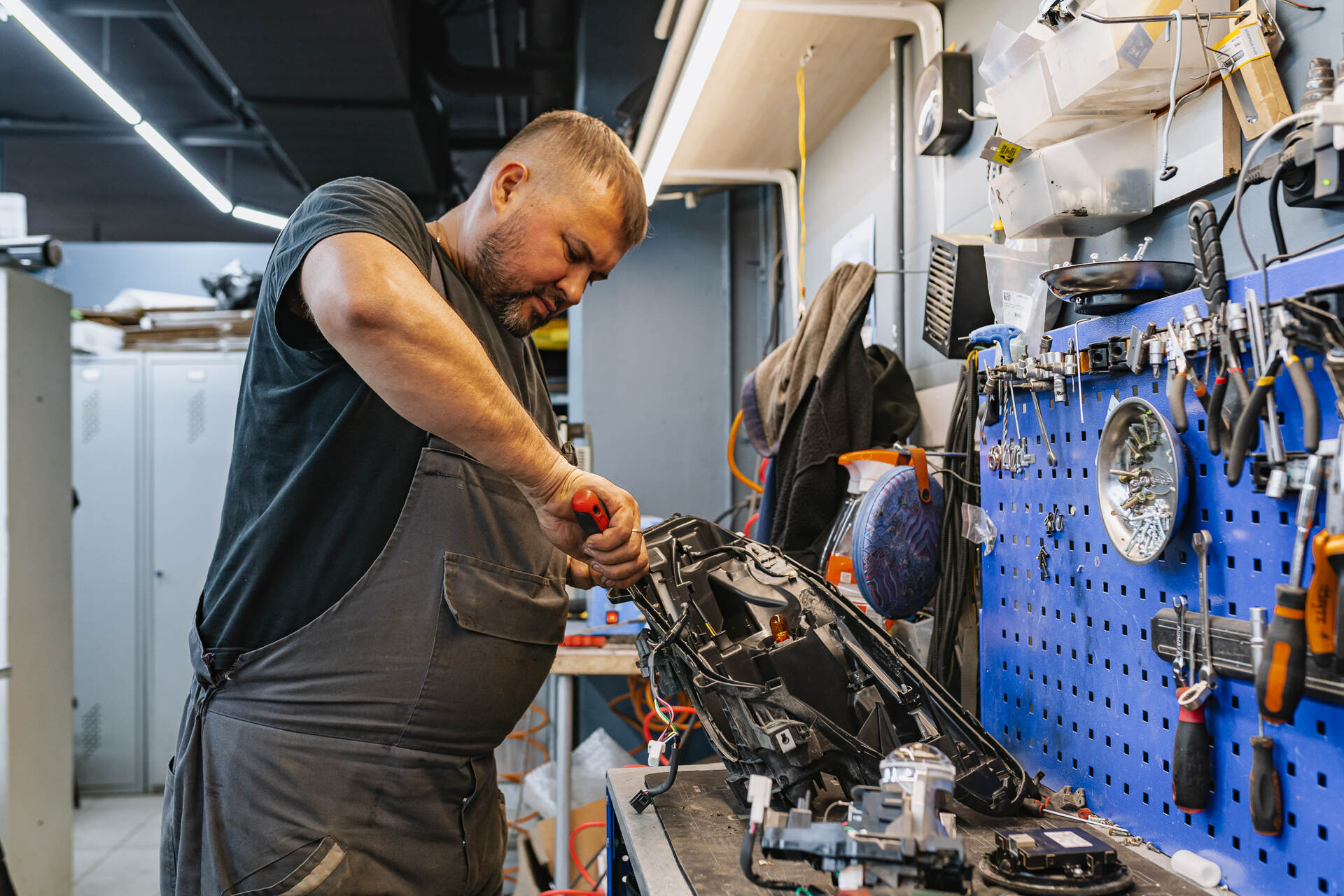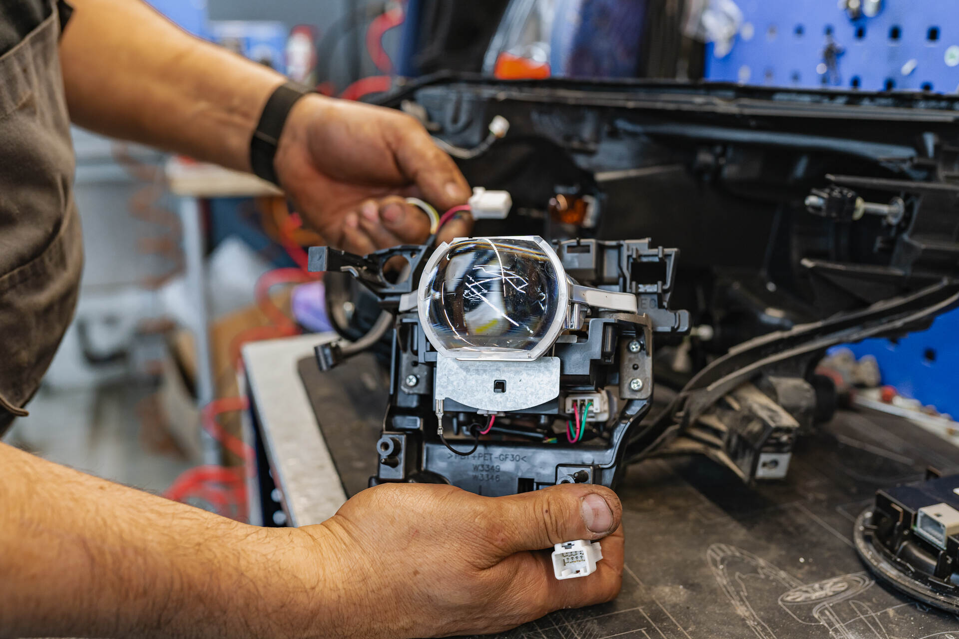 Установка новых линз в фары. Собираем автомобиль после замены линз в фарах.Замена линз Тойота РАВ4 выполняется за один рабочий день: если мы принимаем автомобиль утром, то обычно вечером уже отдаём владельцу с обновлённым головным светом. Хотя в редких случаях возможны корректировки графиков, наши специалисты всегда остаются на связи с заказчиком. Сам по себе процесс замены линз начинается с демонтажа бампера и извлечения фар, которые затем направляются в промышленную печь для размягчения герметика. После вскрытия корпусов мы удаляем старые выгоревшие галогенные модули и устанавливаем светодиодные линзы Vision TRI-LED Ultimate Series Soft 4800K, используя для надежной фиксации специальные переходные рамки.