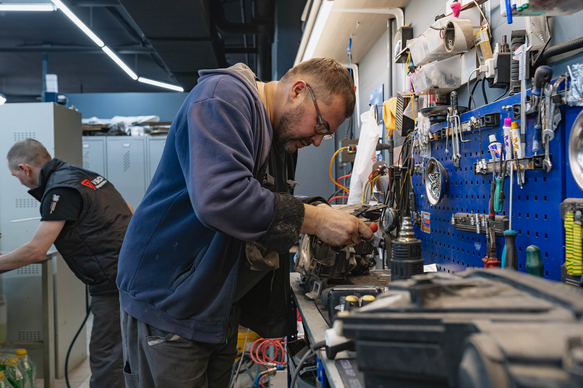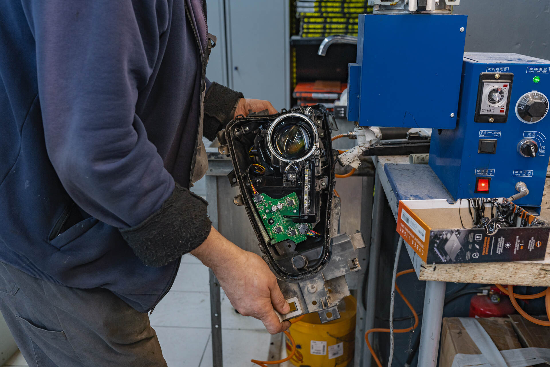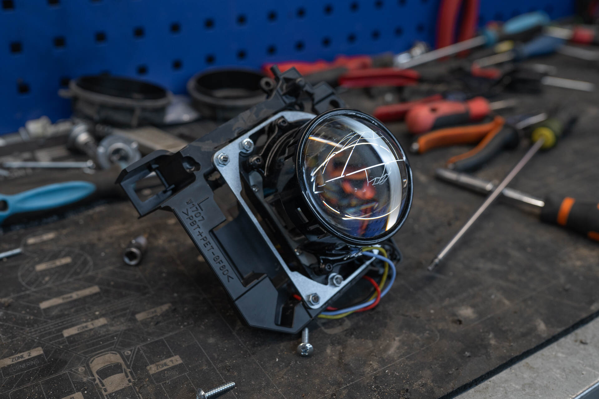 Процесс замены штатных линз на новые LED-модули.