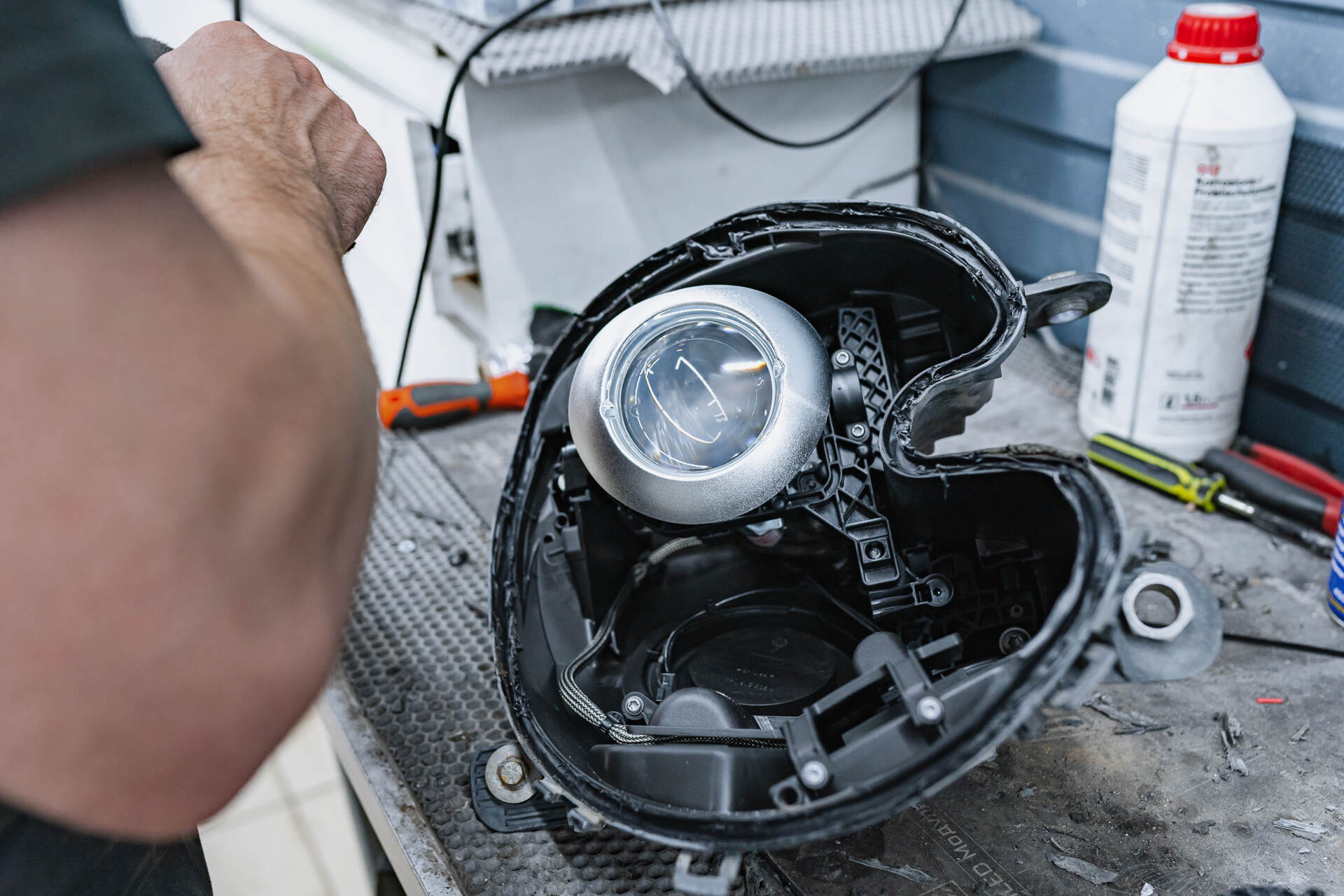 Замена линз Мини Купер в среднем занимает один рабочий день: мы принимаем автомобиль утром и возвращаем его владельцу к вечеру с полностью обновленным светом; более точные сроки всегда обговариваются с клиентом отдельно. Процесс замены начинается с демонтажа бампера и прогрева фар в промышленной печи для их бережной разгерметизации. После вскрытия корпусов мы извлекаем изношенную ксеноновую оптику и с помощью переходных рамок интегрируем светодиодные линзы Vision TRI-LED Ultimate Series Soft 4800K. Чтобы обеспечить максимальную прозрачность, стекла фар проходят тщательную химическую очистку изнутри щелочным раствором, а на финальном этапе работы выполняется их внешняя профессиональная полировка.