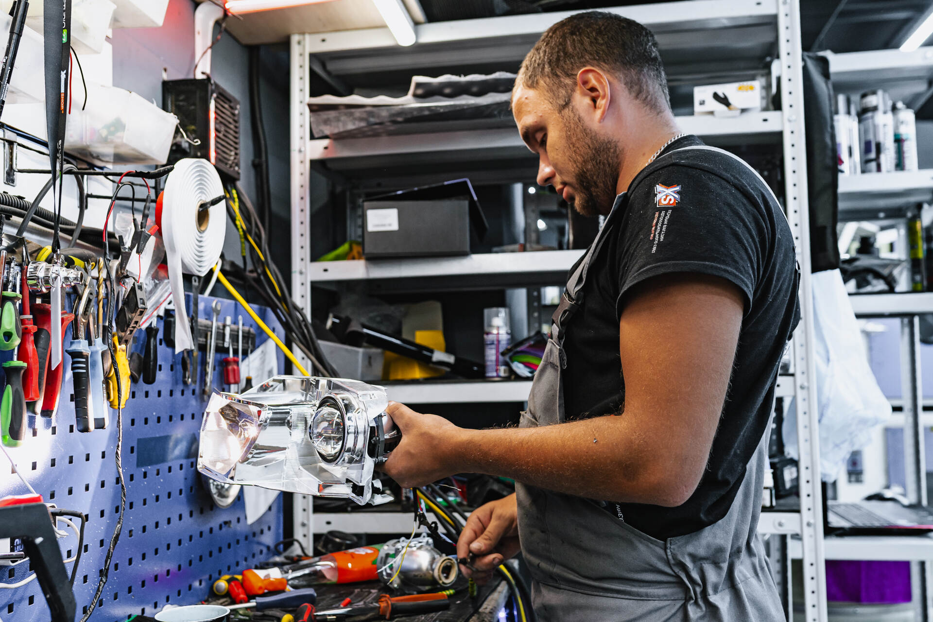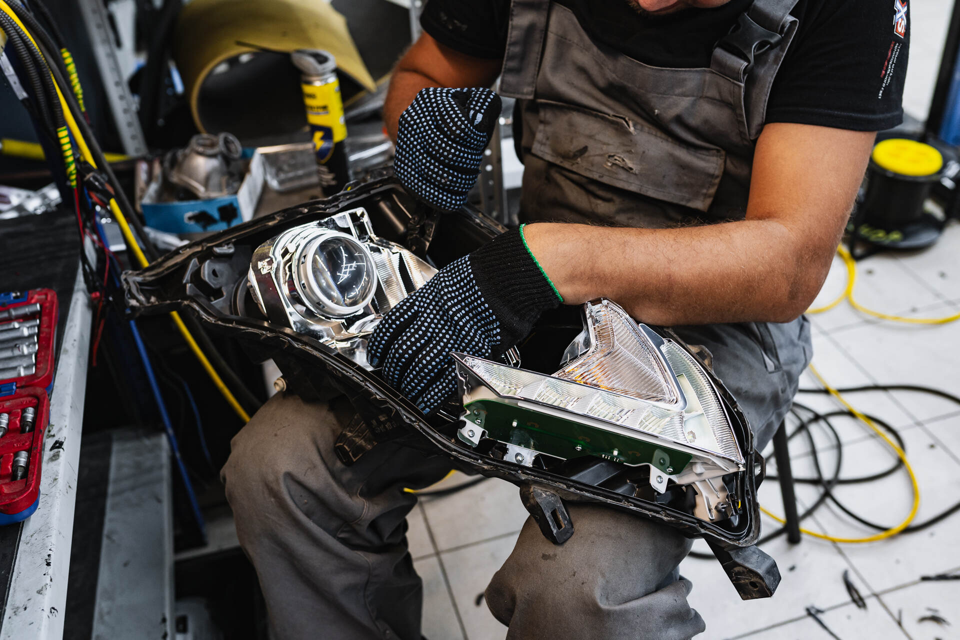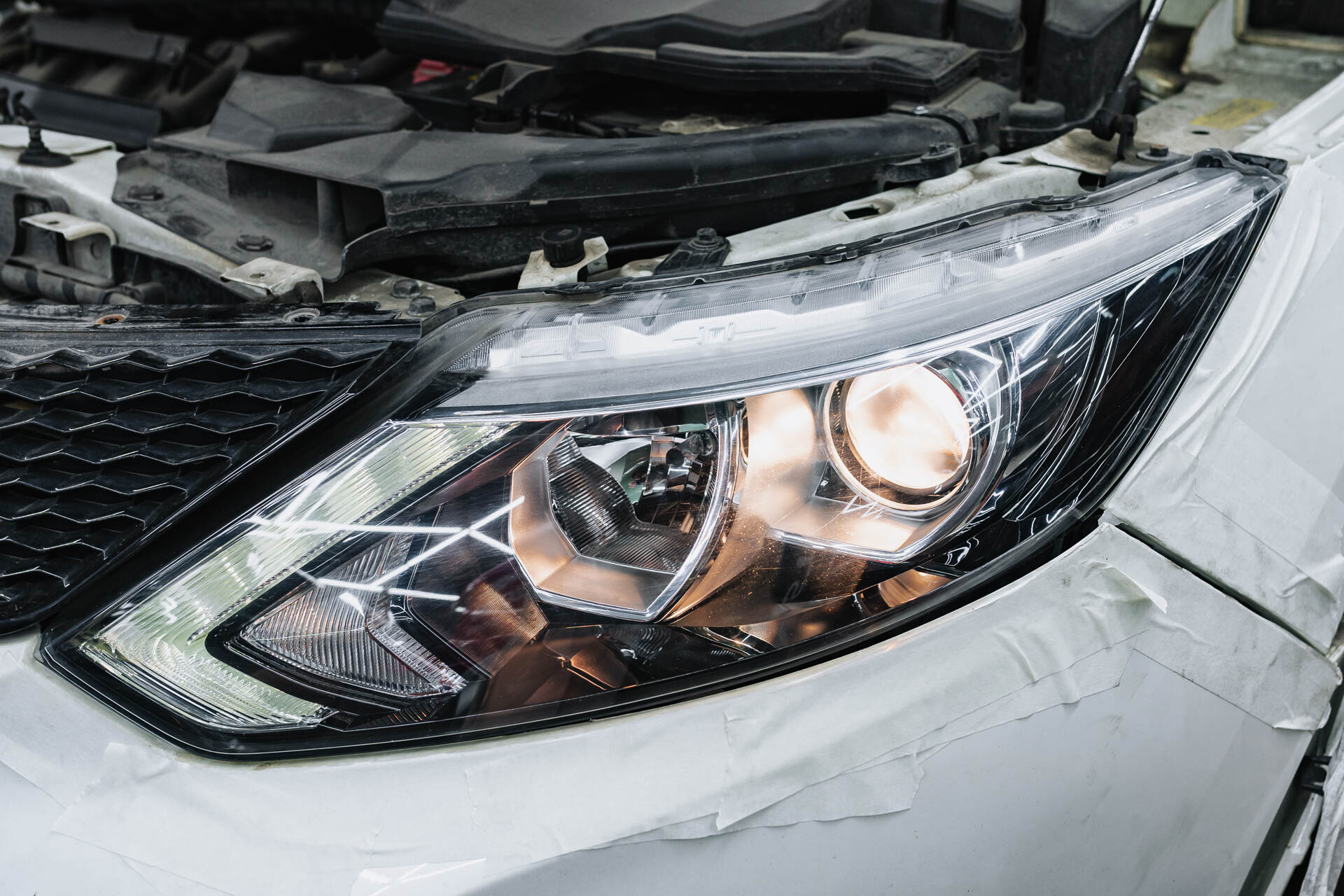 Демонтаж фар с автомобиля и их разбор.Замена линз на Ниссан Кашкай занимает полный рабочий день. Автомобиль поступает в наш цех утром, а к вечеру клиент уже забирает его с полностью обновлённым светом. Работы начинаются со снятия бампера и демонтажа фар, которые затем помещаются в промышленную печь для разогрева и разгерметизации. После вскрытия из фар извлекаются старые заводские линзы. Для монтажа новых светодиодных модулей Vision Tri-led Ultimate Series 4300K мы используем специальные переходные рамки, что позволяет избежать механической доработки посадочных мест. Перед окончательной сборкой фары временно устанавливаются на автомобиль для точной регулировки, что позволяет добиться от новых LED-линз идеально ровной светотеневой границы.