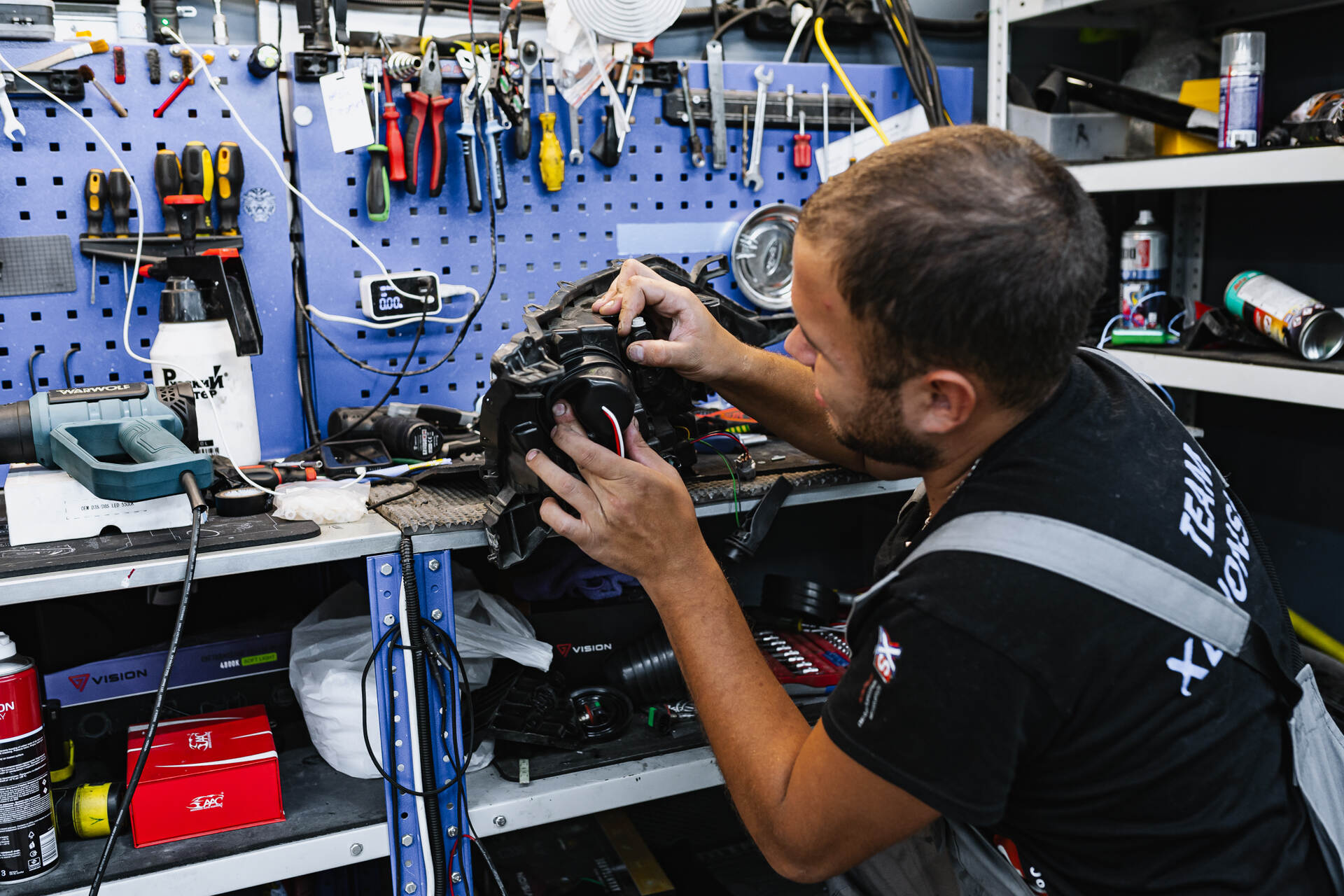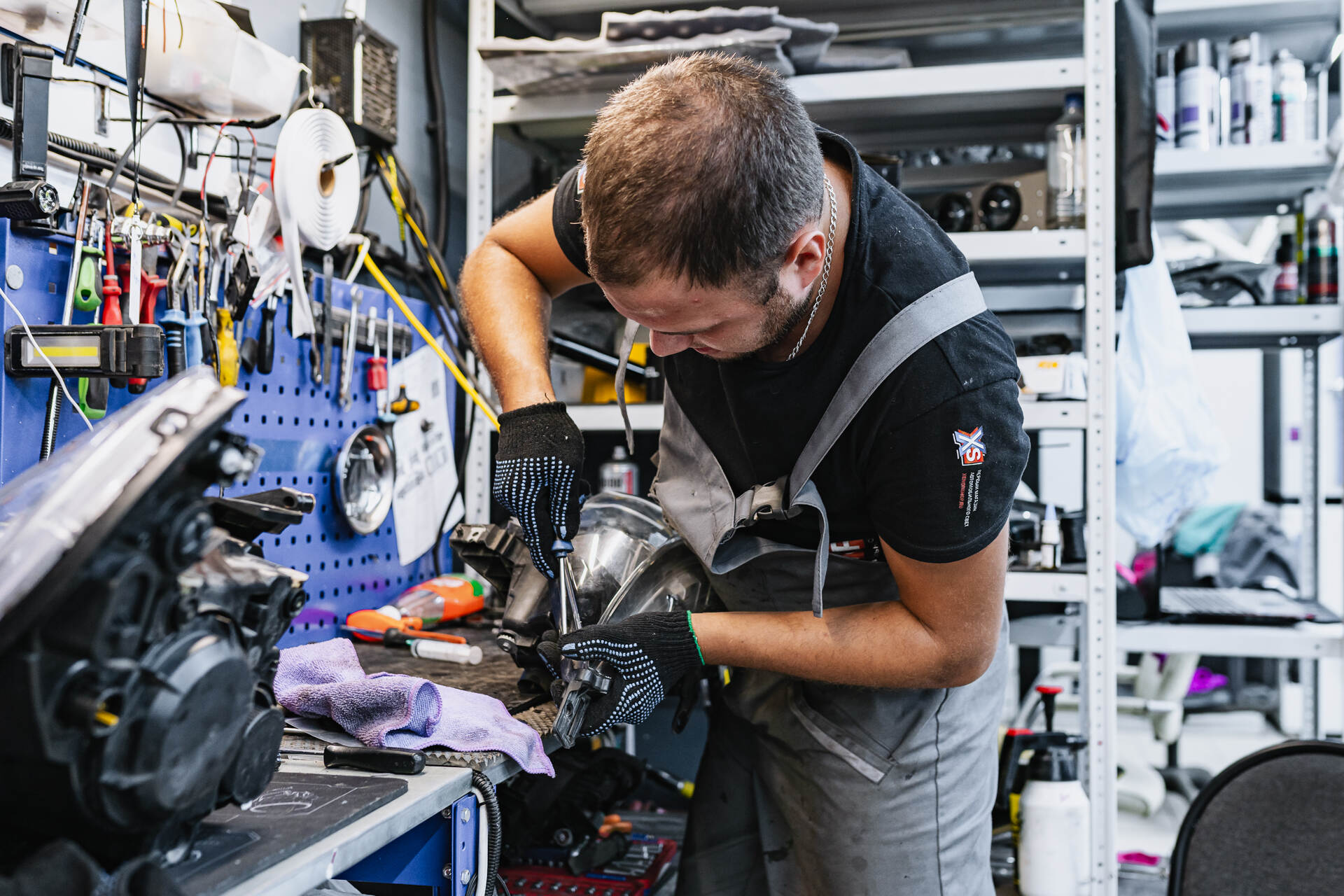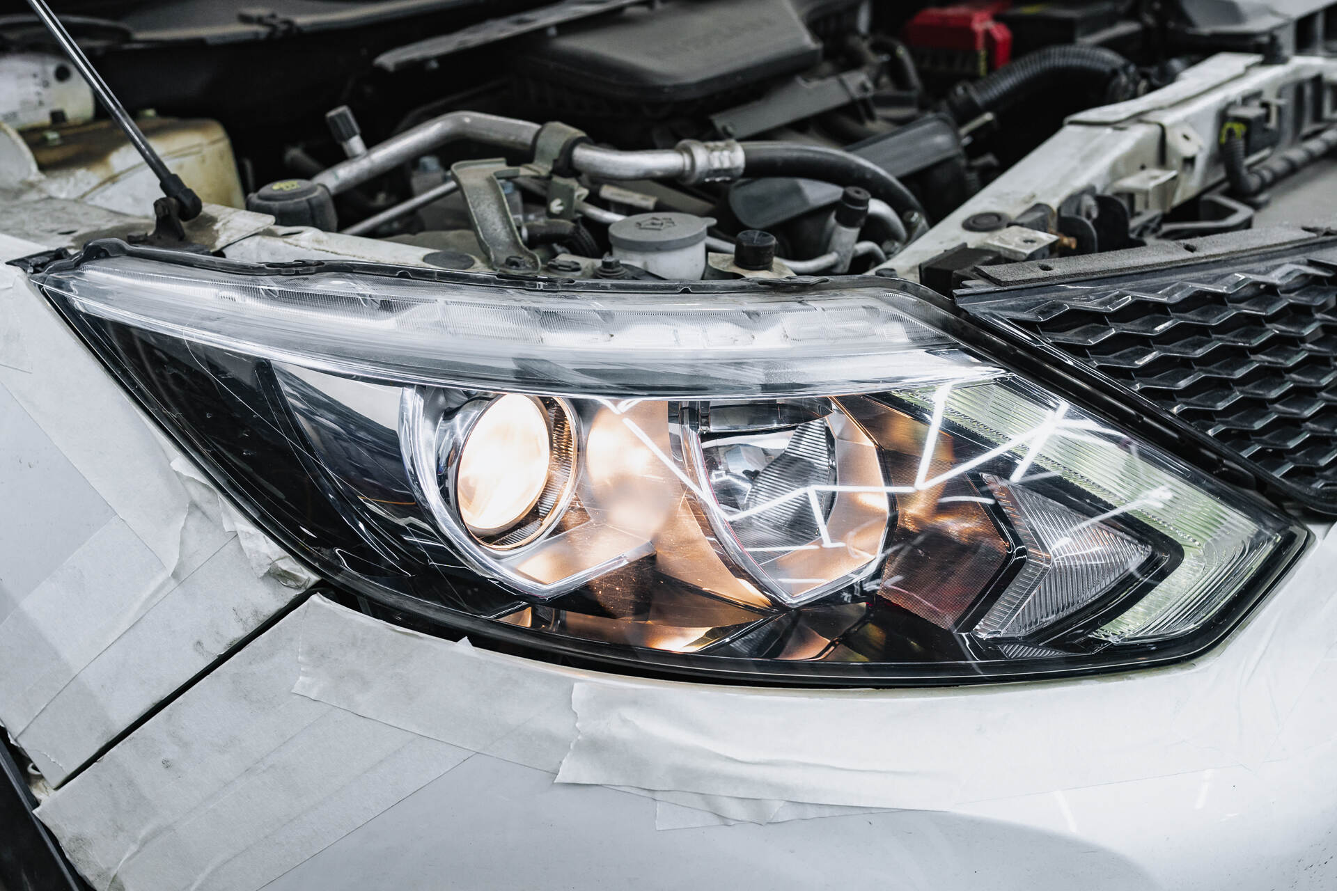 Демонтаж фар с автомобиля и их разбор.Замена линз на Ниссан Кашкай занимает полный рабочий день. Автомобиль поступает в наш цех утром, а к вечеру клиент уже забирает его с полностью обновлённым светом. Работы начинаются со снятия бампера и демонтажа фар, которые затем помещаются в промышленную печь для разогрева и разгерметизации. После вскрытия из фар извлекаются старые заводские линзы. Для монтажа новых светодиодных модулей Vision Tri-led Ultimate Series 4300K мы используем специальные переходные рамки, что позволяет избежать механической доработки посадочных мест. Перед окончательной сборкой фары временно устанавливаются на автомобиль для точной регулировки, что позволяет добиться от новых LED-линз идеально ровной светотеневой границы.
