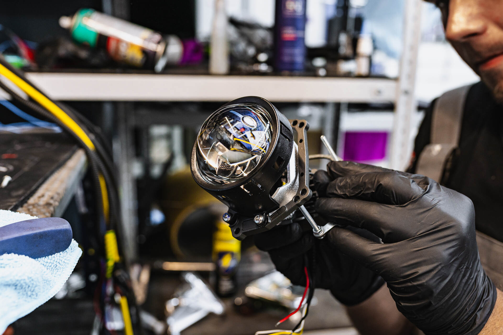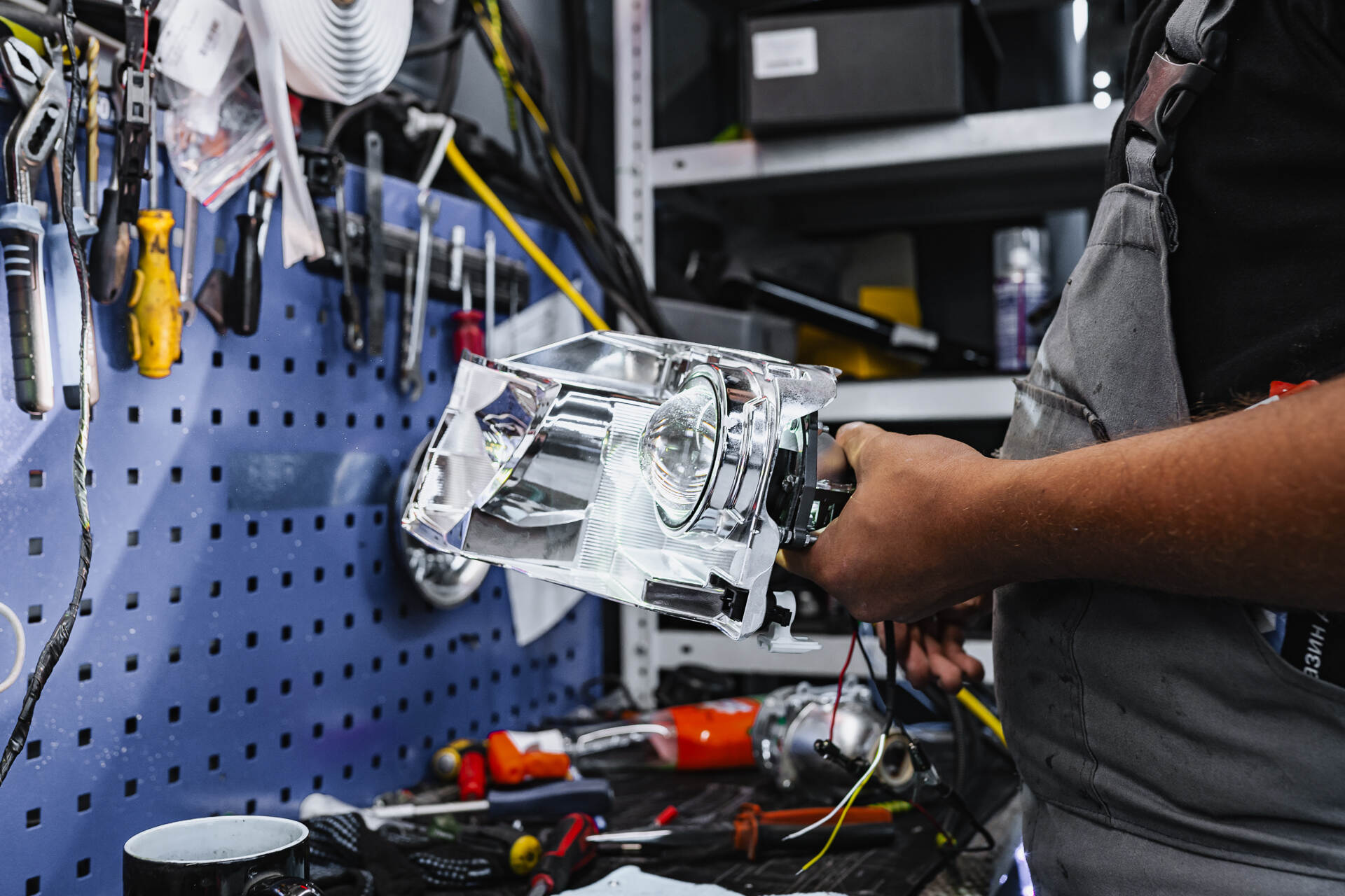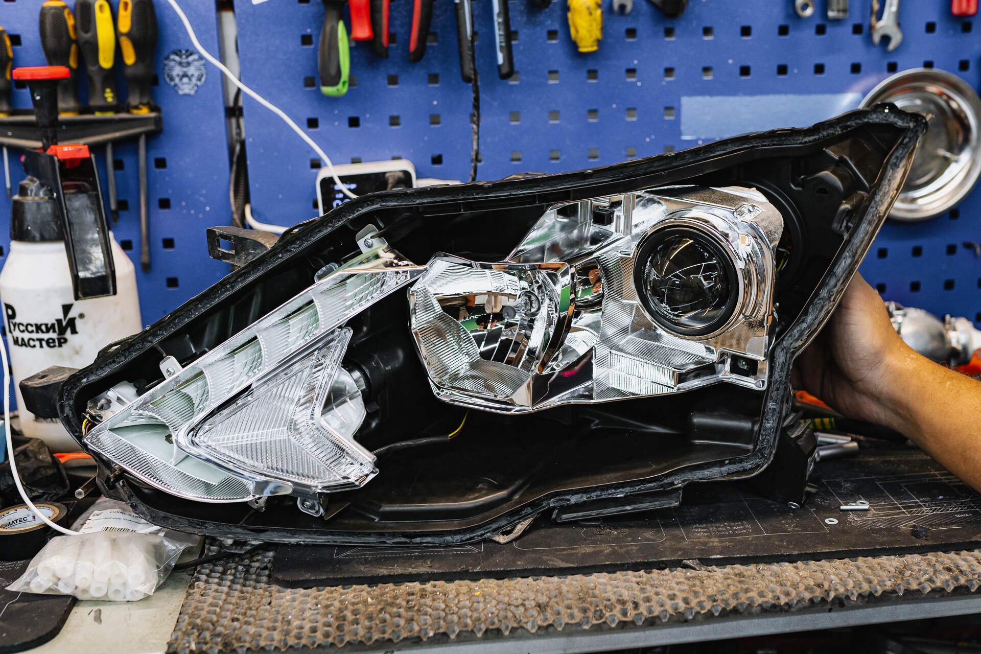 Установка новых линз в фары.Дополнительно мы выполнили внутреннюю очистку стекол фар специальными химическими составами для повышения их прозрачности и светопропускания. Также была заказана внешняя полировка, которую мы проведём в самом конце, уже после полной сборки автомобиля Nissan Qashqai (2015). Что касается текущего этапа работ, то после установки и предварительной настройки линз Vision Tri-led Ultimate Series 4300K автомобиль собирается. Затем выполняется финальная, точная регулировка оптики на регулировочном стенде по прибору, и уже после этого мы полируем стекла фар абразивными пастами, которые эффективно устраняют царапины и потертости с поверхности, возвращая им идеальную прозрачность.
