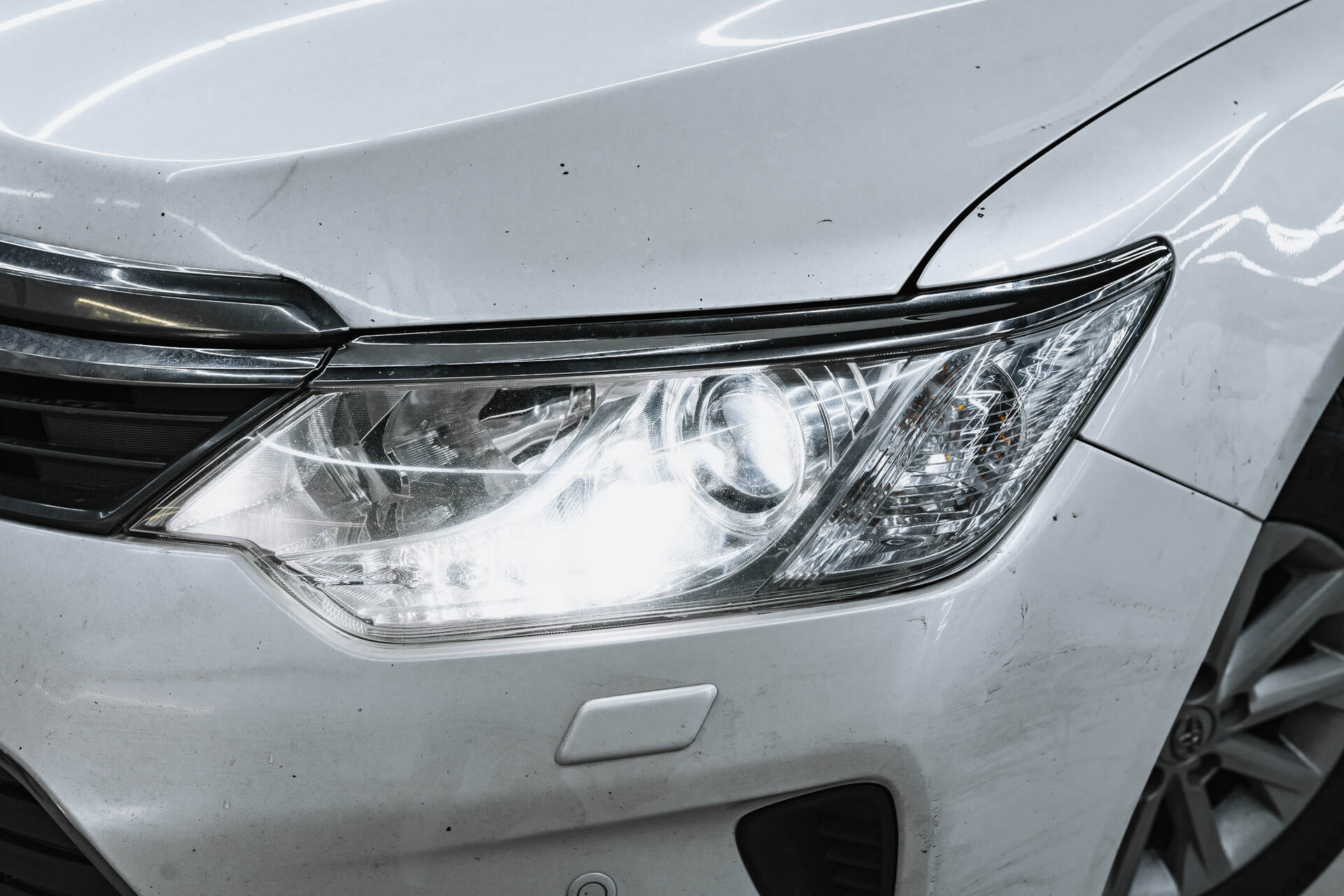 Регулируем новый автосвет и полируем стекла фар.В результате проведенных работ головной свет Toyota Camry V55 достиг максимальной интенсивности благодаря установке светодиодных линз Vision Avantgarde. Финальные фотографии демонстрируют высокую яркость головного света при минимальной паразитной засветке, что полностью исключает ослепление водителей встречного транспорта. Завершая наш материал, отметим эффект белого света фар: автомобиль любого возраста начинает восприниматься совершенно иначе — его облик наполняется строгостью и солидностью, что особенно выразительно подчеркивается на фоне белого кузова.