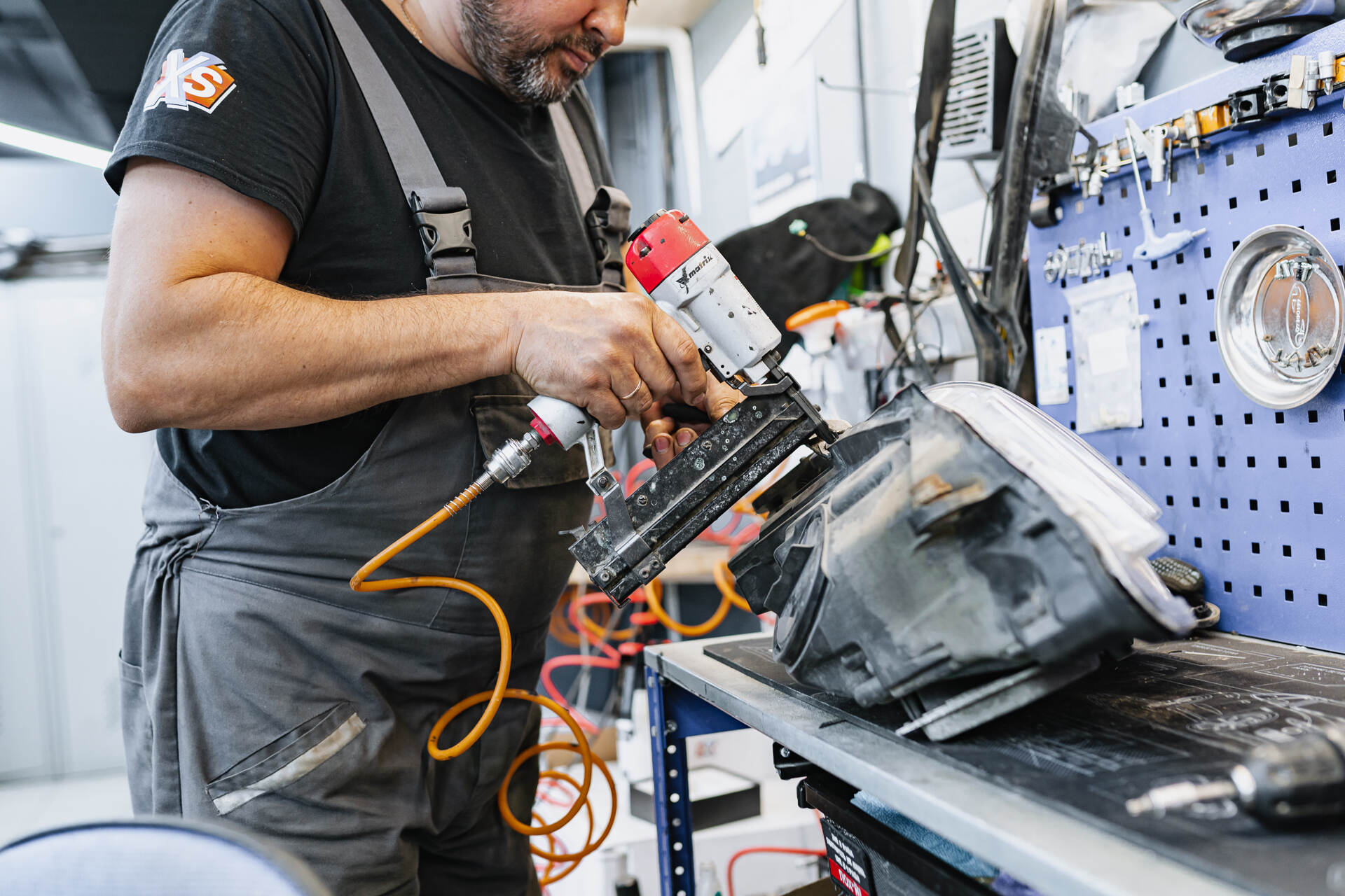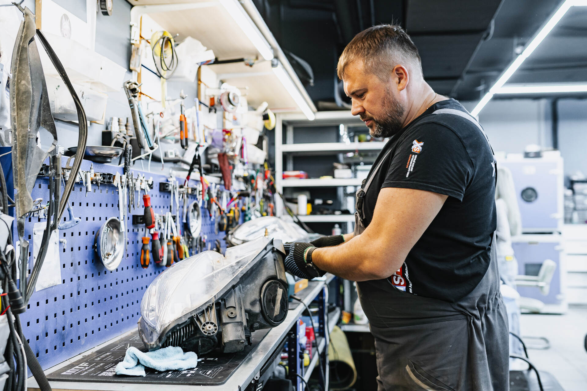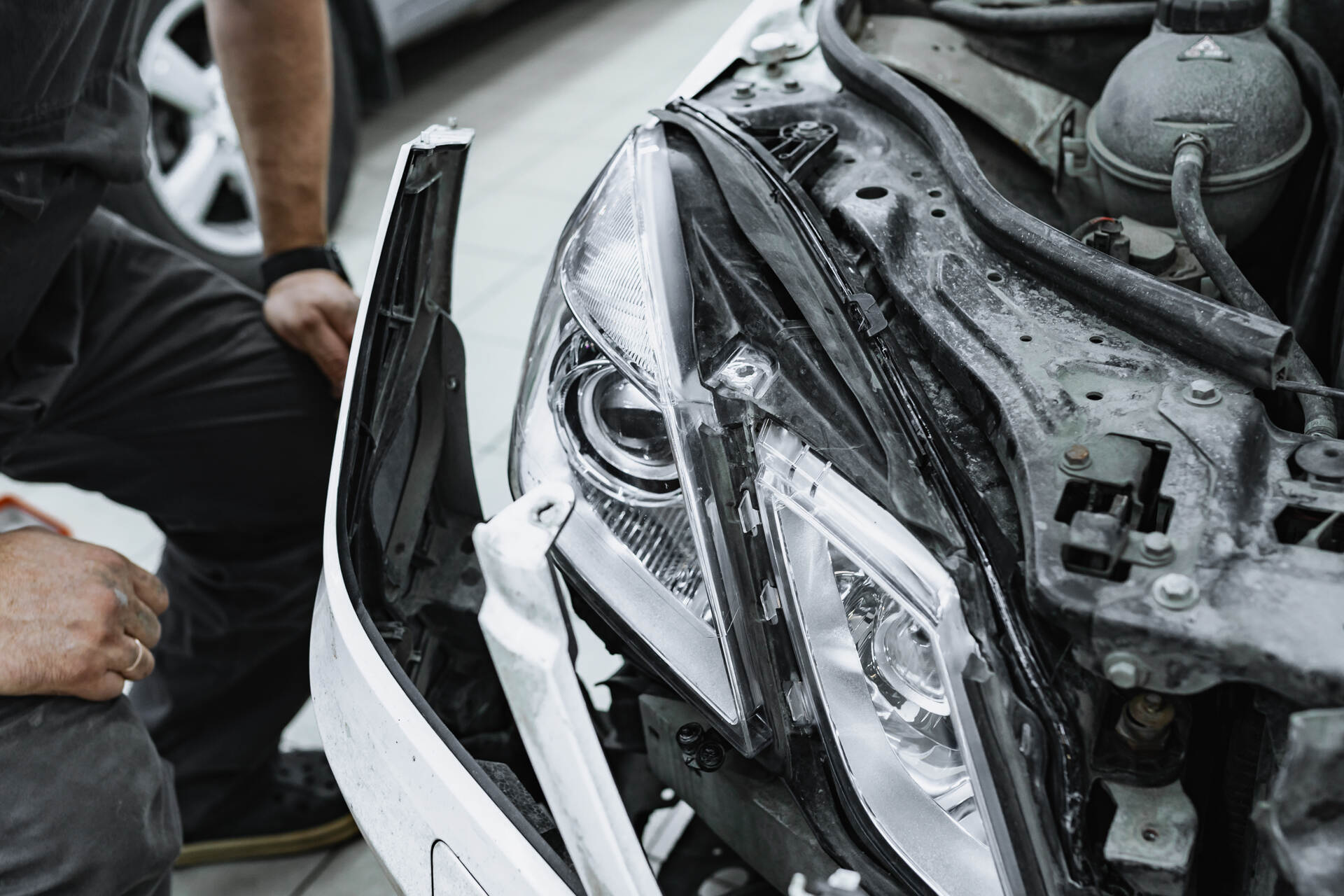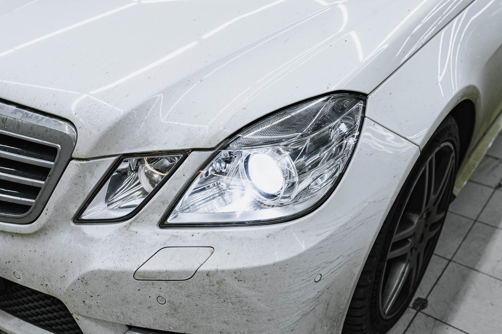 Разбираем фары после демонтажа. Меняем отражатели в линзах.Для замены отражателей линз Мерседес 212 требуется разобрать переднюю часть автомобиля: снимаем бампер, извлекаем фары и отправляем их на разборку. После аккуратного вскрытия и удаления штатного герметика мы извлекаем заводские линзы, заменяем в них отражатели и возвращаем модули на место. Параллельно мы тщательно очищаем внутреннюю поверхность стекол фар щелочным составом, удаляя накопившиеся загрязнения — это позволяет существенно увеличить светопропускание по сравнению с неочищенной оптикой.