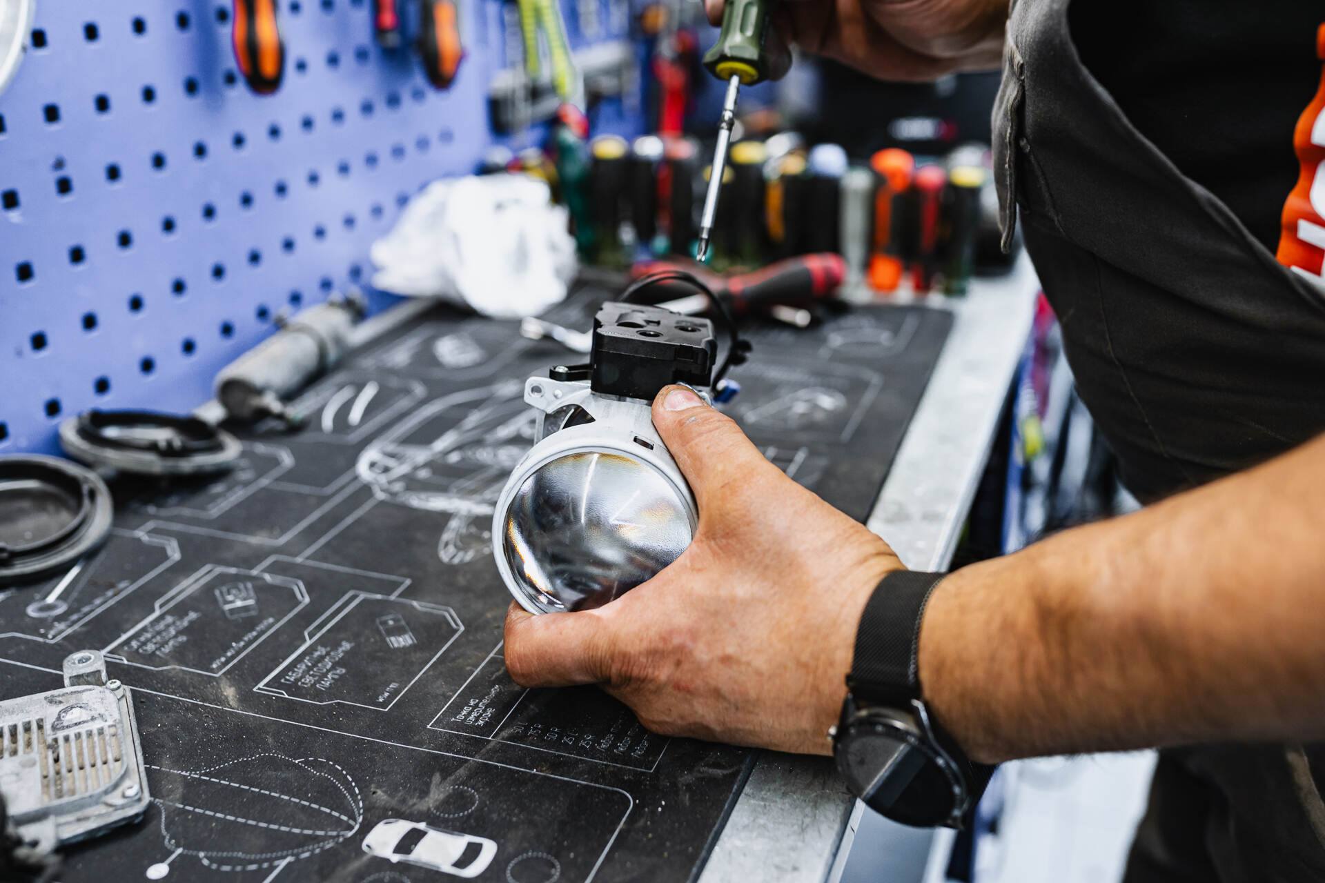 Мы работаем с автосветом каждый день: есть небольшие работы, есть масштабные – иногда это ограничивается простой заменой ламп, а в других случаях требует комплексного переоснащения системы освещения. Именно о таком проекте пойдет речь в данном кейсе с Mercedes-Benz E W212: владелец автомобиля столкнулся с проблемой выгоревшей оптики и хотел найти максимально комфортное решение. Мы руководствуемся простым принципом: свет должен быть одновременно эффективным и эстетичным, поэтому с удовольствием взялись за реализацию нестандартного подхода. Вопреки ожиданиям, мы не станем менять линзы, а произведем замену отражателей в штатных линзовых модулях, что позволит сохранить функцию адаптивного головного света. Безусловно, установка новых линз в адаптивные фары технически возможна, и мы имеем большой опыт таких работ, однако некоторые клиенты принципиально не желают отказываться от системы адаптивной регулировки света.