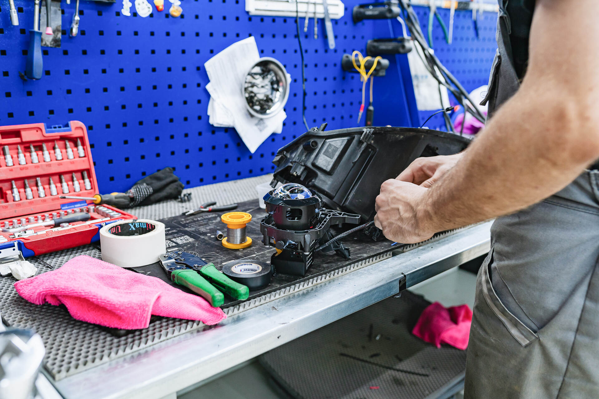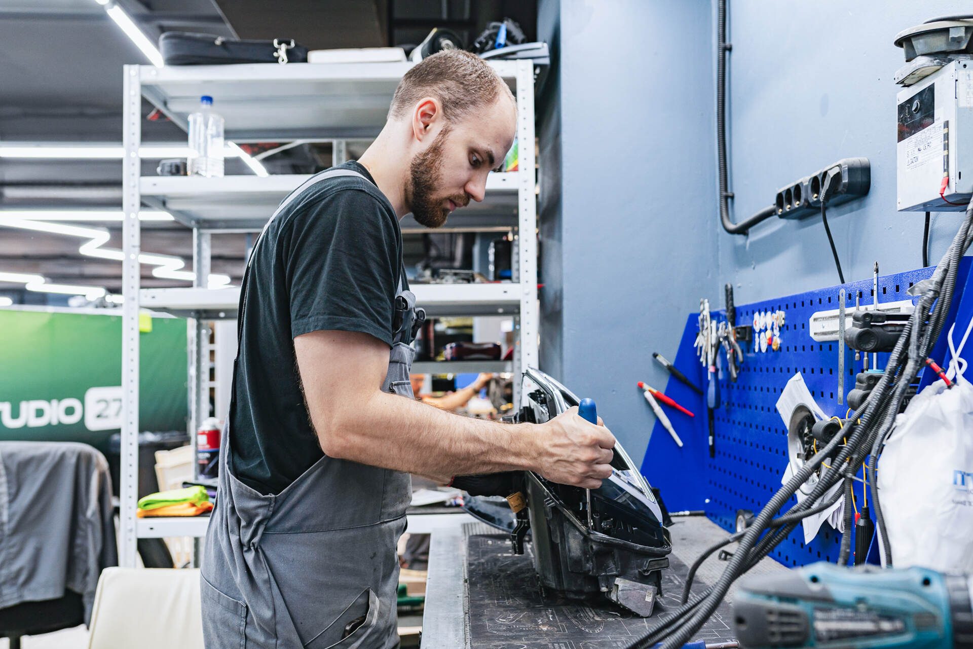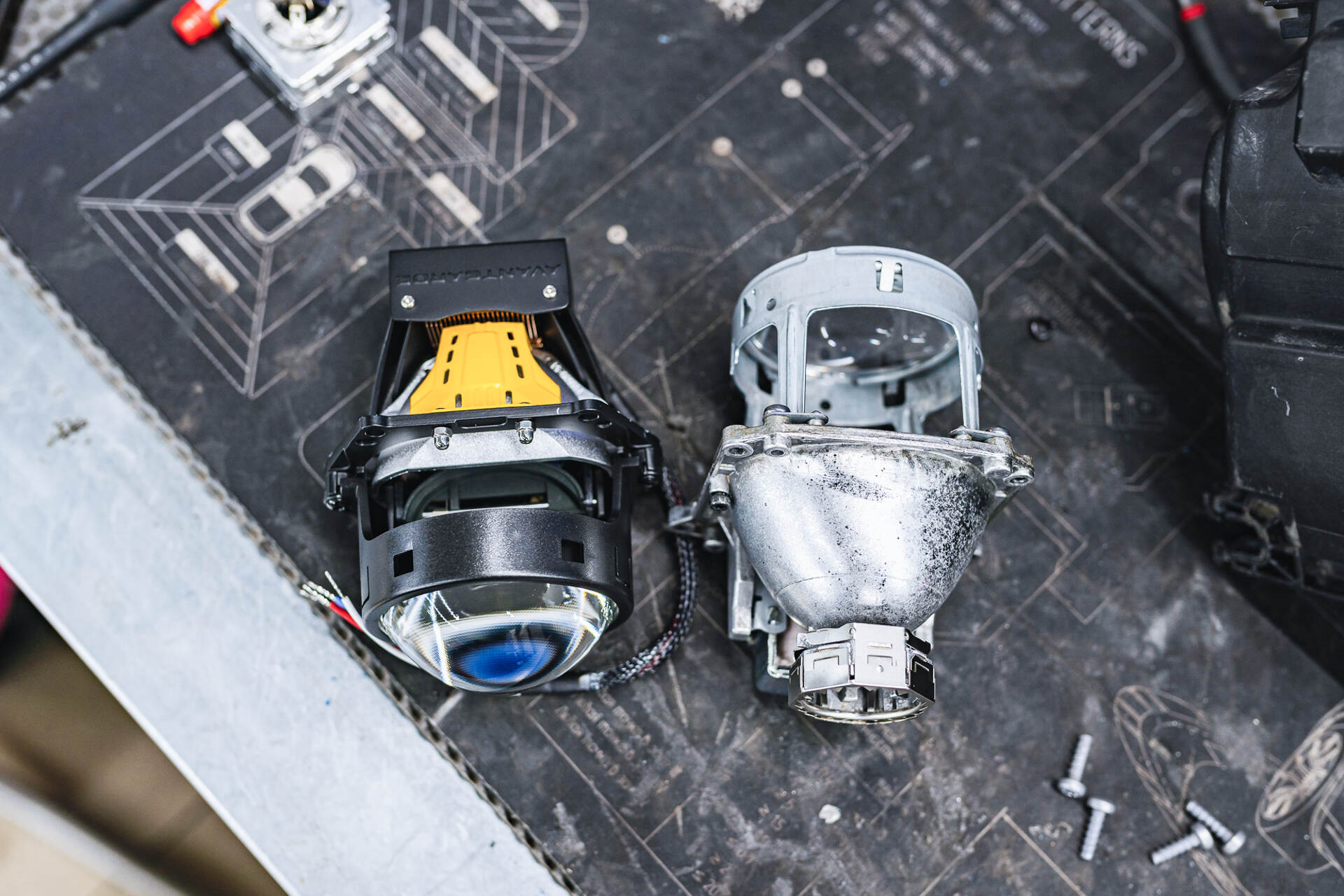 Дефектуем и разбираем фары. Установка новых линз в фары, а также сборка автомобиля.Замена линз на Audi A5 (2016) занимает полные сутки – это связано с особенностью конструкции фар: производитель использовал на заводе стекольный герметик вместо термопластичного, что исключает возможность стандартной разборки в промышленной печи и формально делает фары неразборными. Однако наши специалисты разработали эффективную методику вскрытия таких фар с сохранением стекол: процедура требует ювелирной точности и занимает около четырех часов на каждую фару. После аккуратной разборки мы извлекаем отработавшие ксеноновые линзы и монтируем светодиодные линзы Vision Avantgarde через специальные переходные рамки.