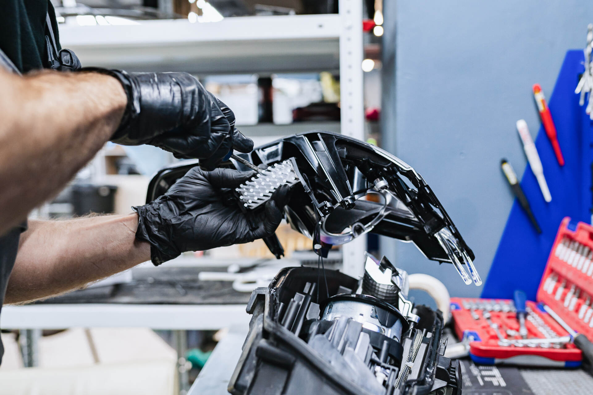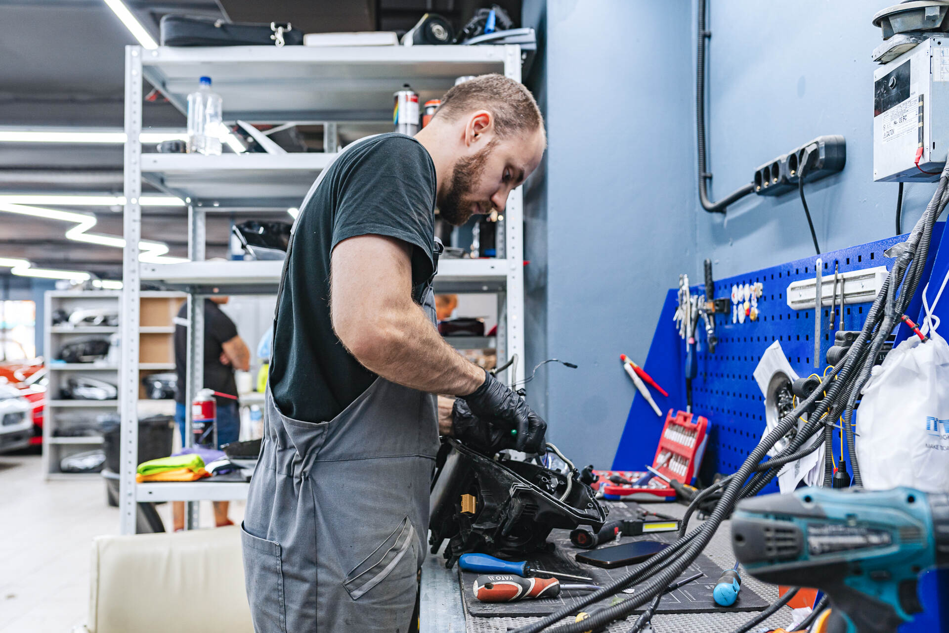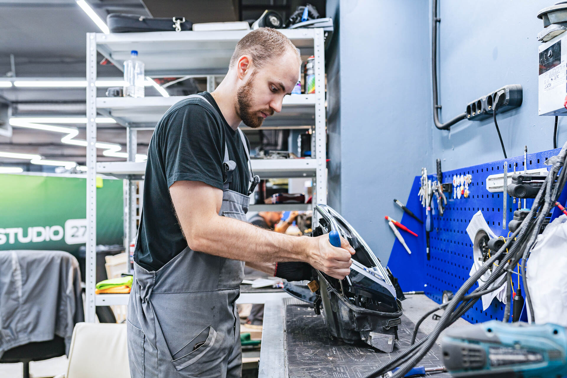 Дефектуем и разбираем фары. Установка новых линз в фары, а также сборка автомобиля.Замена линз на Audi A5 (2016) занимает полные сутки – это связано с особенностью конструкции фар: производитель использовал на заводе стекольный герметик вместо термопластичного, что исключает возможность стандартной разборки в промышленной печи и формально делает фары неразборными. Однако наши специалисты разработали эффективную методику вскрытия таких фар с сохранением стекол: процедура требует ювелирной точности и занимает около четырех часов на каждую фару. После аккуратной разборки мы извлекаем отработавшие ксеноновые линзы и монтируем светодиодные линзы Vision Avantgarde через специальные переходные рамки.