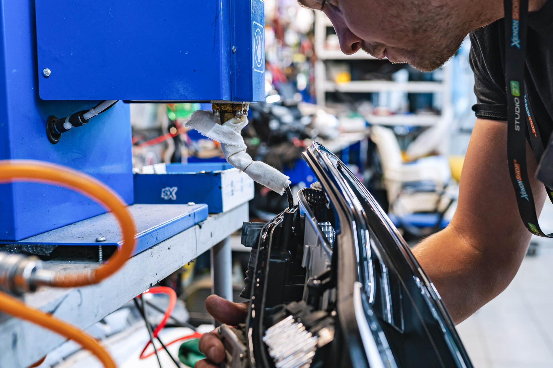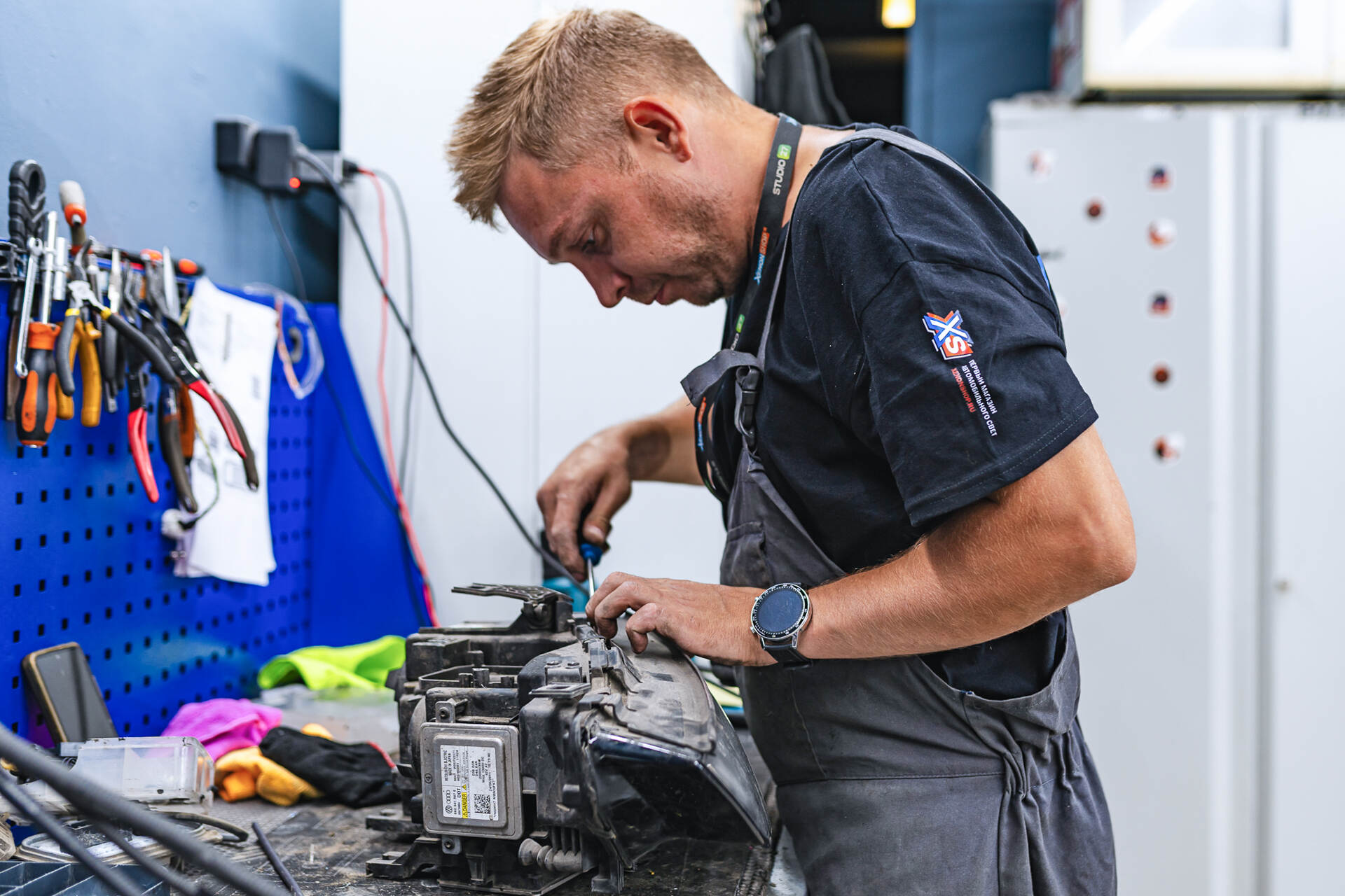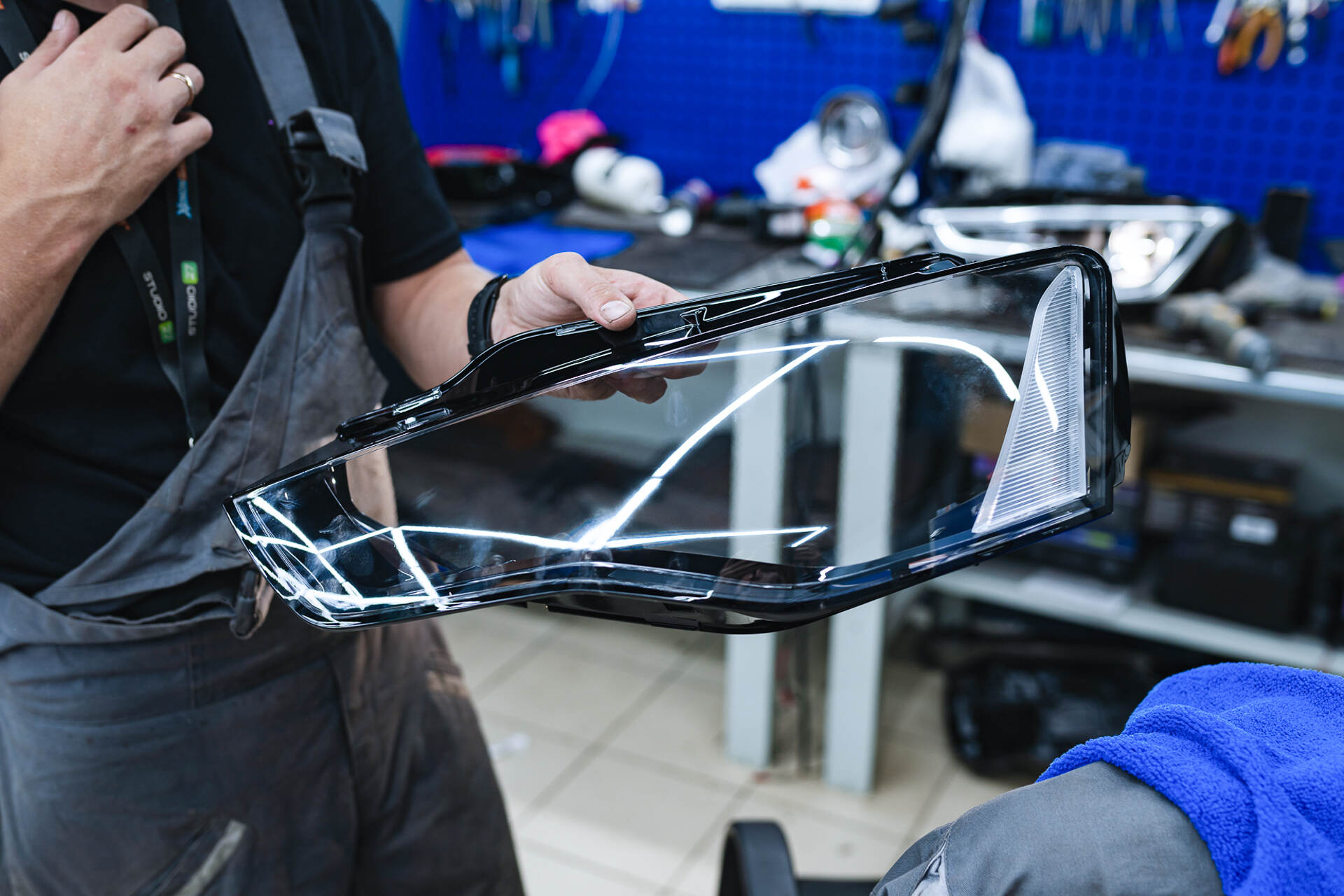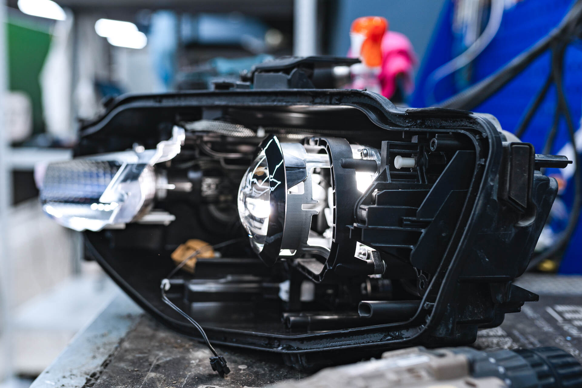 Демонтаж повреждённой фары и её разбор.Устранение запотевания фары Audi A5 начинается с демонтажа: сначала сняли бампер, а затем извлекли саму фару. В принципе, на этом месте мы уже поняли причину запотевания – довольно глубокие трещины на стекле фары, возможно, от прилетевшей щебёнки, с самим корпусом фары всё было в порядке. Следующим этапом стала разборка фары, так как фара с завода собрана на базе стекольного герметика, то работа занимает больше времени, чем если бы на стандартном бутиловом (температурном). После аккуратной разборки мы полностью очистили пазы корпуса от остатков старого герметика и собрали фару с уже новым стеклом. В ходе работ выяснилось, что блок розжига не нуждается в замене — в конкретном случае обошлось без лишних трат.