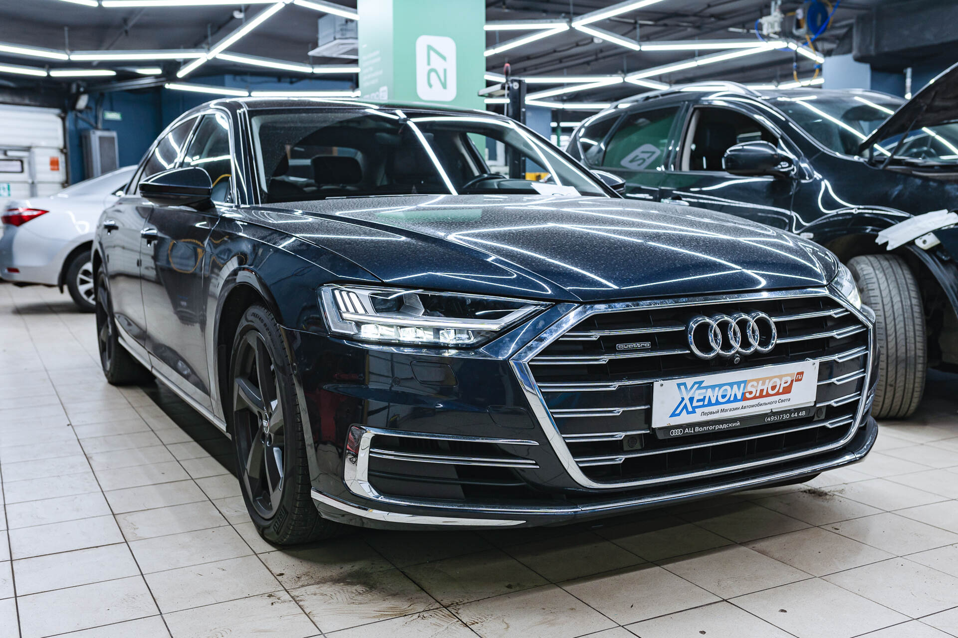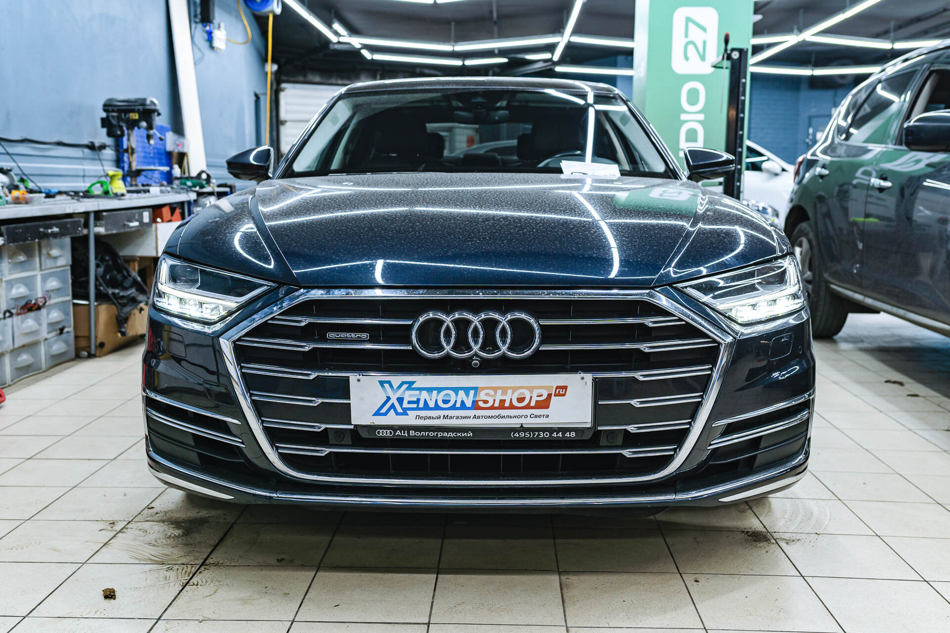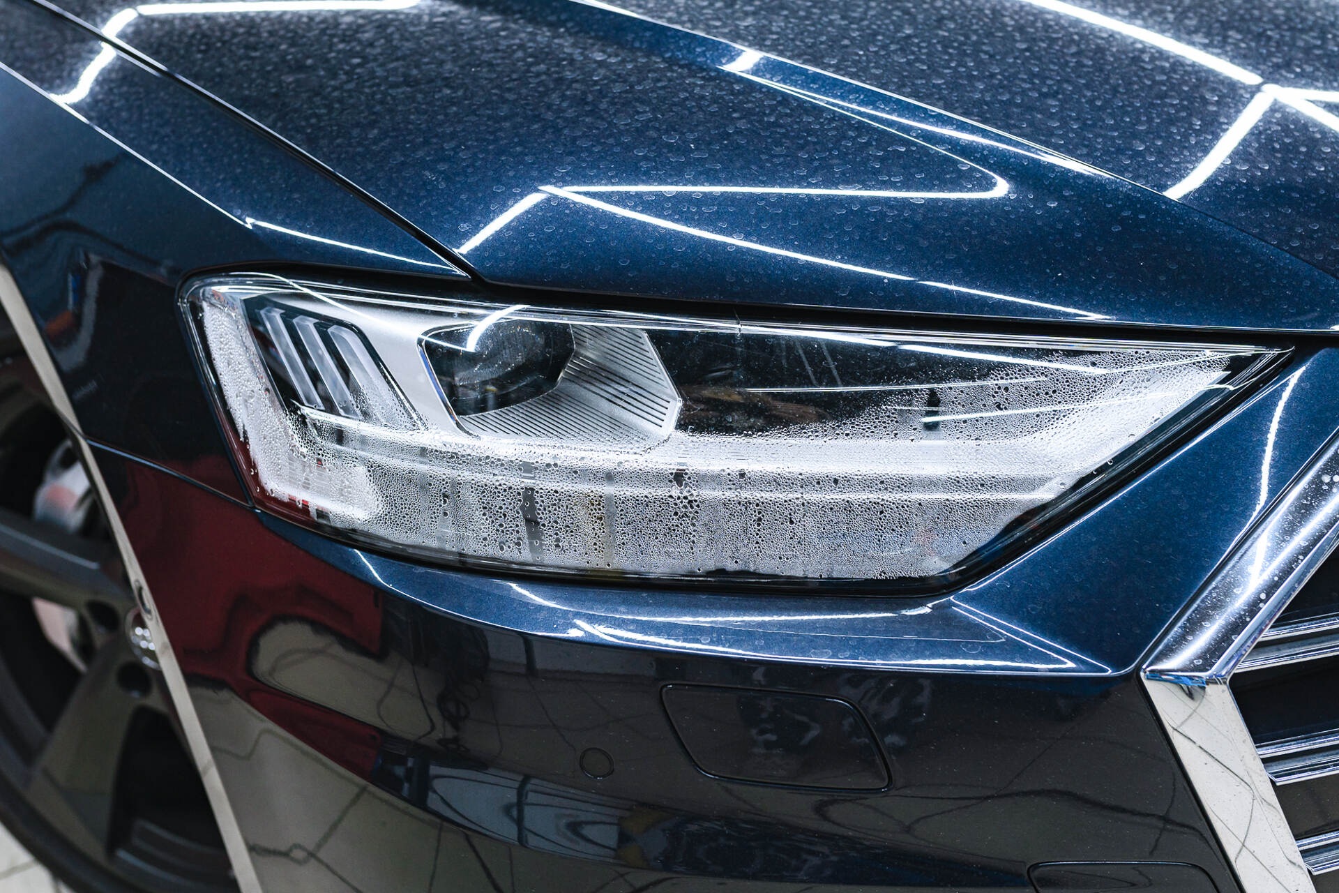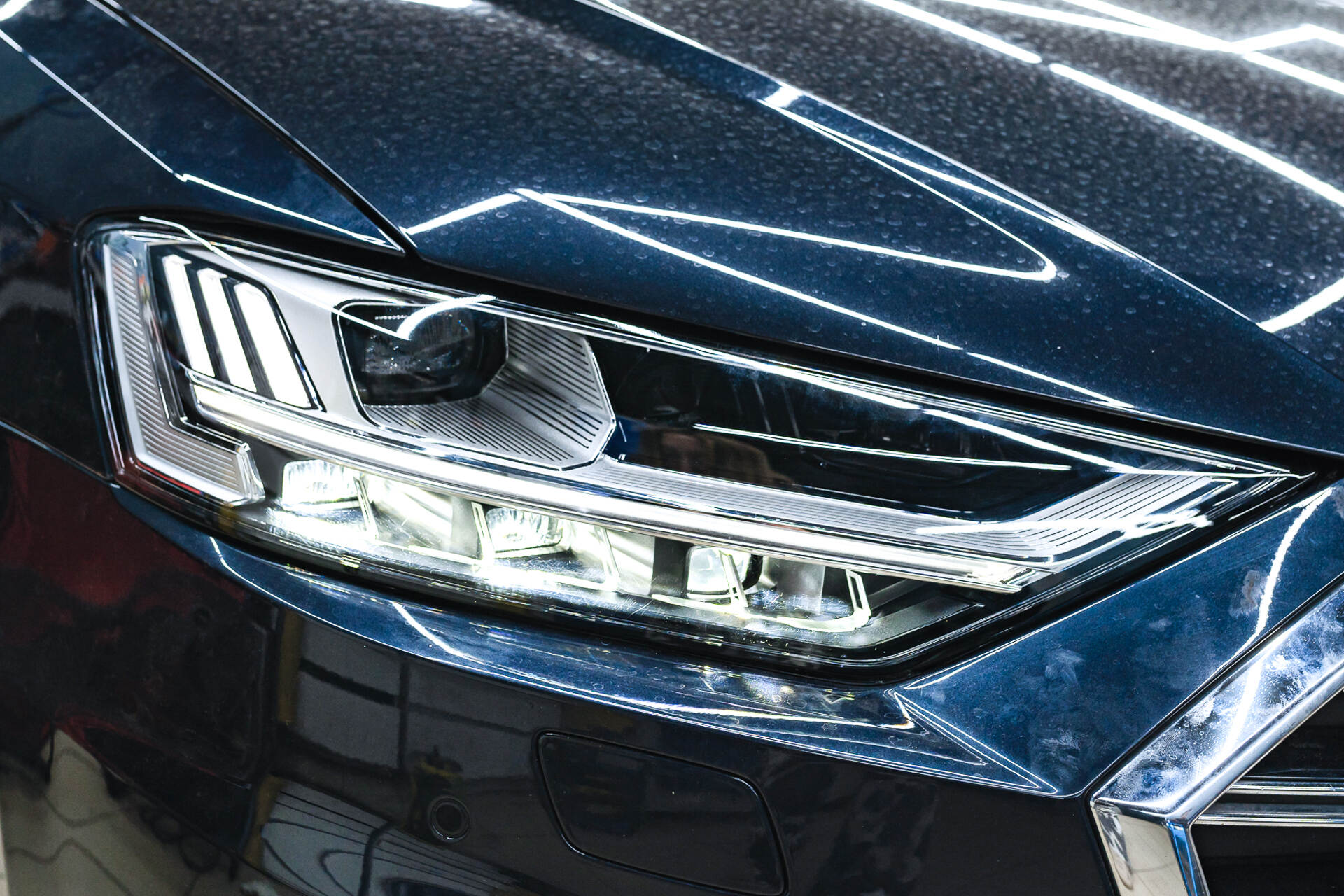 Герметизируем фару новым стеклом и собираем автомобиль.На выполненную работу по устранению запотевания фары Audi A8 с заменой стекла предоставляется годовая гарантия: за это время автомобиль проездит по всем сезонам года с разной температурой и влажностью, следовательно, если фара не начнёт запотевать, то и не будет в будущем. Впрочем, практика по рекламациям от наших клиентов показывает, что в большинстве случаев никаких проблем с отремонтированным автосветом не возникает. Внешне же отремонтированная правая фара не отличается от старой левой, но, конечно, при сильном внешнем различии можно привести их к единому виду, отполировав стекло на второй фаре, которую мы не ремонтировали.