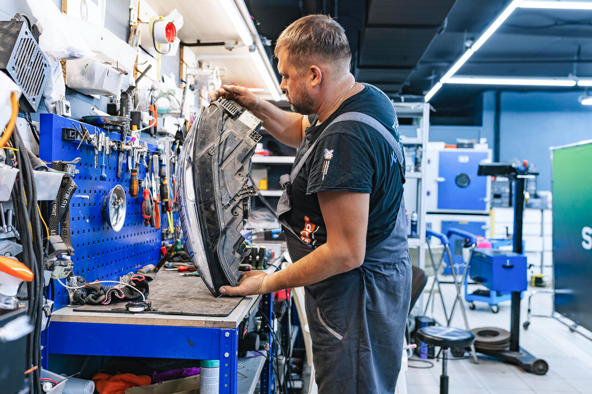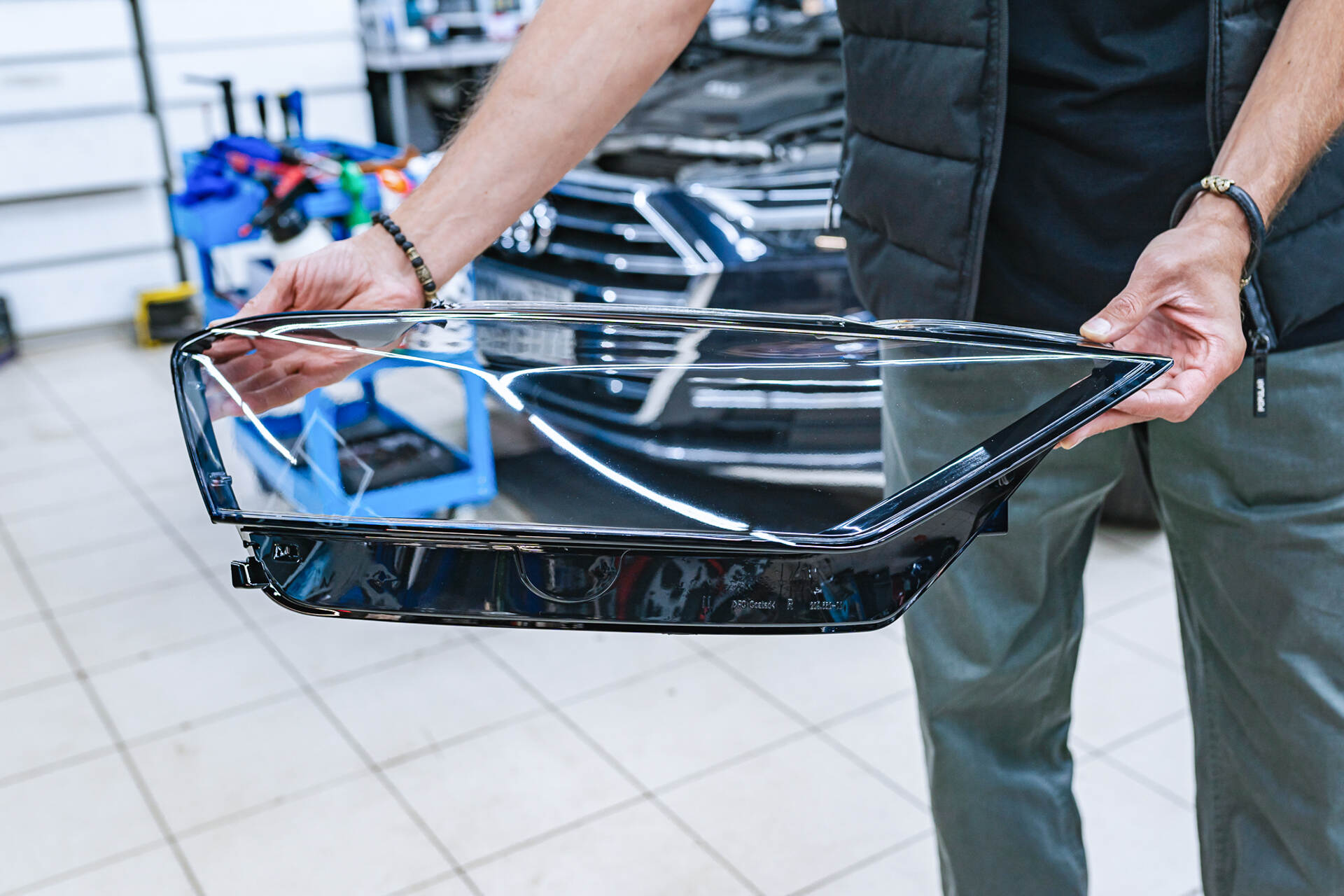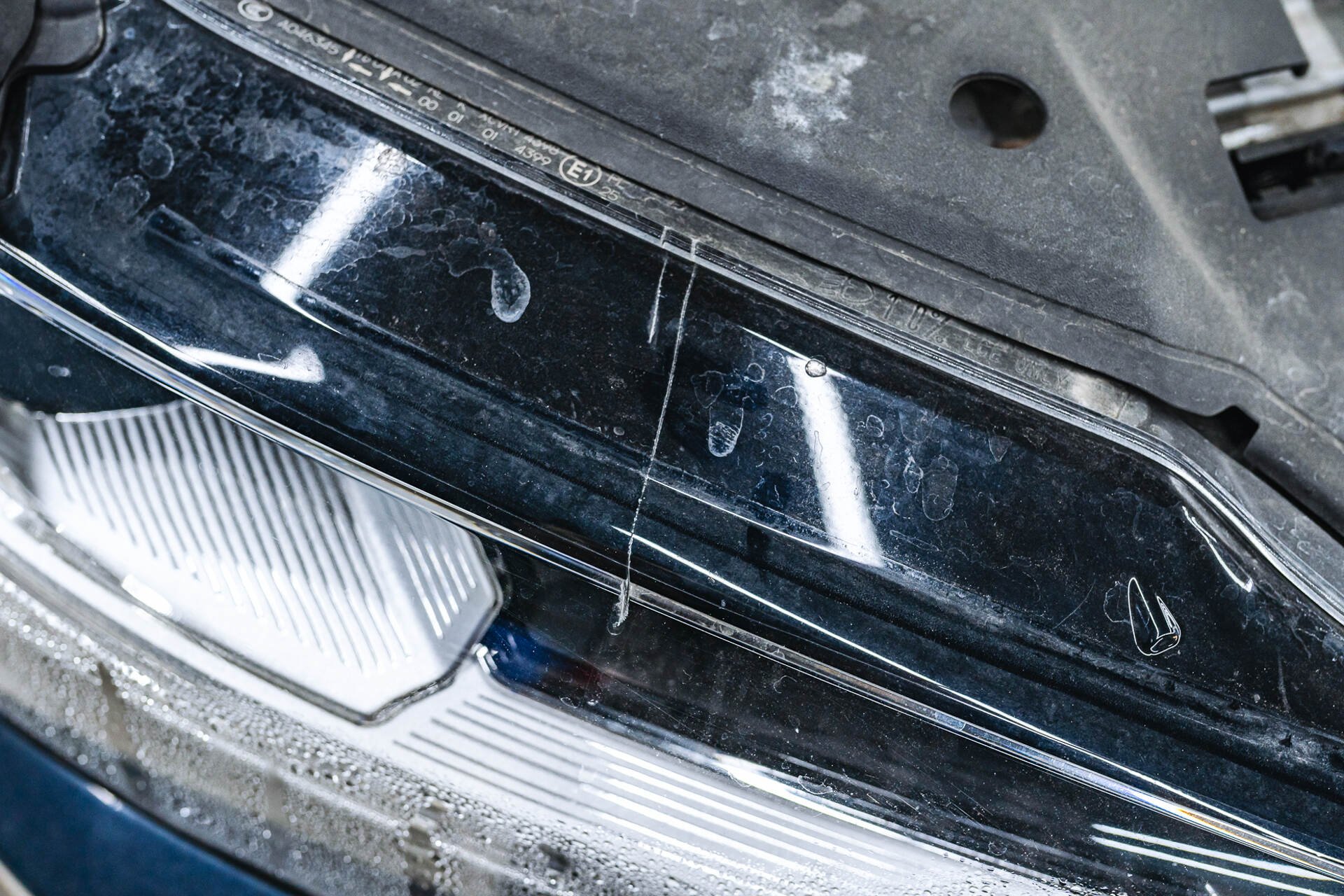 Состояние фары и вид автомобиля в момент обращения.Суть в том, что нередко даже незначительное внешнее воздействие — будь то легкий удар, наезд на дорожную неровность или попадание щебенки в стекло — может нарушить герметичность фары. Когда стекло остается целым, обычно достаточно разобрать фару и выполнить перегерметизацию, поскольку разгерметизация чаще происходит по слою заводского герметика. Если же повреждению подвергся корпус фары, при небольших дефектах его запаивают или полностью заменяют. Такой же подход применяется к стеклам: при возможности восстановления используем герметик, в противном случае выполняем полную замену стекла фары, что и выполним в этот раз.