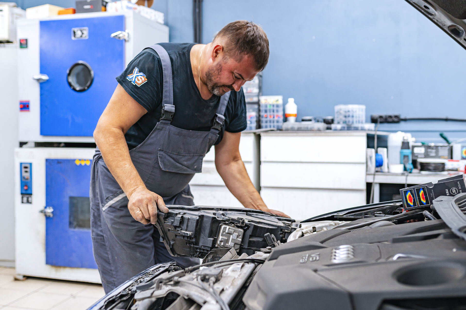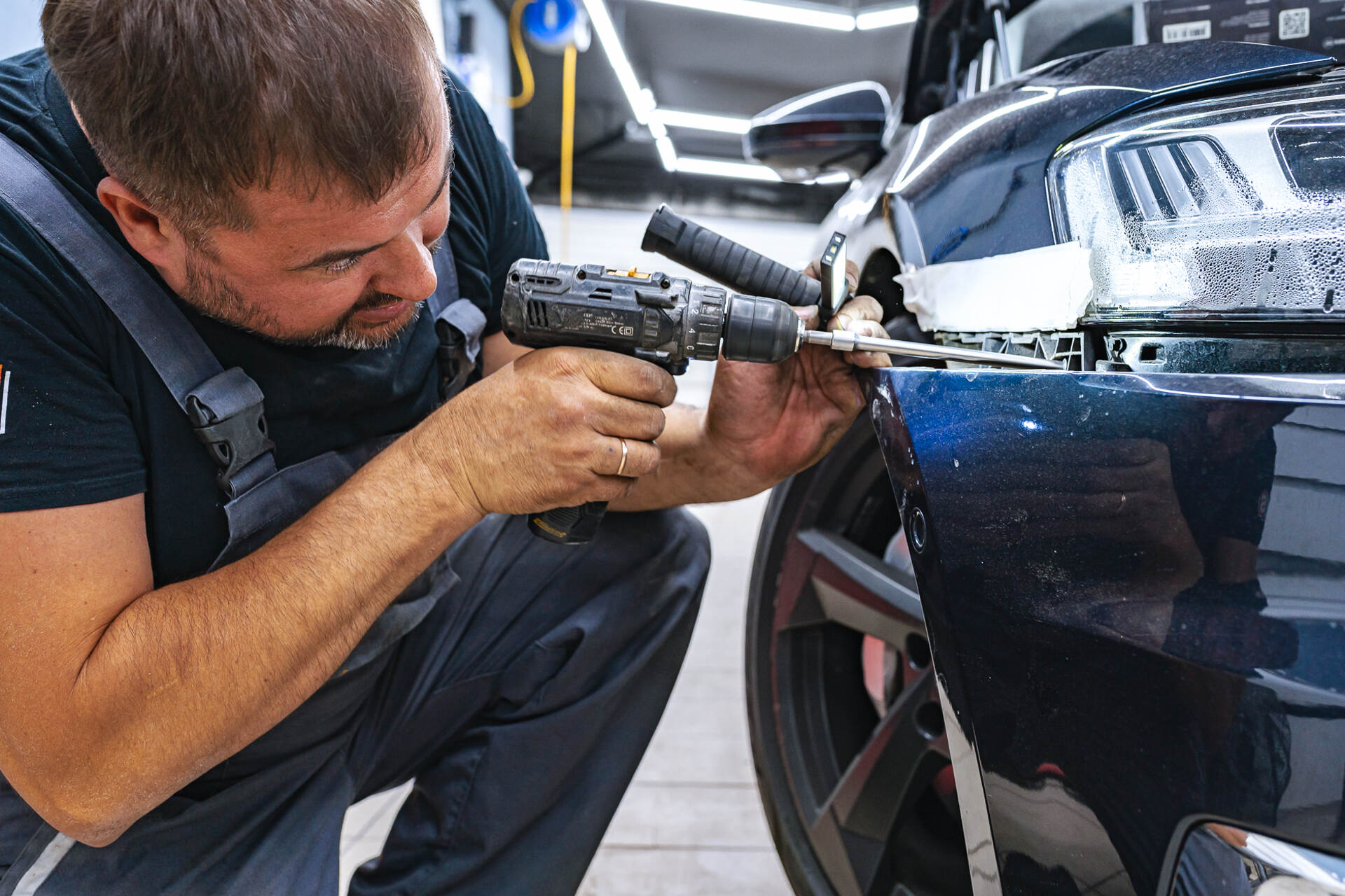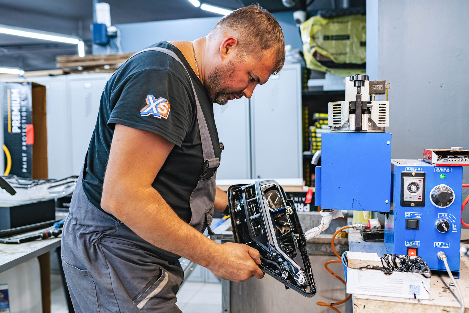 Состояние фары и вид автомобиля в момент обращения.Суть в том, что нередко даже незначительное внешнее воздействие — будь то легкий удар, наезд на дорожную неровность или попадание щебенки в стекло — может нарушить герметичность фары. Когда стекло остается целым, обычно достаточно разобрать фару и выполнить перегерметизацию, поскольку разгерметизация чаще происходит по слою заводского герметика. Если же повреждению подвергся корпус фары, при небольших дефектах его запаивают или полностью заменяют. Такой же подход применяется к стеклам: при возможности восстановления используем герметик, в противном случае выполняем полную замену стекла фары, что и выполним в этот раз.
