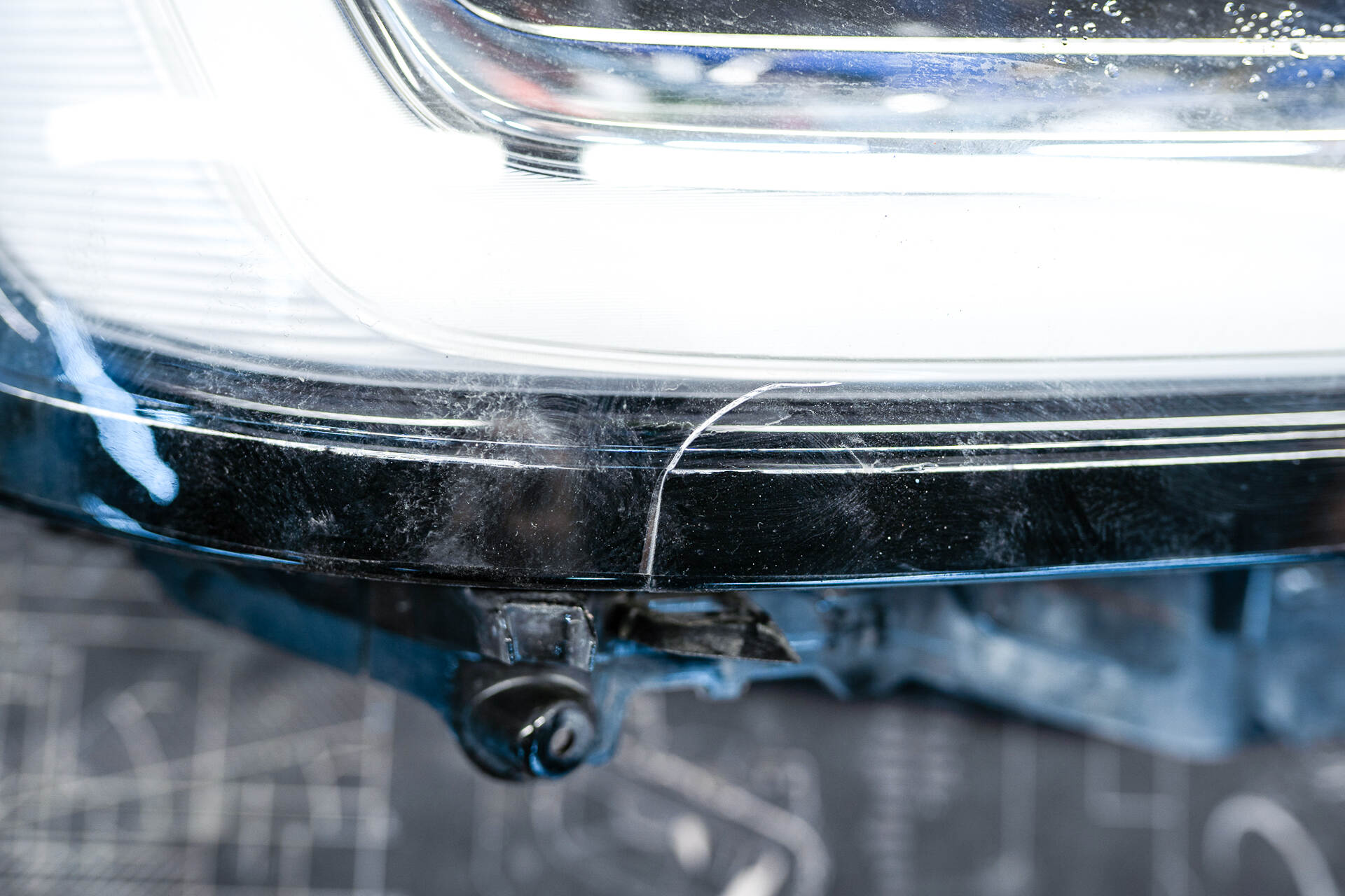 Демонстрация трещины на стекле уже демонтированной фаре.В нашем магазине есть в наличии стёкла для фар всех распространенных и редких моделей автомобилей: если нужного стекла нет в наличии — например, для эксклюзивной марки — мы организуем ее поставку под заказ. При любом повреждении стекла, будь то трещина от удара или скол от камня, рекомендуем сразу обратиться к нам для диагностики и замены. В некоторых случаях, когда трещина расположена у основания, возможно временное решение с герметизацией. Однако в данной ситуации этот метод не применим, поскольку трещина выходит за рамки посадочного места.