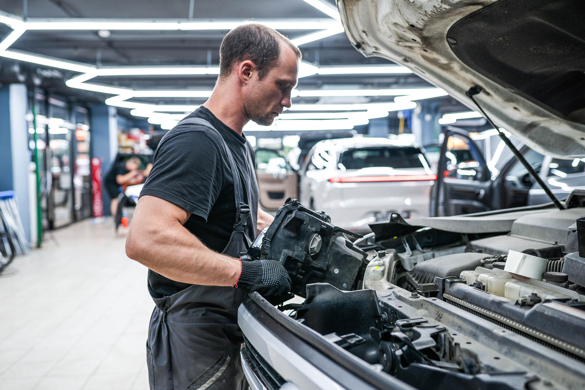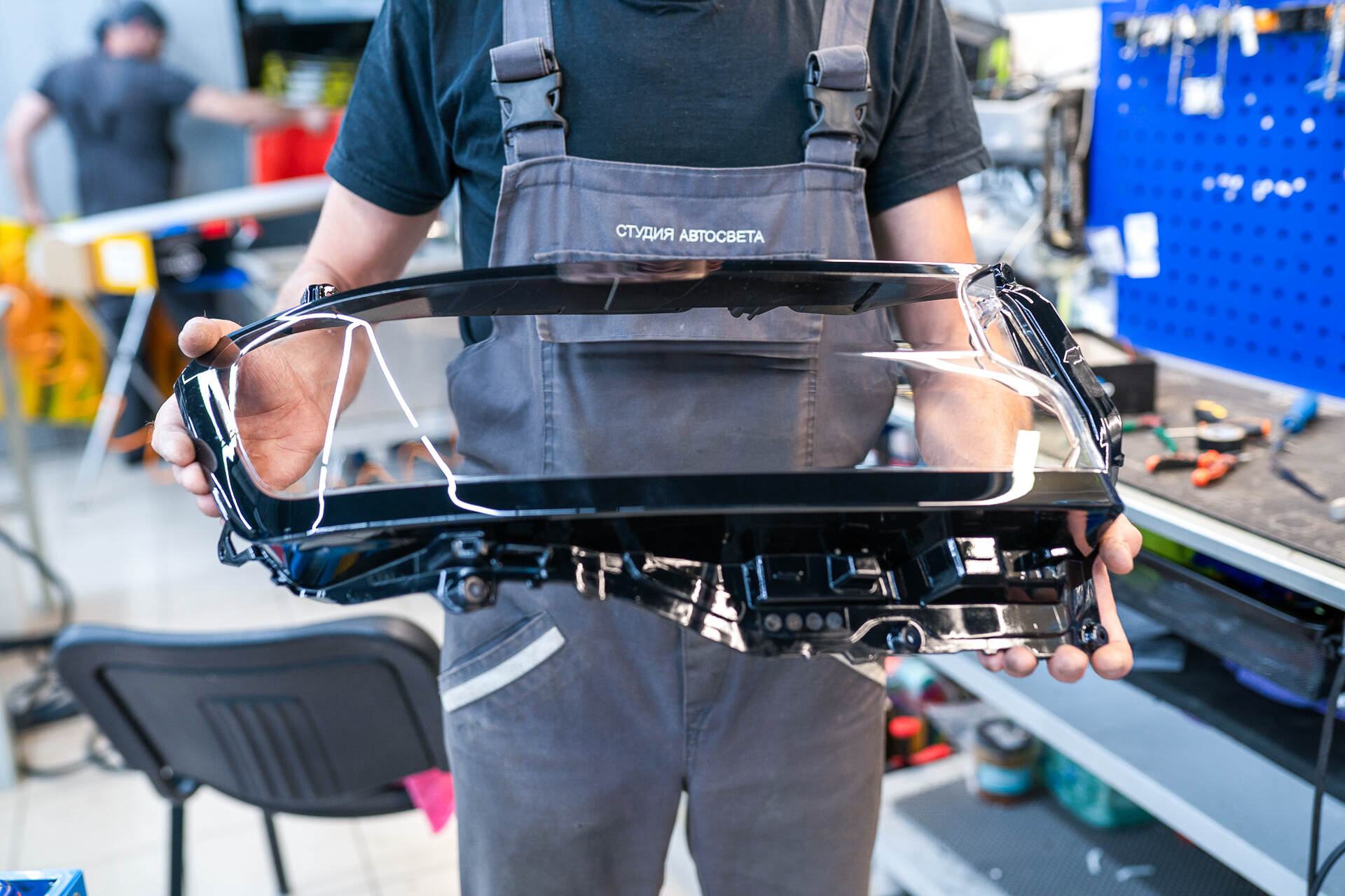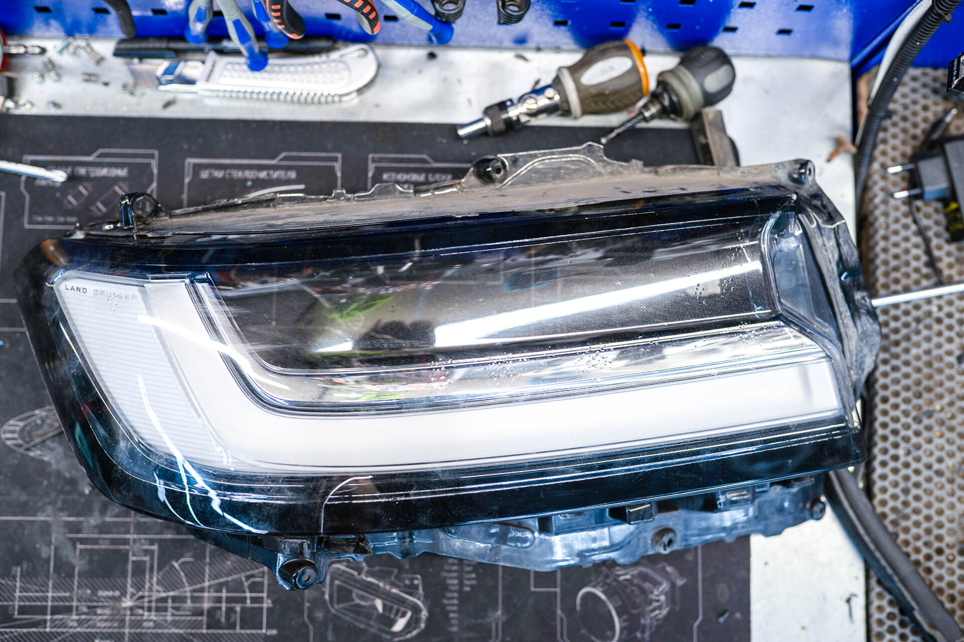 Наш автосервис предлагает полный комплекс услуг по автомобильному свету, в том числе восстановление фар после ДТП или незначительных столкновений. В данном случае мы заменим треснувшее стекло правой фары на автомобиле Toyota Land Cruiser 300. Как правило, такие серьезные повреждения возникают после дорожных инцидентов, и устранять их необходимо незамедлительно. Суть в том, что через образовавшиеся трещины или сколы внутрь фары начинают проникать пыль, грязь и влага, что в перспективе приведет к полному отказу блока розжига головного света. Кроме того, поврежденное запотевшее стекло критически ухудшает качество освещения, создавая реальную угрозу безопасности движения – эксплуатировать автомобиль в таком состоянии категорически не рекомендуется, и нужно принимать меры.
