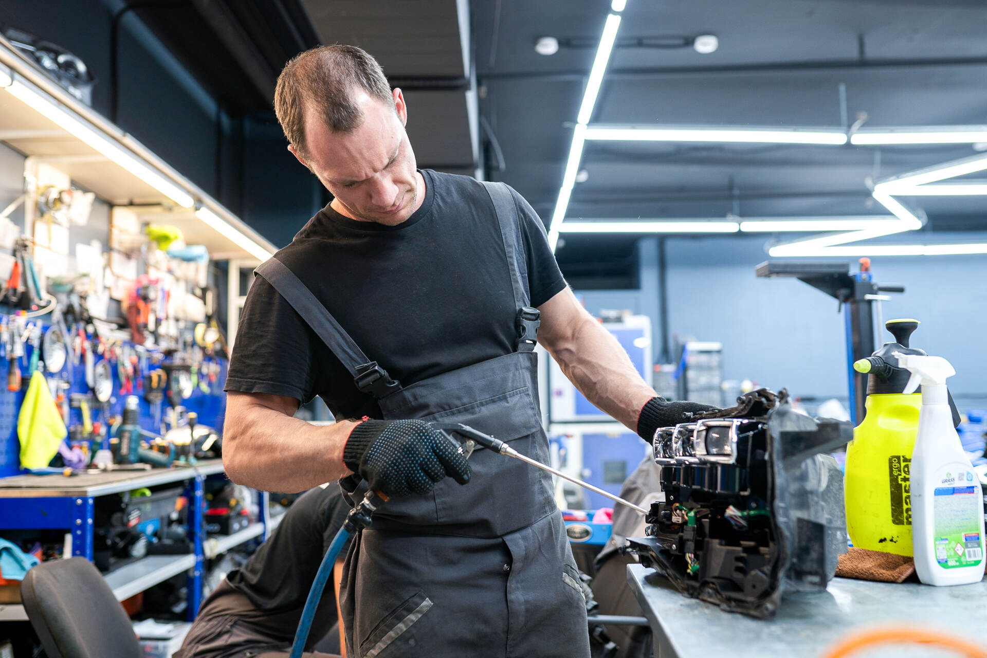 Дефектуем запотевшую фару. Герметизируем фару новым стеклом и собираем автомобиль.Замена стекла Тойота Ленд Крузер 300 начинается с разборки передней части автомобиля. Первым делом скидываем бампер, затем демонтируем поврежденную фару и аккуратно удаляем сломанное стекло. После удаления стекла отчищаем пазы корпуса фары от старого герметика и на его место наносим новый. После удаления стекла мы провели тщательную проверку корпуса правой фары на наличие микротрещин и сколов, мало ли, где еще могла быть трещина. На следующем этапе мы выполнили герметизацию фары с новым стеклом, а после полного высыхания герметика фара была установлена на штатное место. Завершающим этапом стала точная регулировка обеих фар, обеспечивающая формирование правильной светотеневой границы без ослепляющей встречных водителей паразитной засветки.